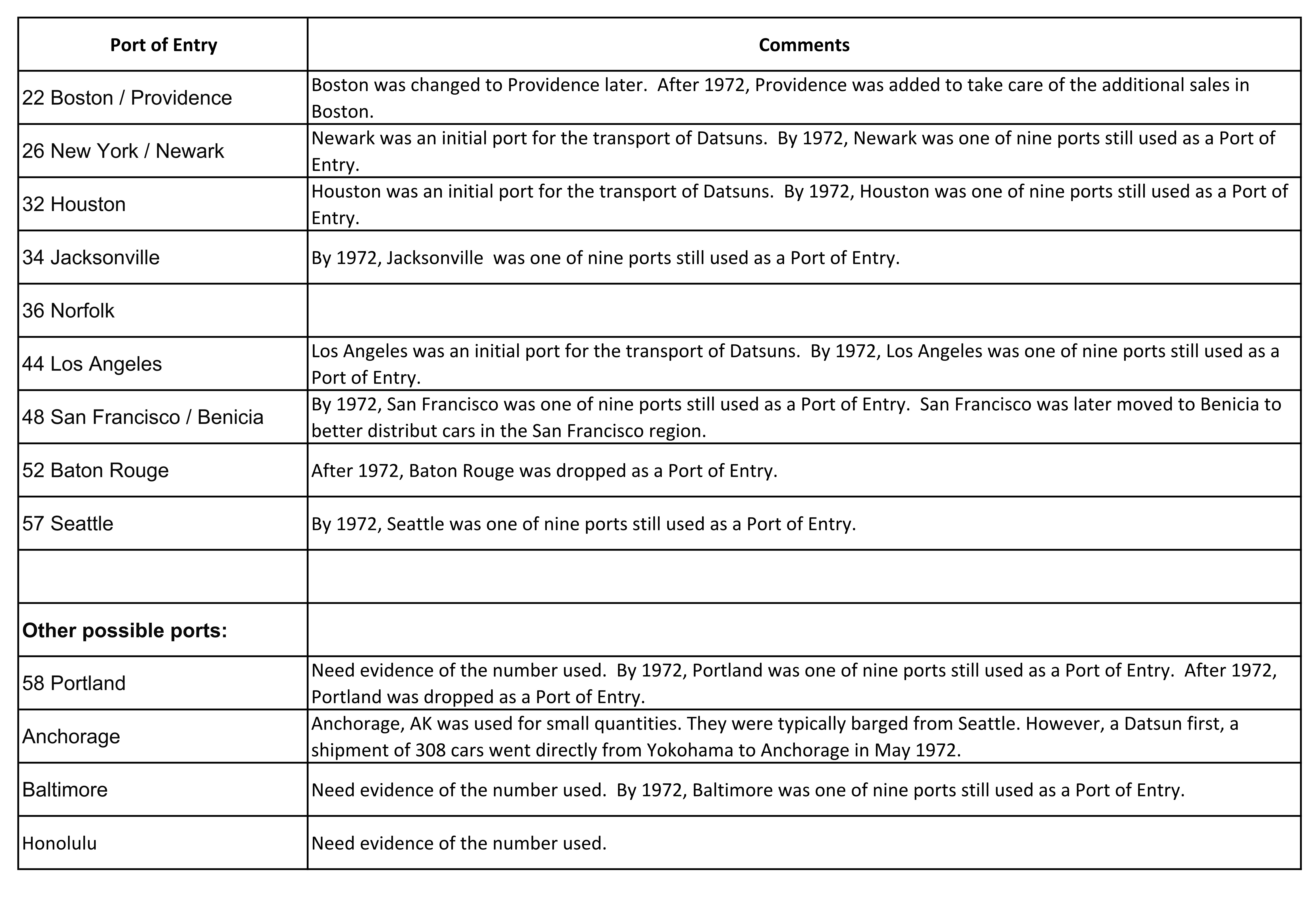 Datsun 240Zs at the dealership had a window sticker that listed the standard and optional features on each car. In the upper right corner of this sticker is listed the port of entry for the car. Sometimes it listed a number. Sometimes it listed a port. And sometimes it listed both. If you have the original window sticker for your 240Z and it only has a number, the following chart will help you determine which port that number represents. It has the currently proven number that corresponds to to a port.