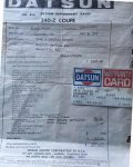 Vehicle History: Purchased the car from A-1 Motors, Chambersburg, PA. Delivery was made on October 27,1970, cost $3,725.00. I drove the car daily for seven years, logged 110,000 miles, sold it locally to an individual that put approximately 6,000 miles on the car in 42 years. The car was garage kept and never saw rain or snow. I re-purchased the car in July 2019, since that time I have tried to maintain its originality, replaced fluids, hoses, weather stripping, bushings, other rubber products, rebuilt master cylinder. Car shows with EMPI wheels as was pictured on the Road & Track feature story on the Datsun Z, dated April 1970.
