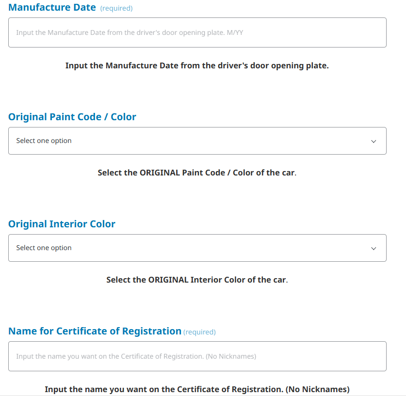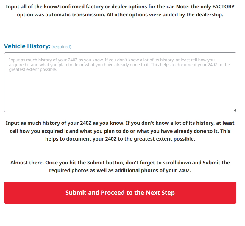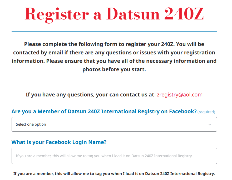 By submitting your information, you agree to receiving a confirmation email to the address provided and having your registration information and photos posted on zregistry.org (Excluding Name Information) as well as on Datsun 240Z International Registry on Facebook. Datsun 240Z International Registry is a PRIVATE group on Facebook.