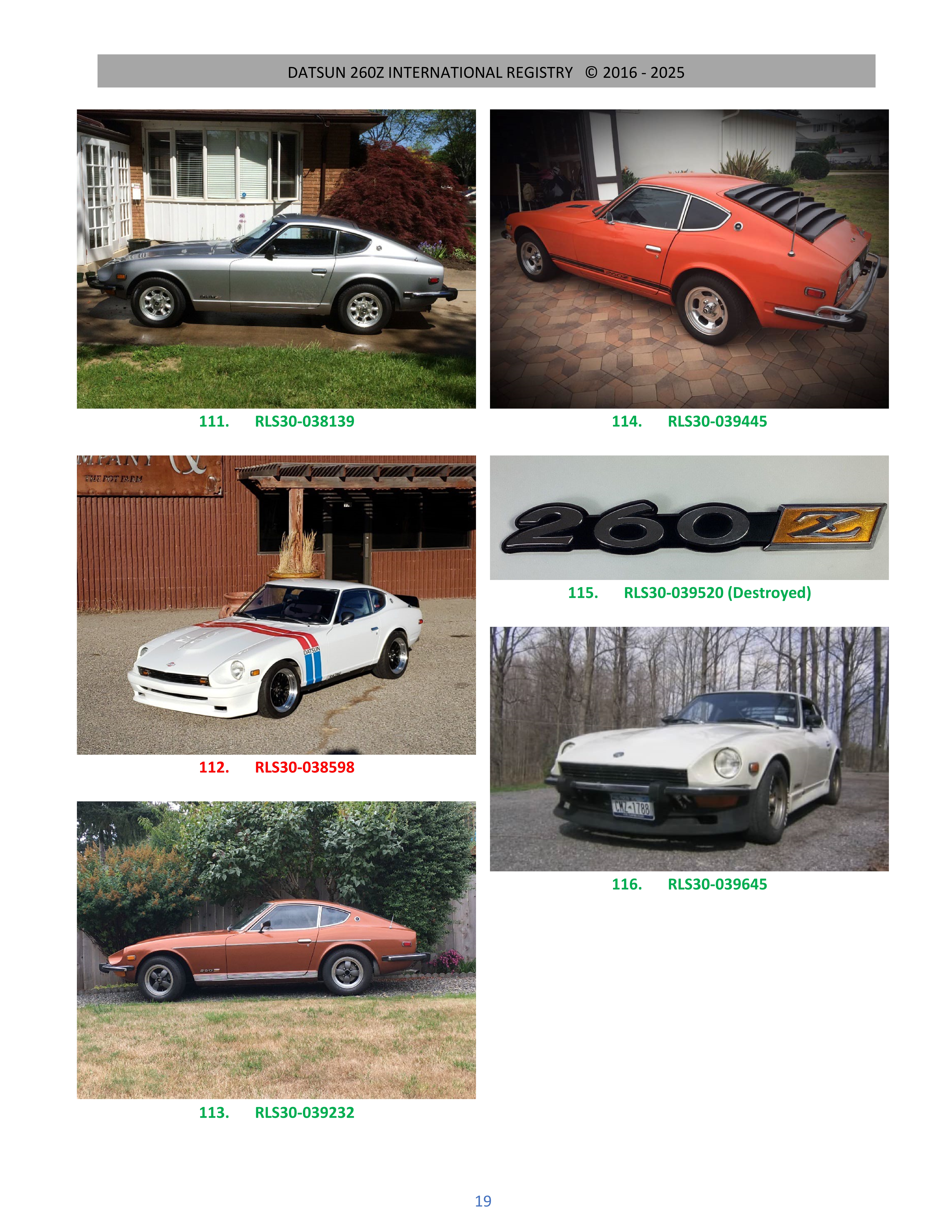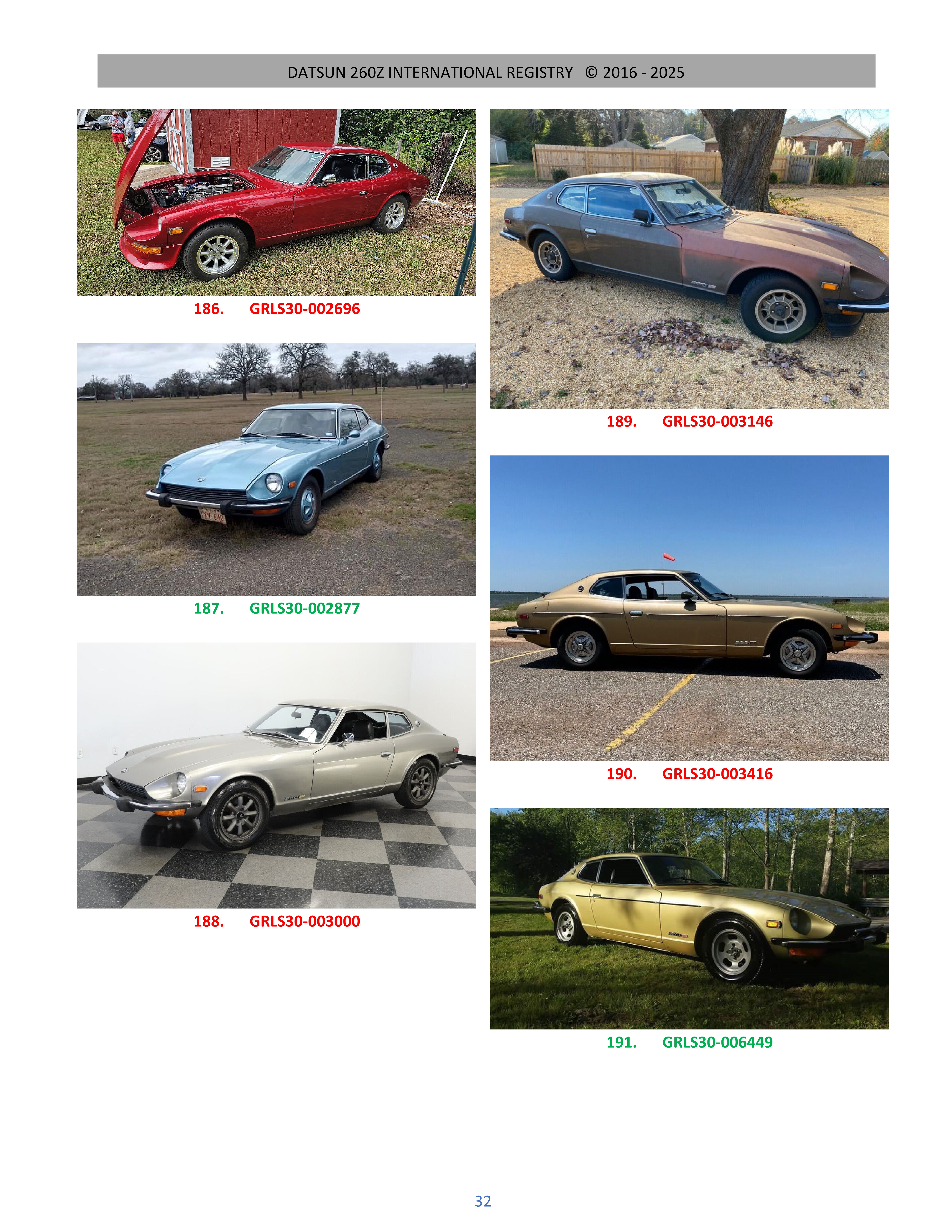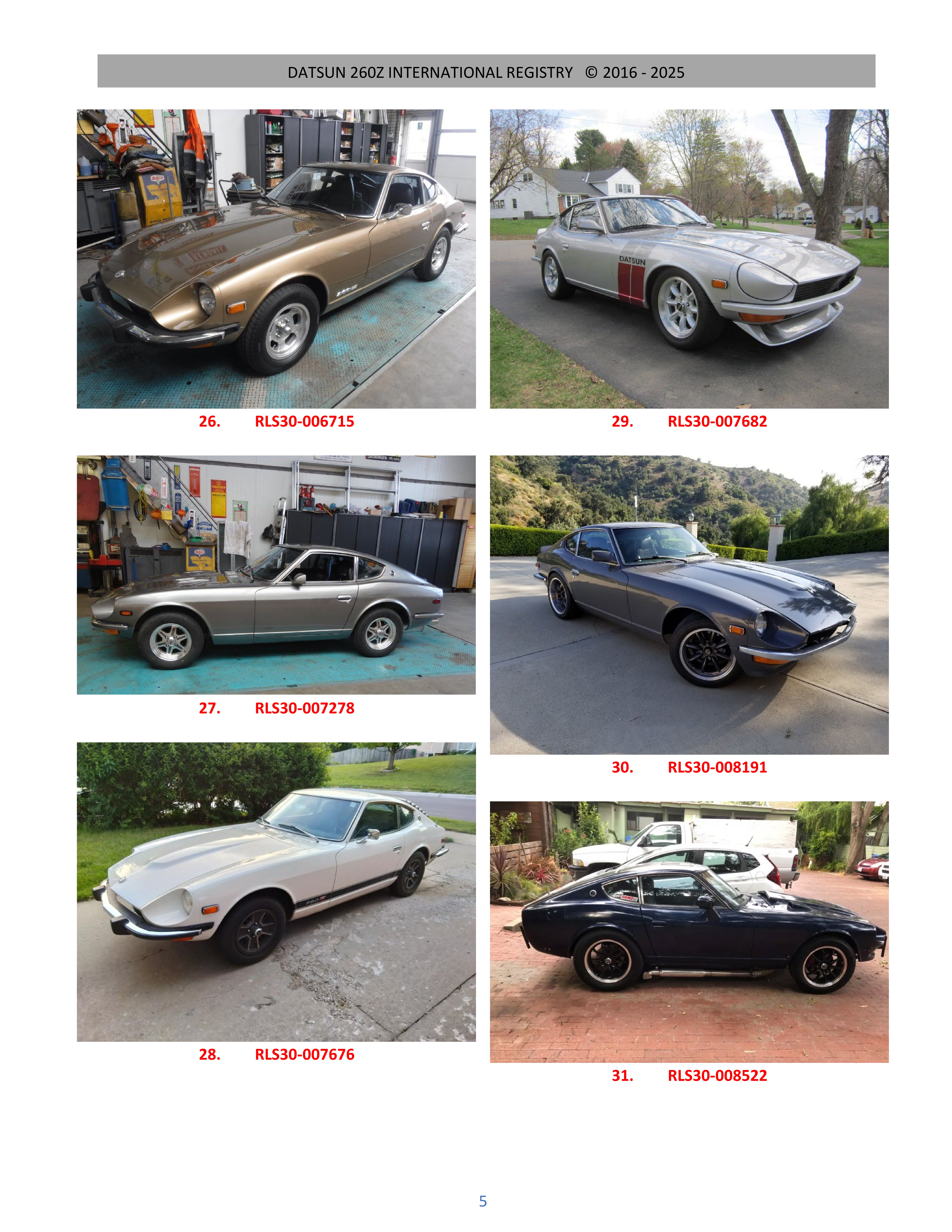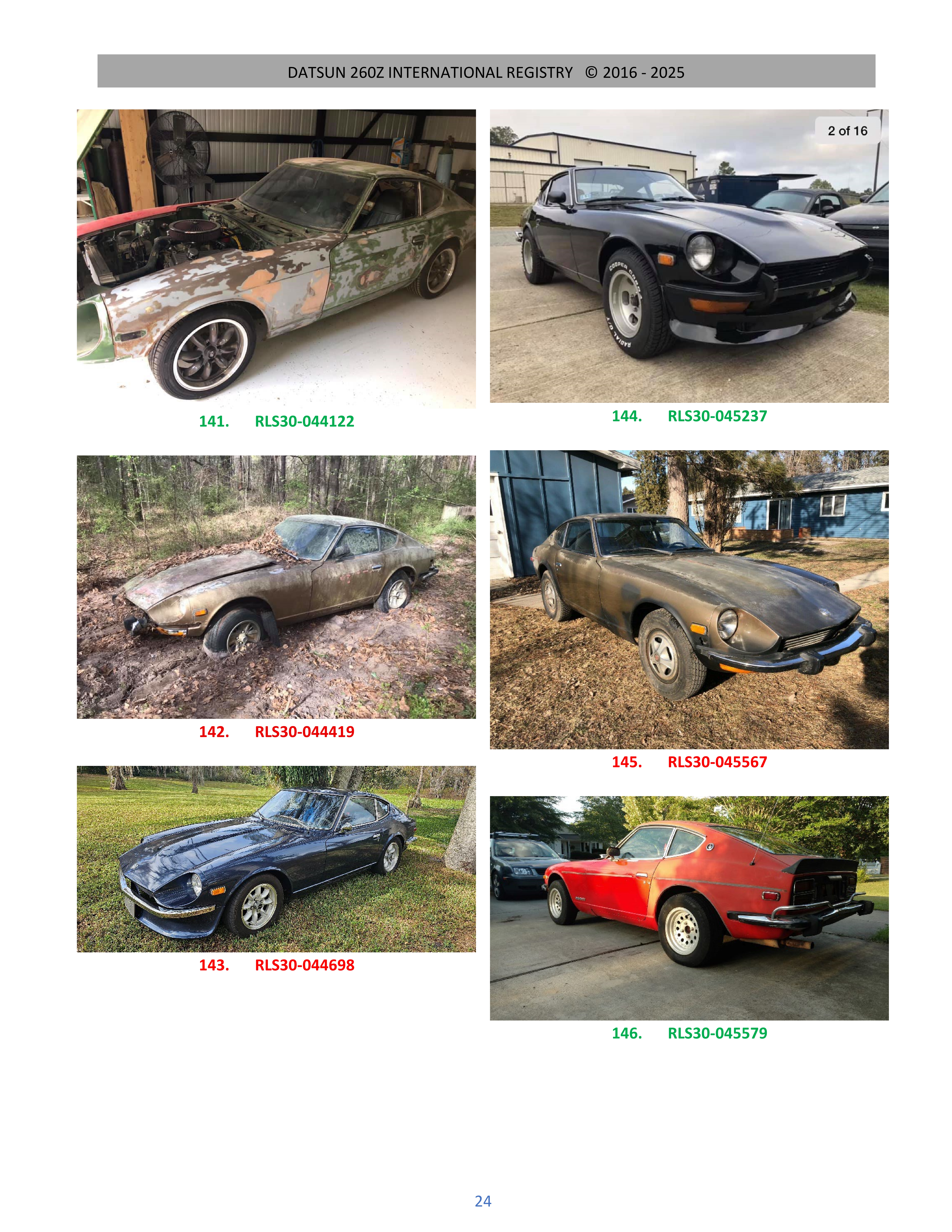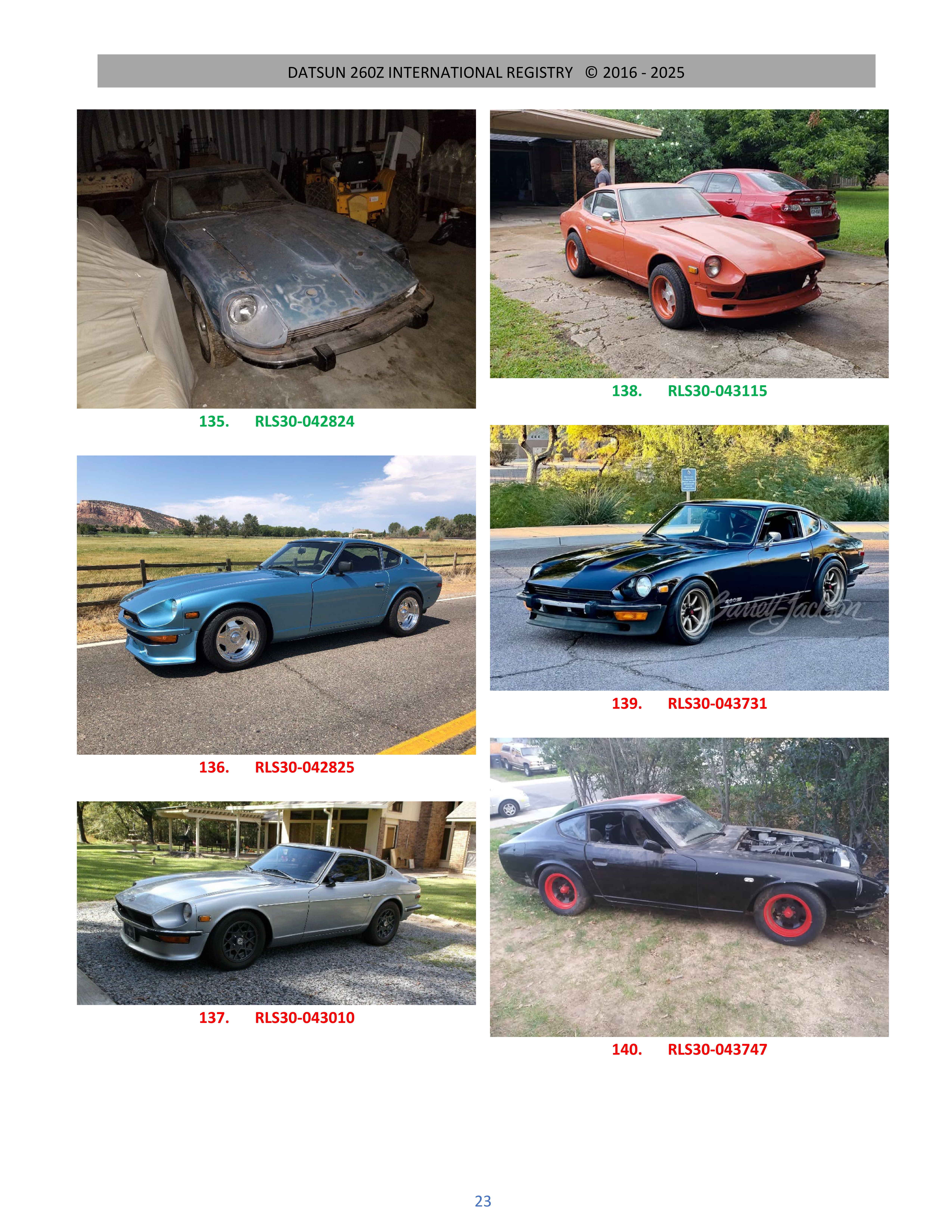 Over the past few years I have been building a database of all 260Zs that I know still exist or that I know their fate. Periodically I will be adding photos to show all of these 260Zs. I have now included RS30 models as well as L26 engines. So far, I have 36 pages and 209 cars and 12 engines. The database is small since the 260Z had the least number produced compared to the 240Z and the 280Z. 260Zs that are currently registered are listed with green VINs. 260Zs that are not registered are listed with red VINs. 260Zs that I don’t have a picture of will be shown with a 260Z emblem.