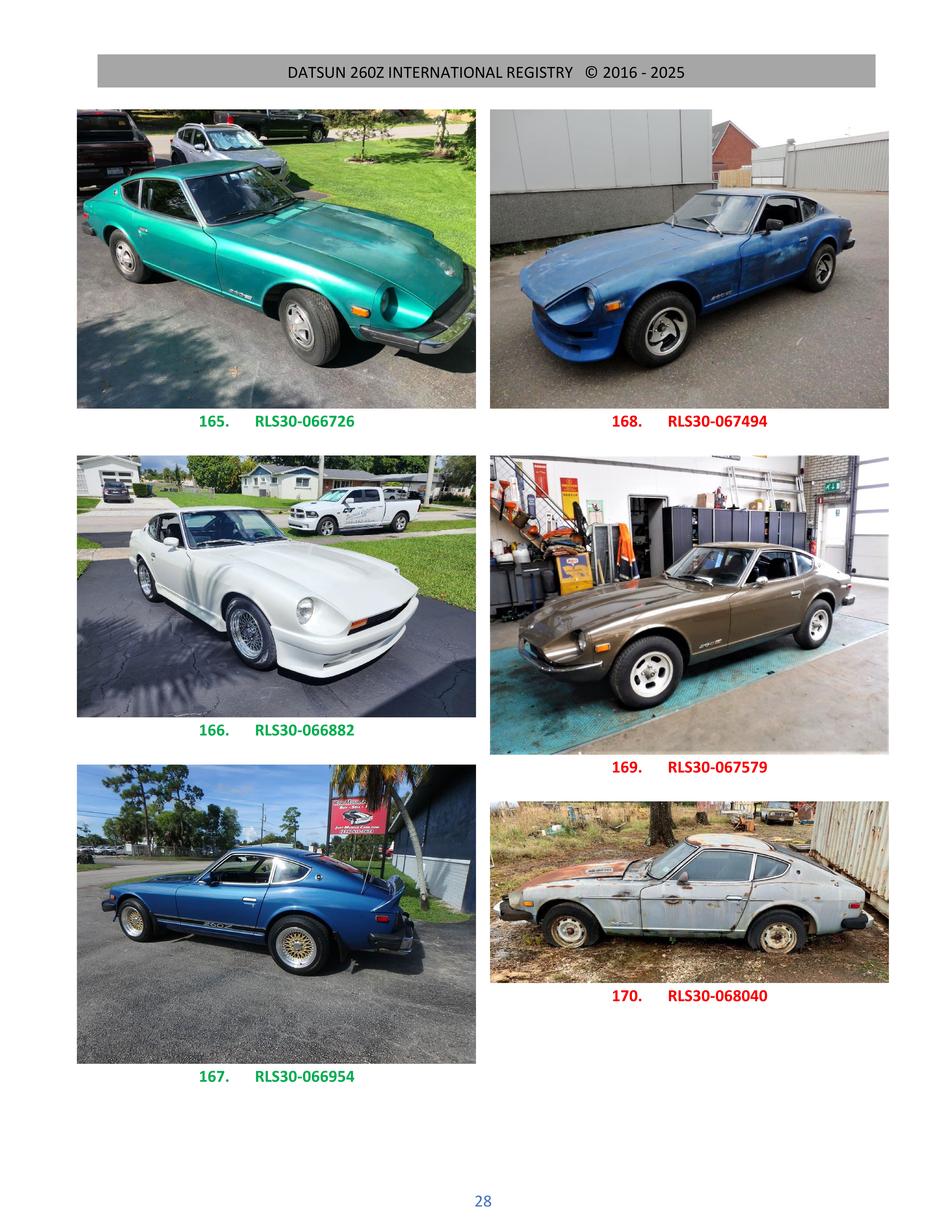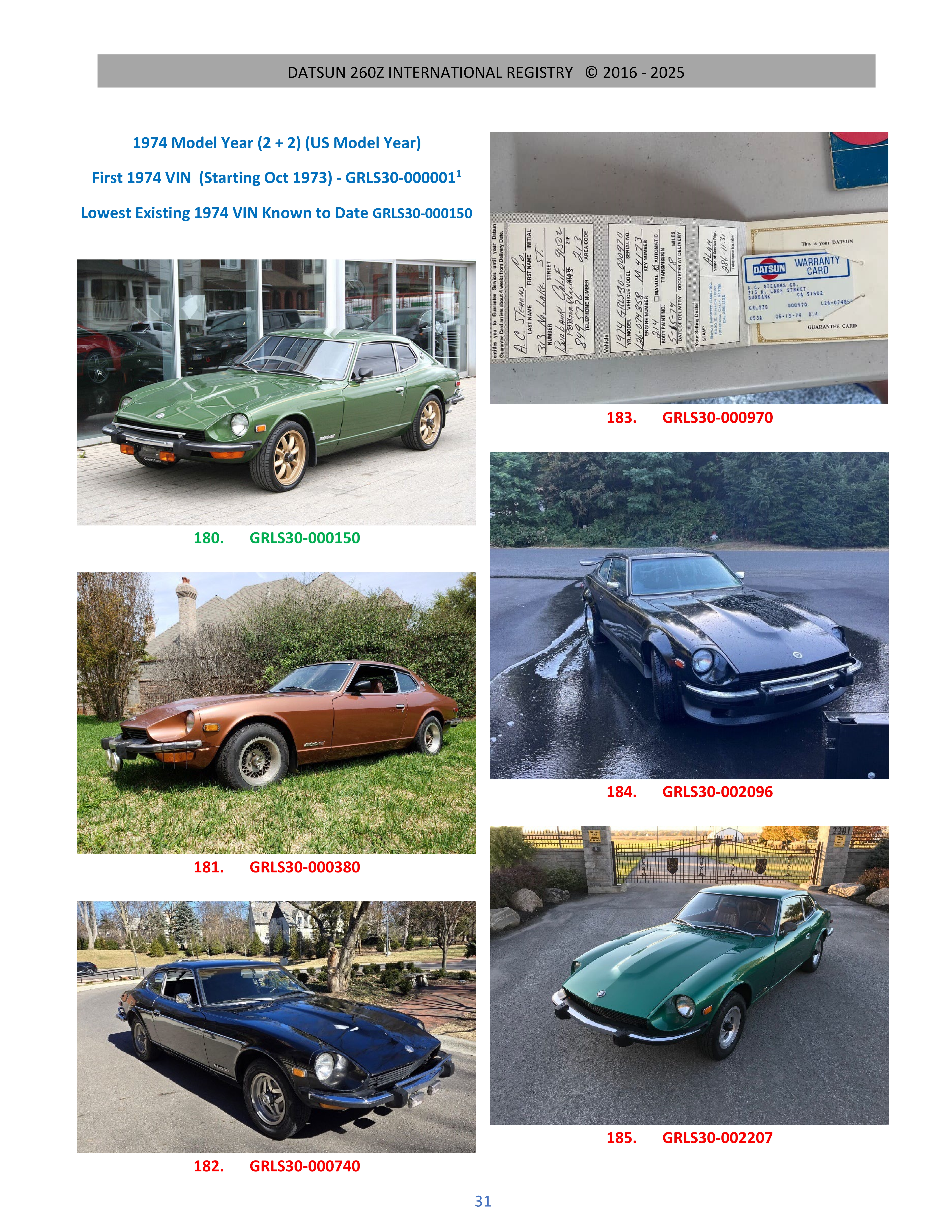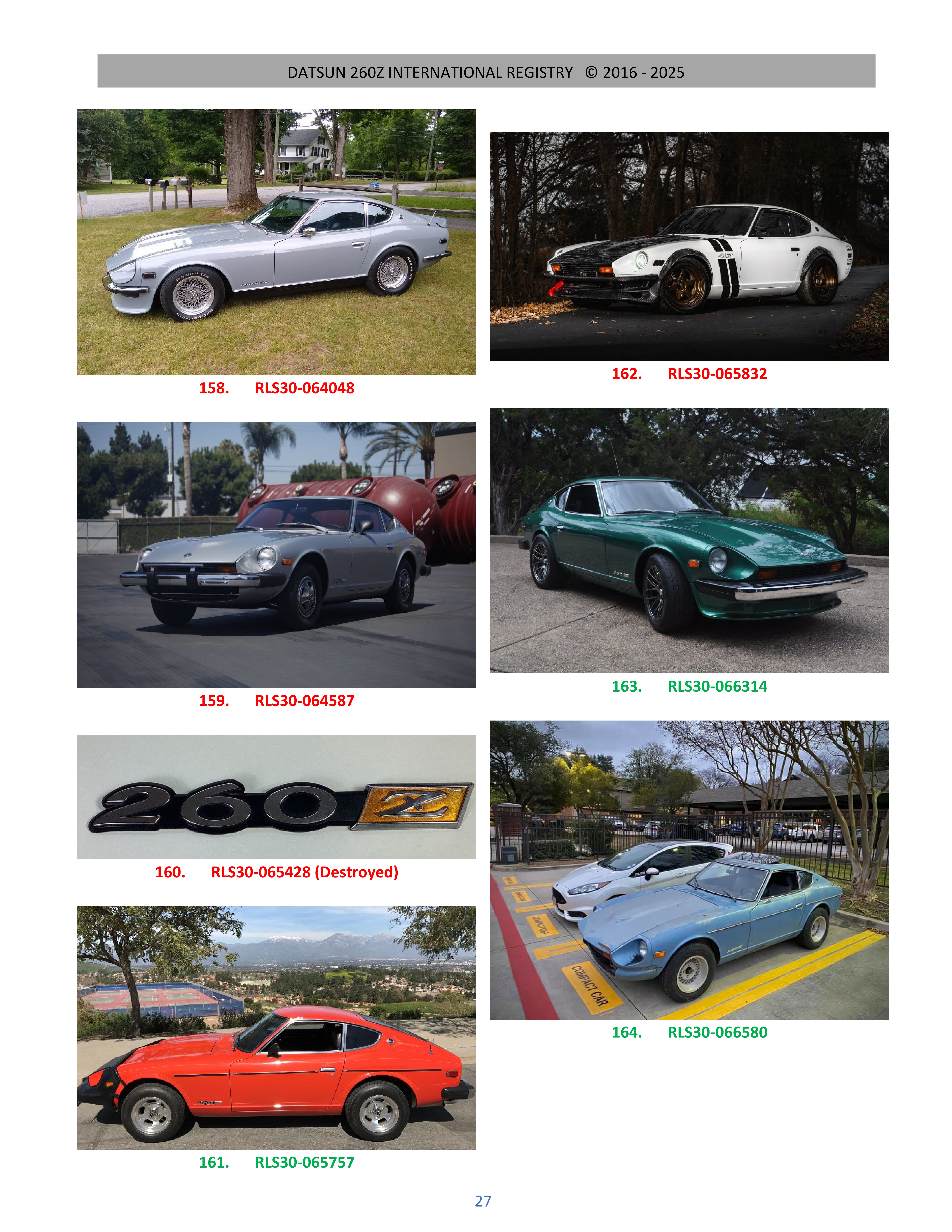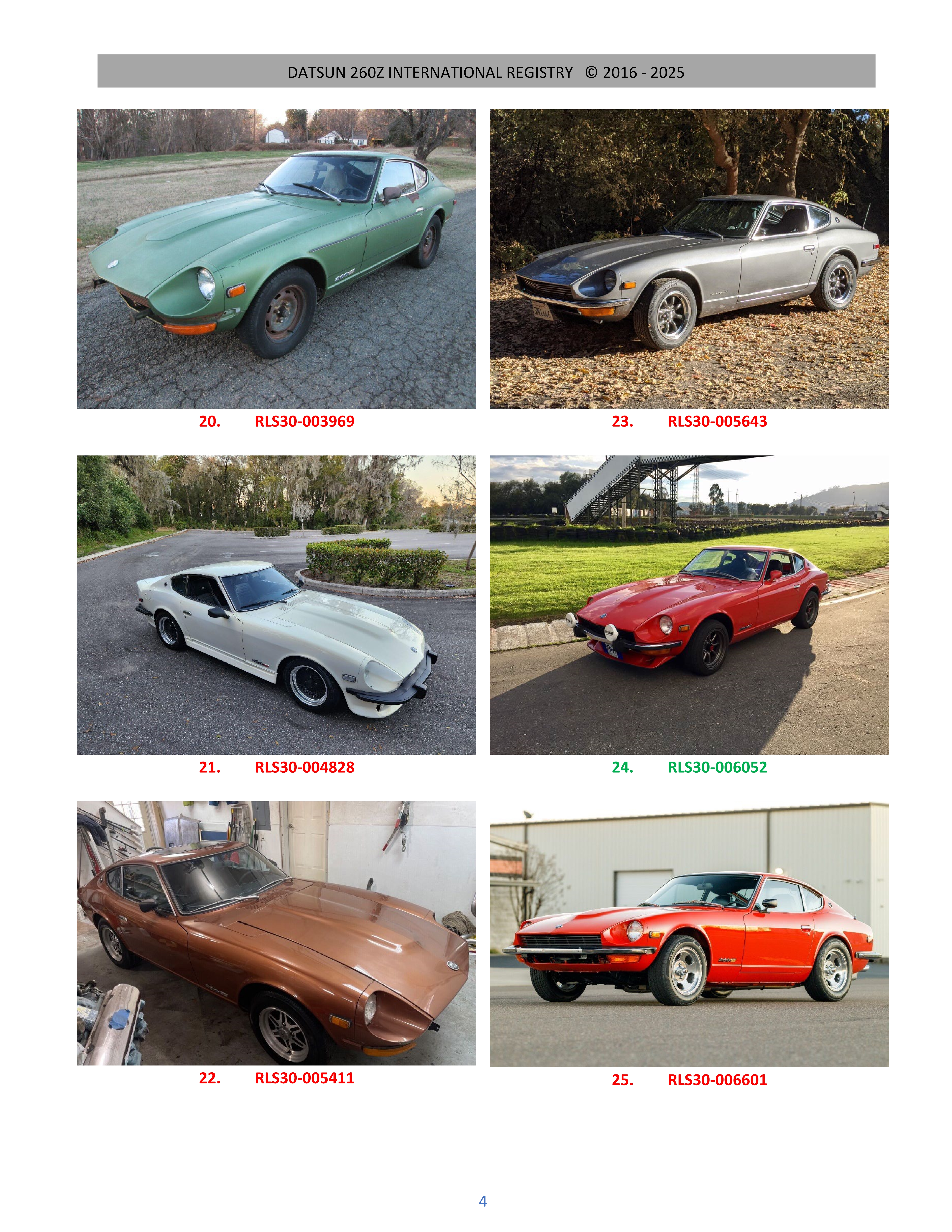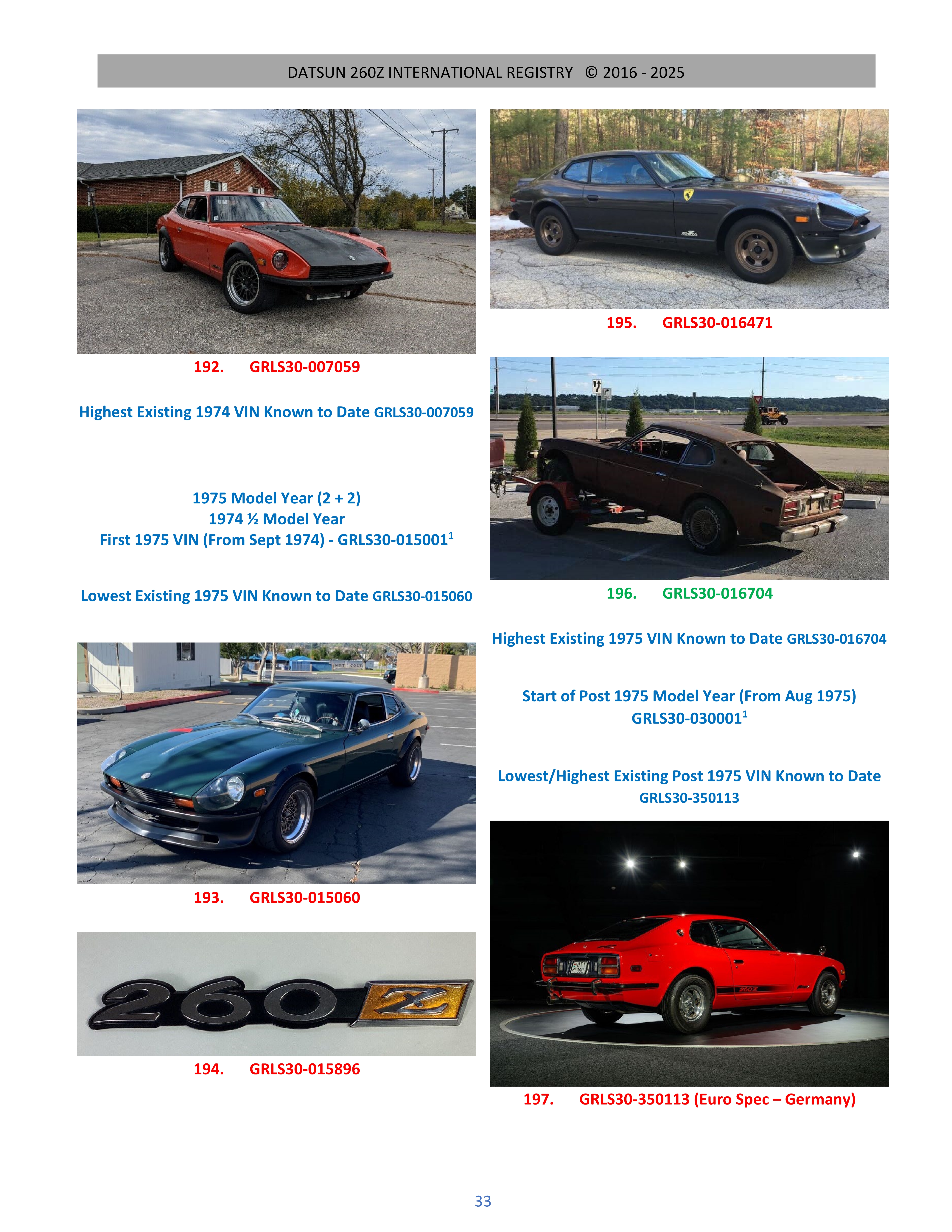 Over the past few years I have been building a database of all 260Zs that I know still exist or that I know their fate. Periodically I will be adding photos to show all of these 260Zs. I have now included RS30 models as well as L26 engines. So far, I have 36 pages and 209 cars and 12 engines. The database is small since the 260Z had the least number produced compared to the 240Z and the 280Z. 260Zs that are currently registered are listed with green VINs. 260Zs that are not registered are listed with red VINs. 260Zs that I don’t have a picture of will be shown with a 260Z emblem.