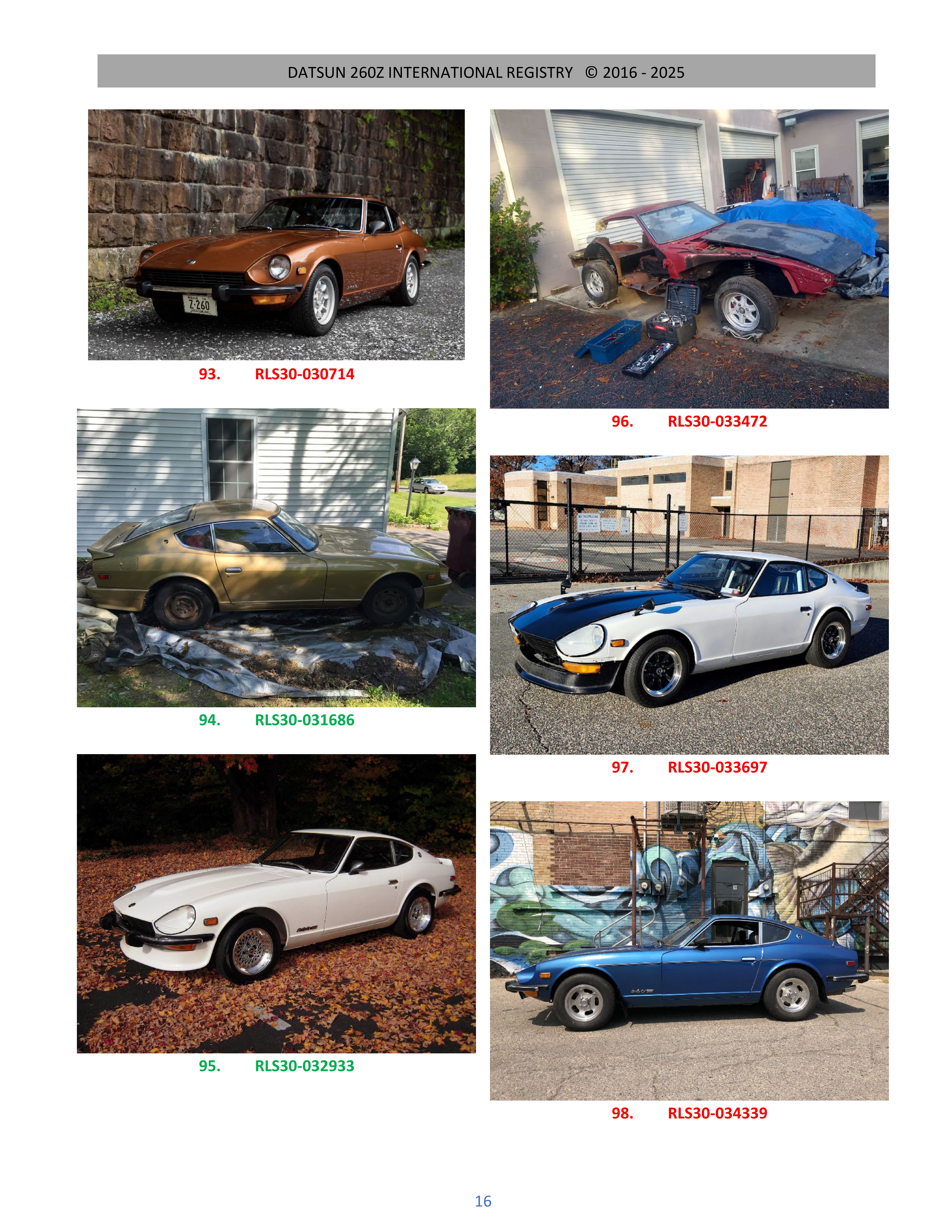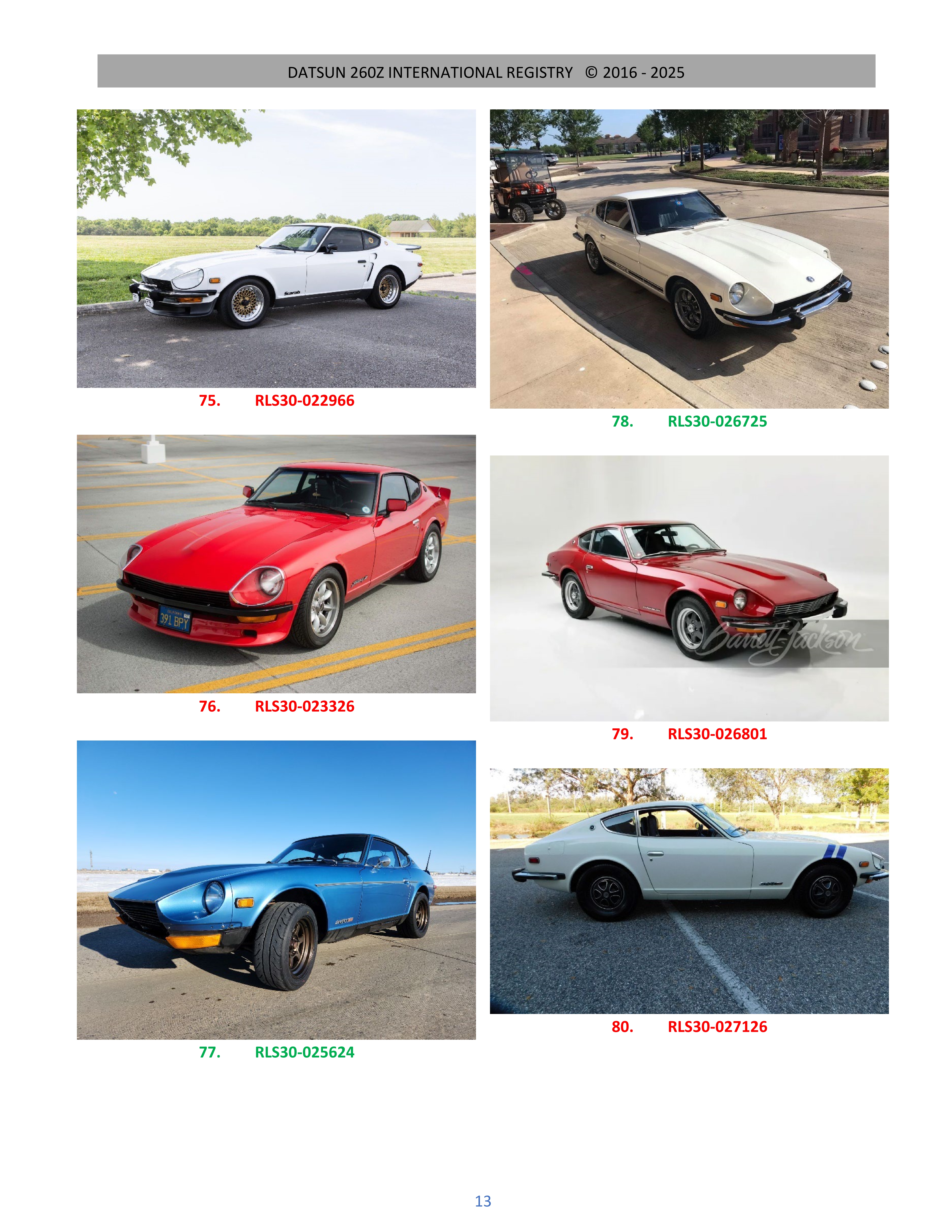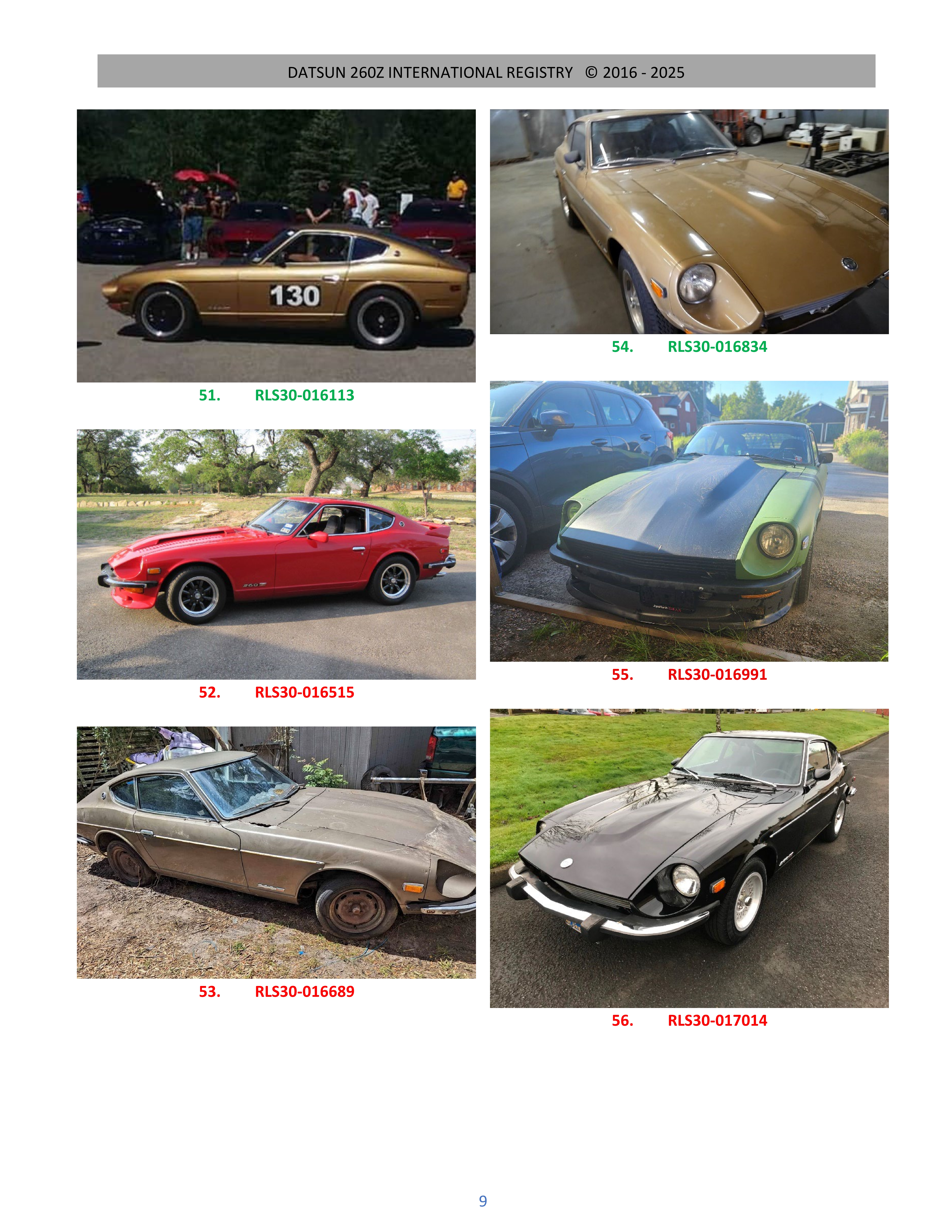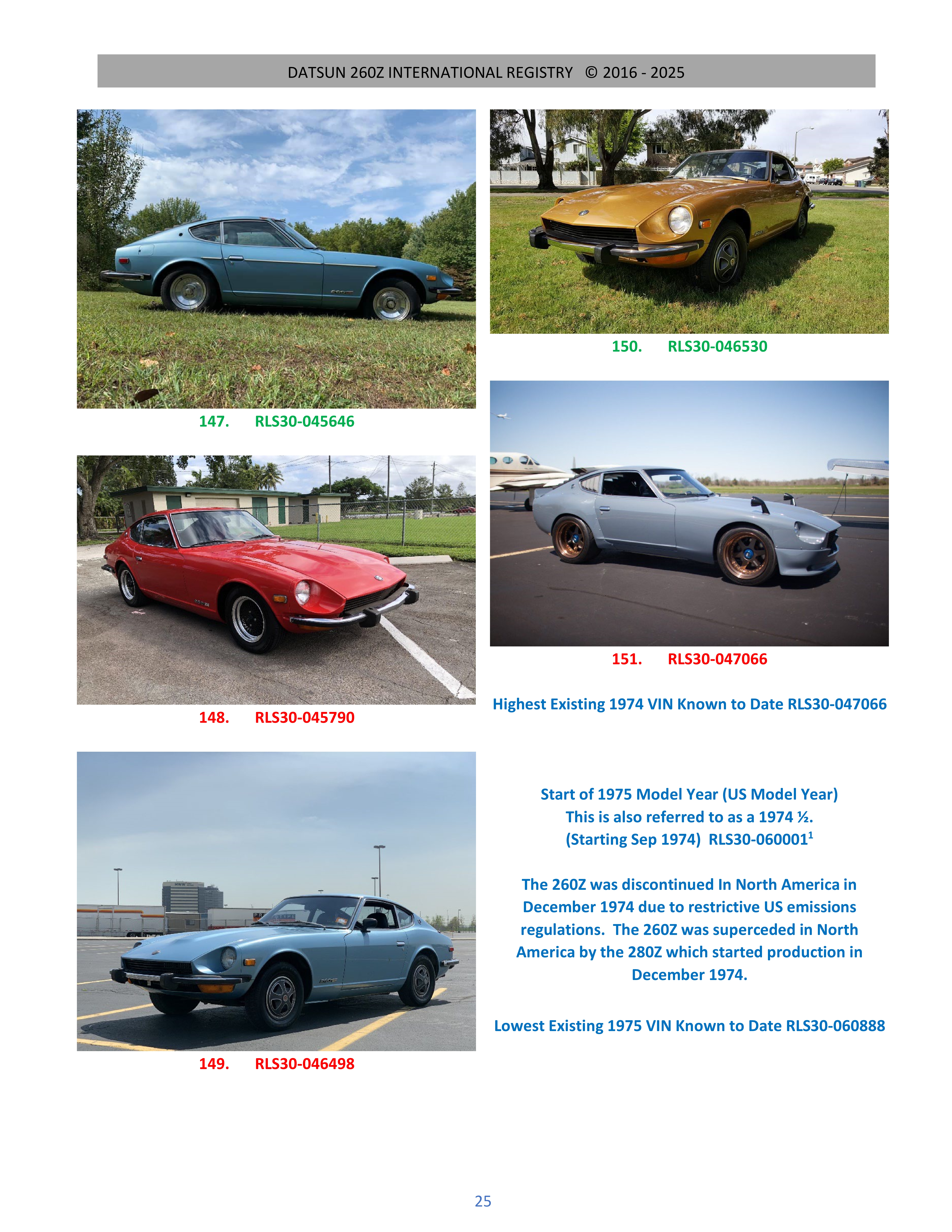 Over the past few years I have been building a database of all 260Zs that I know still exist or that I know their fate. Periodically I will be adding photos to show all of these 260Zs. I have now included RS30 models as well as L26 engines. So far, I have 36 pages and 209 cars and 12 engines. The database is small since the 260Z had the least number produced compared to the 240Z and the 280Z. 260Zs that are currently registered are listed with green VINs. 260Zs that are not registered are listed with red VINs. 260Zs that I don’t have a picture of will be shown with a 260Z emblem.