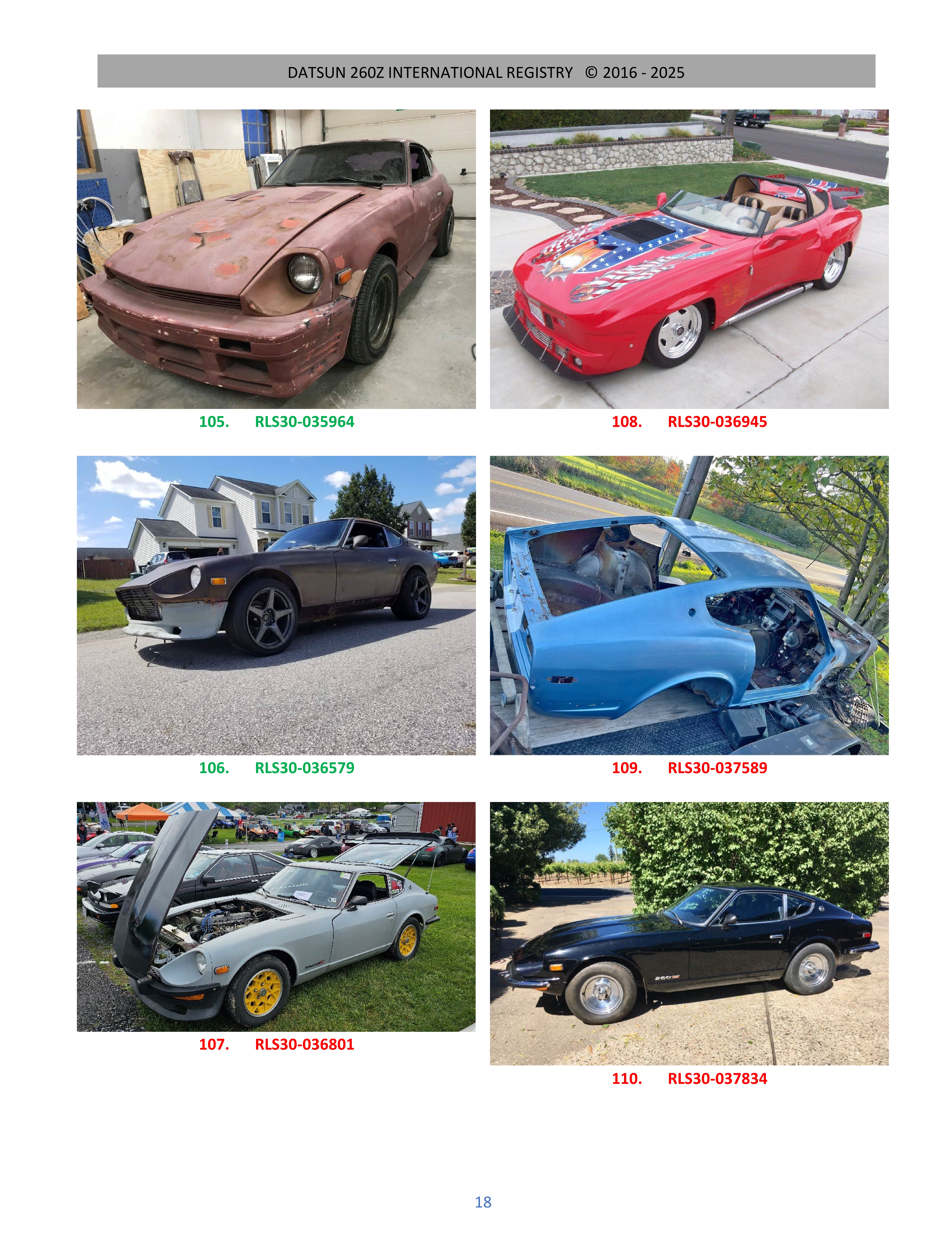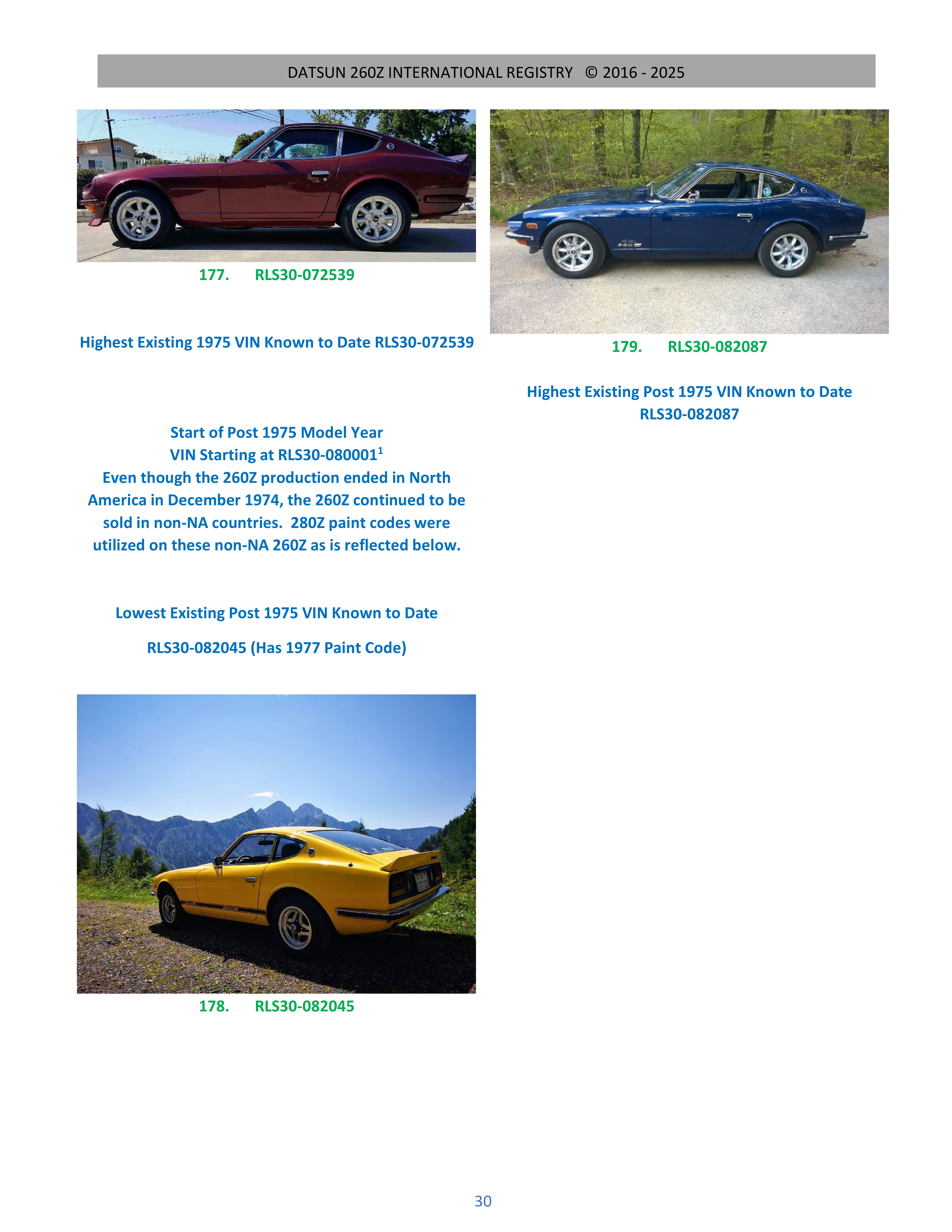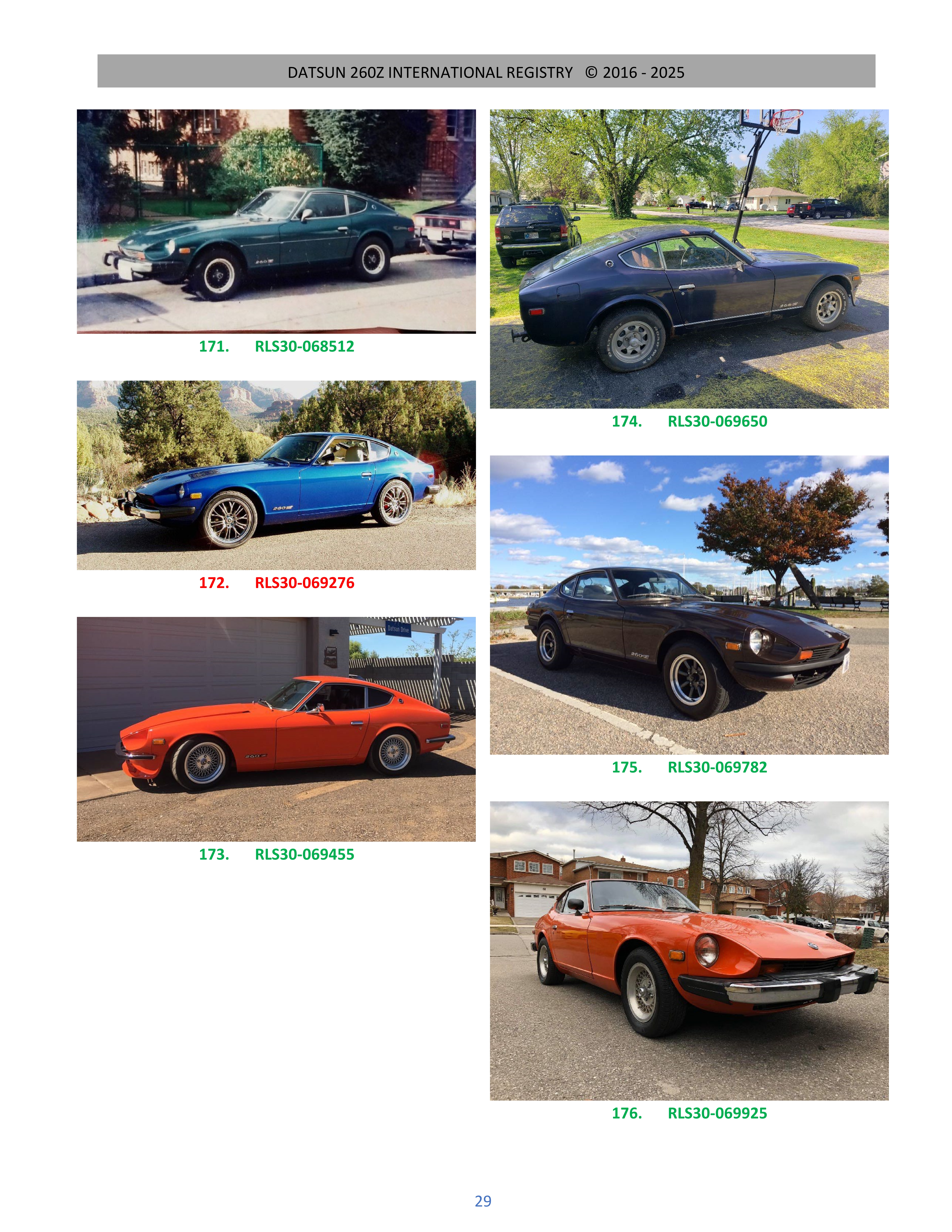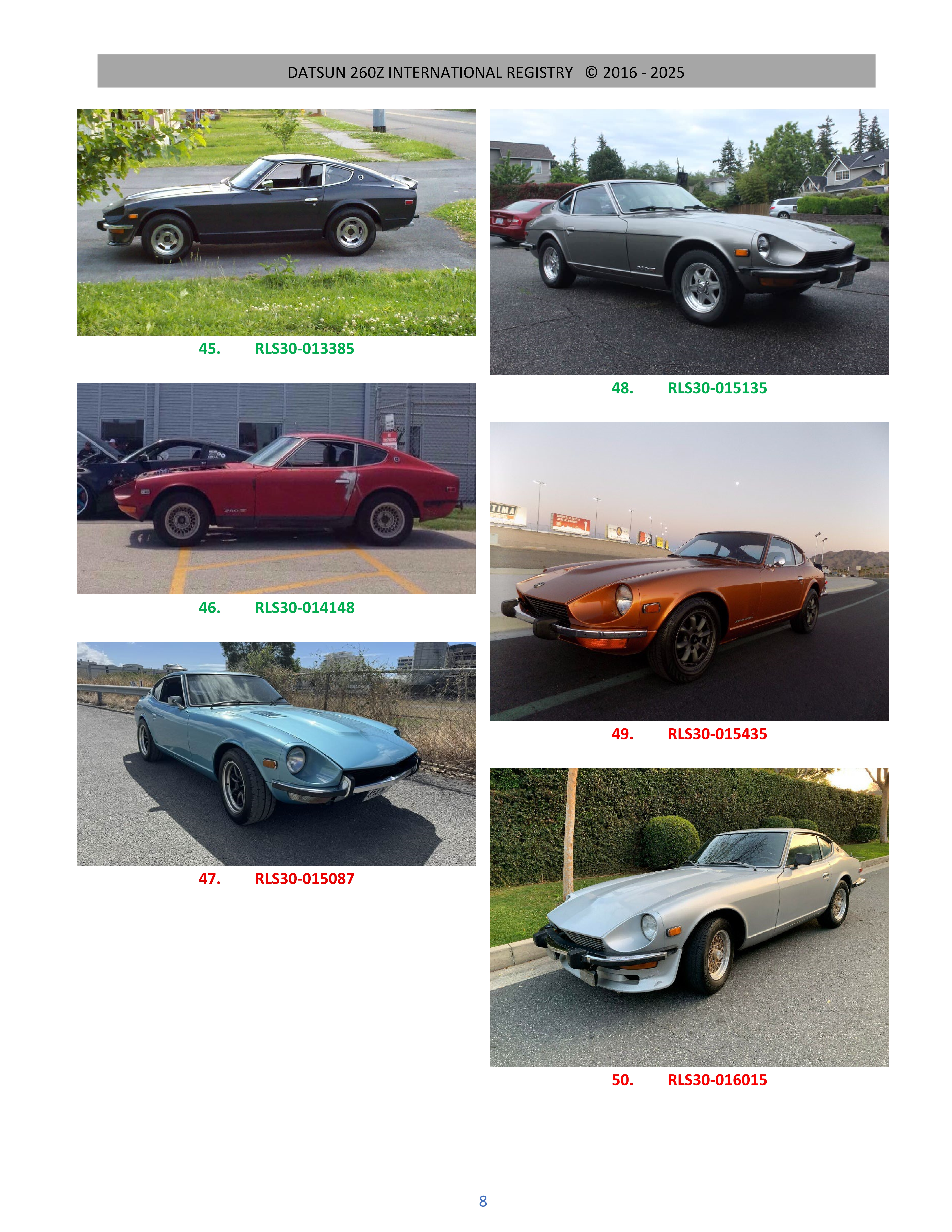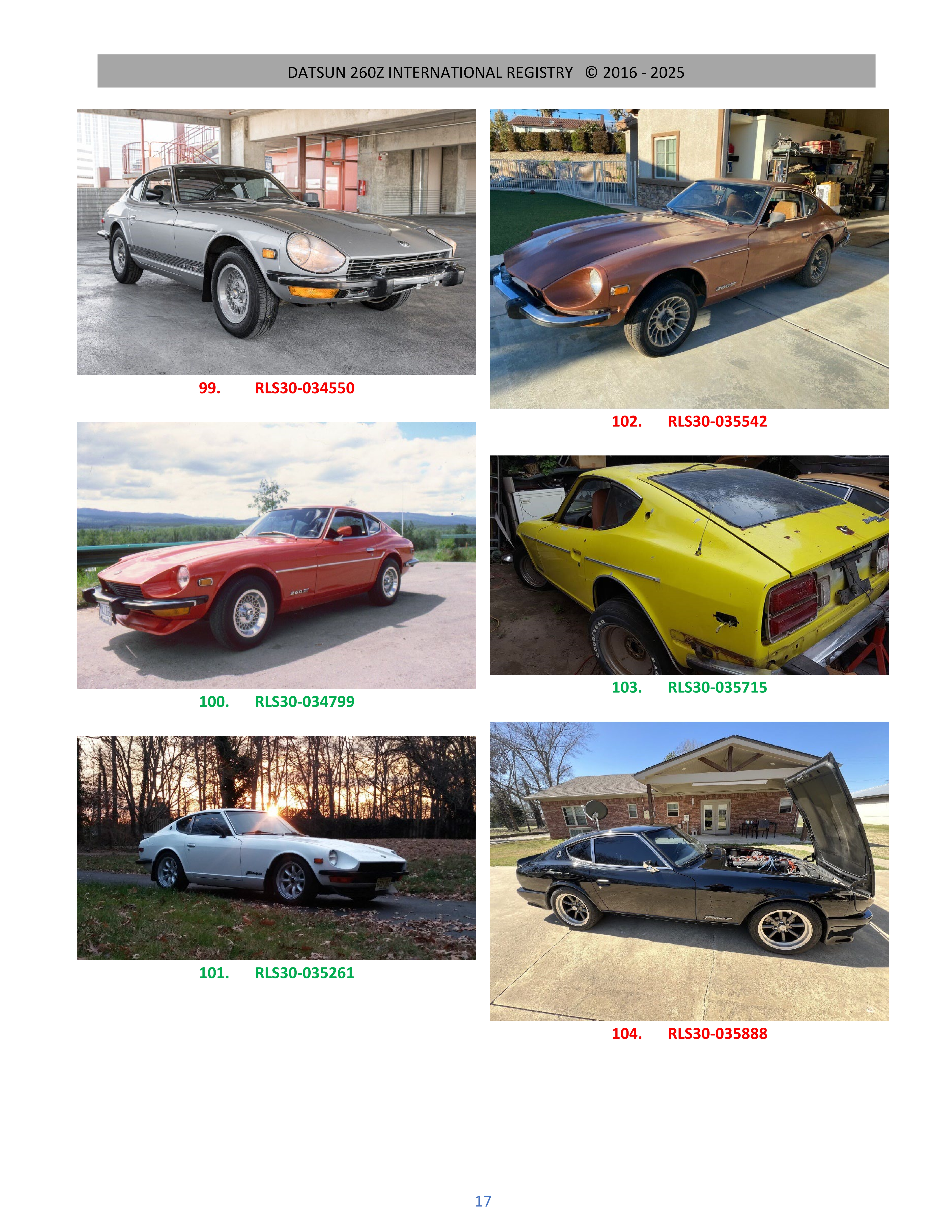 Over the past few years I have been building a database of all 260Zs that I know still exist or that I know their fate. Periodically I will be adding photos to show all of these 260Zs. I have now included RS30 models as well as L26 engines. So far, I have 36 pages and 209 cars and 12 engines. The database is small since the 260Z had the least number produced compared to the 240Z and the 280Z. 260Zs that are currently registered are listed with green VINs. 260Zs that are not registered are listed with red VINs. 260Zs that I don’t have a picture of will be shown with a 260Z emblem.