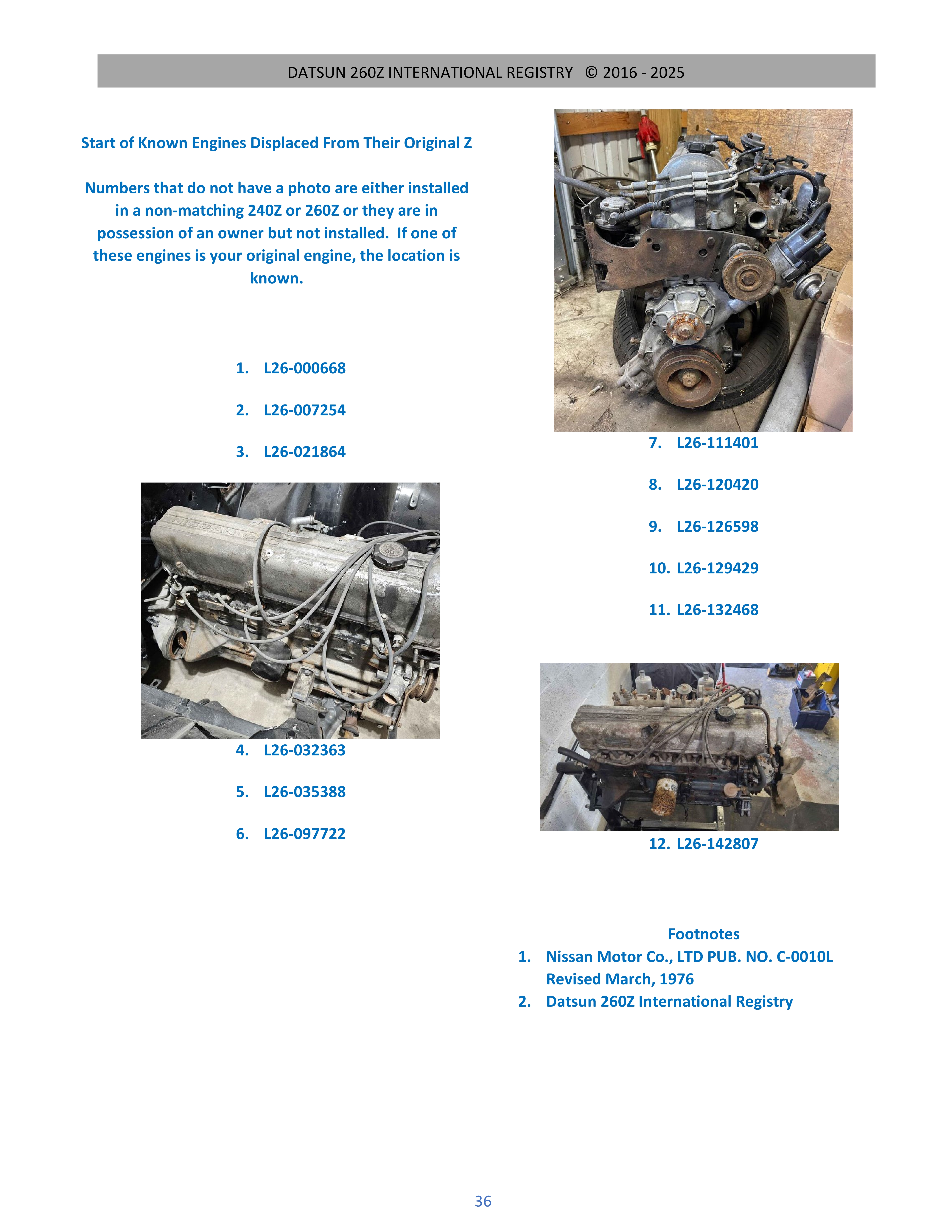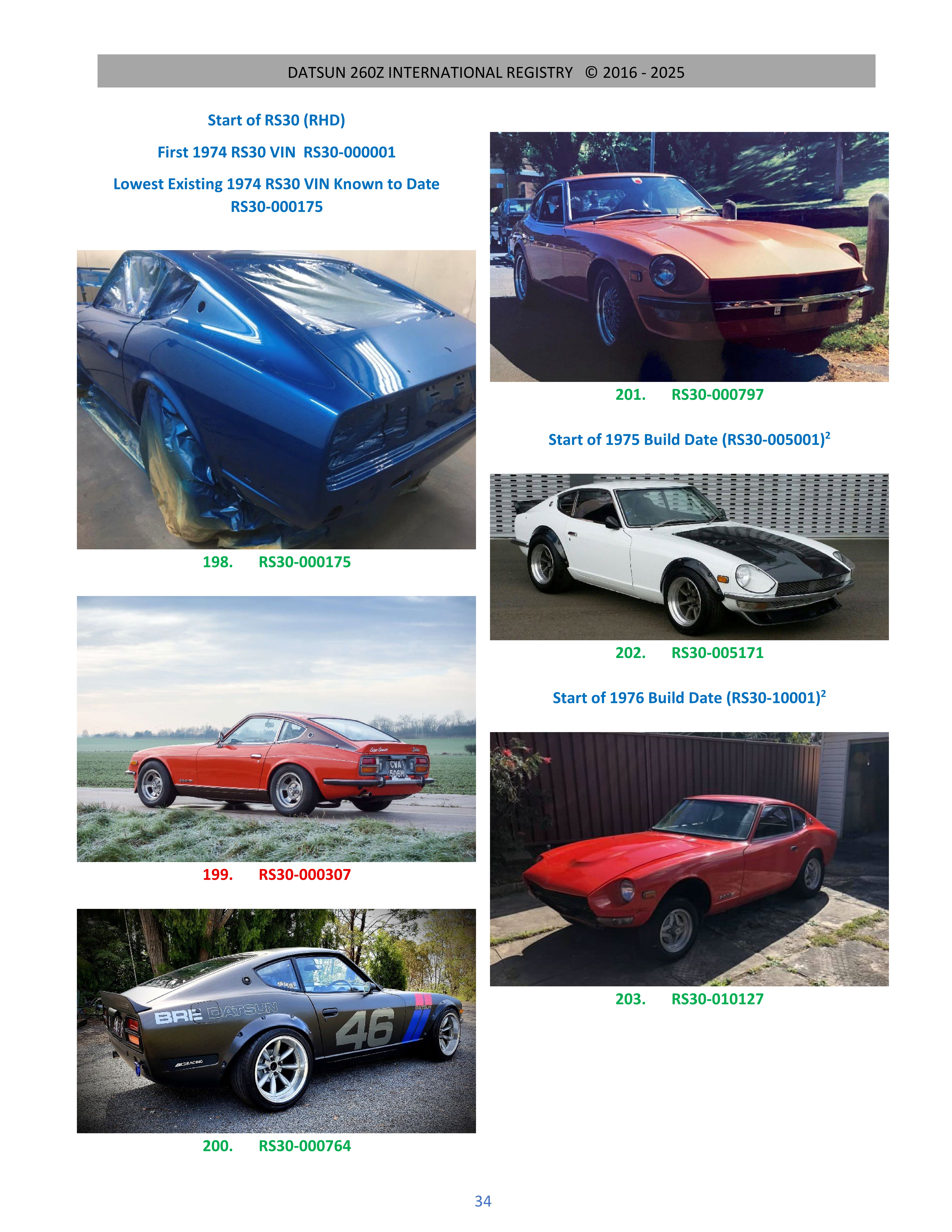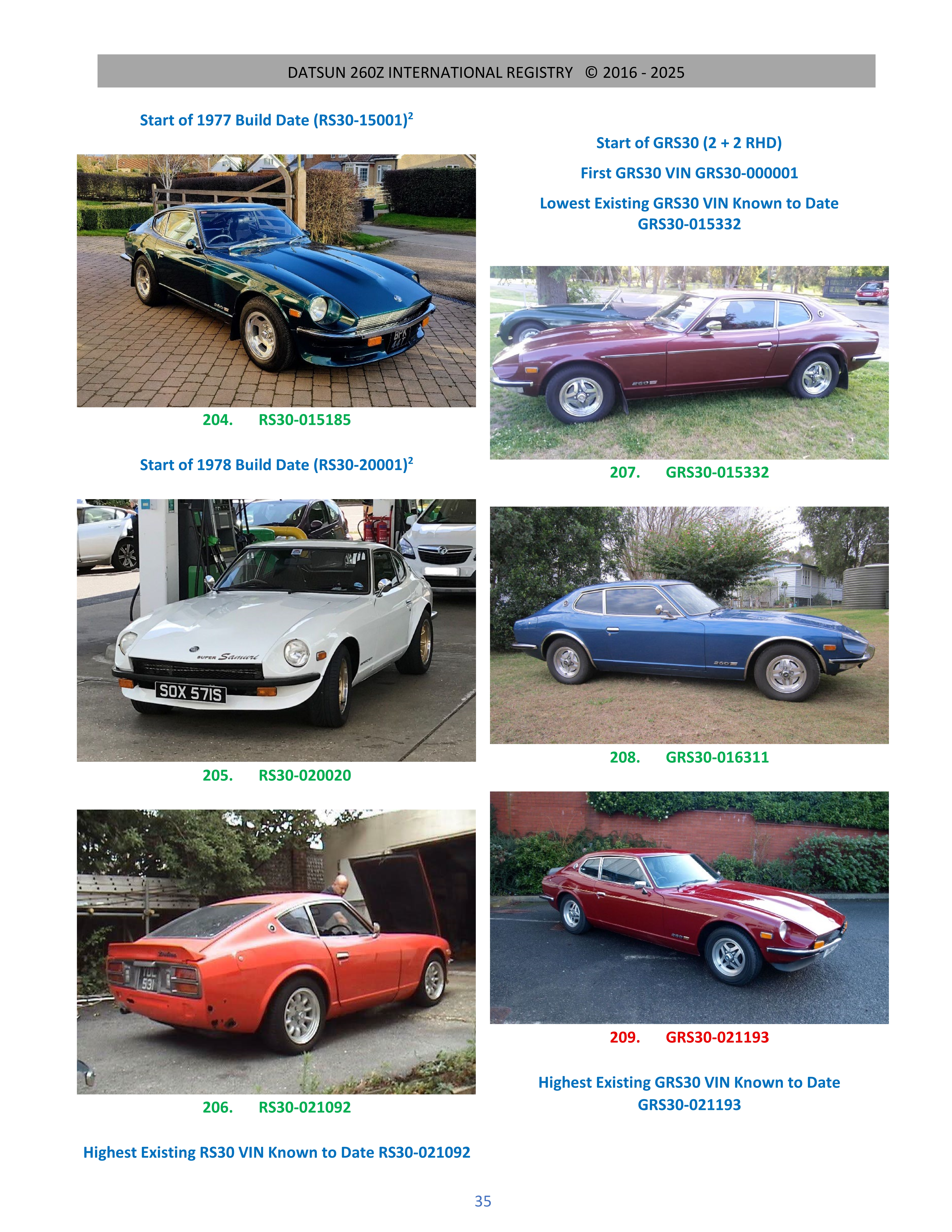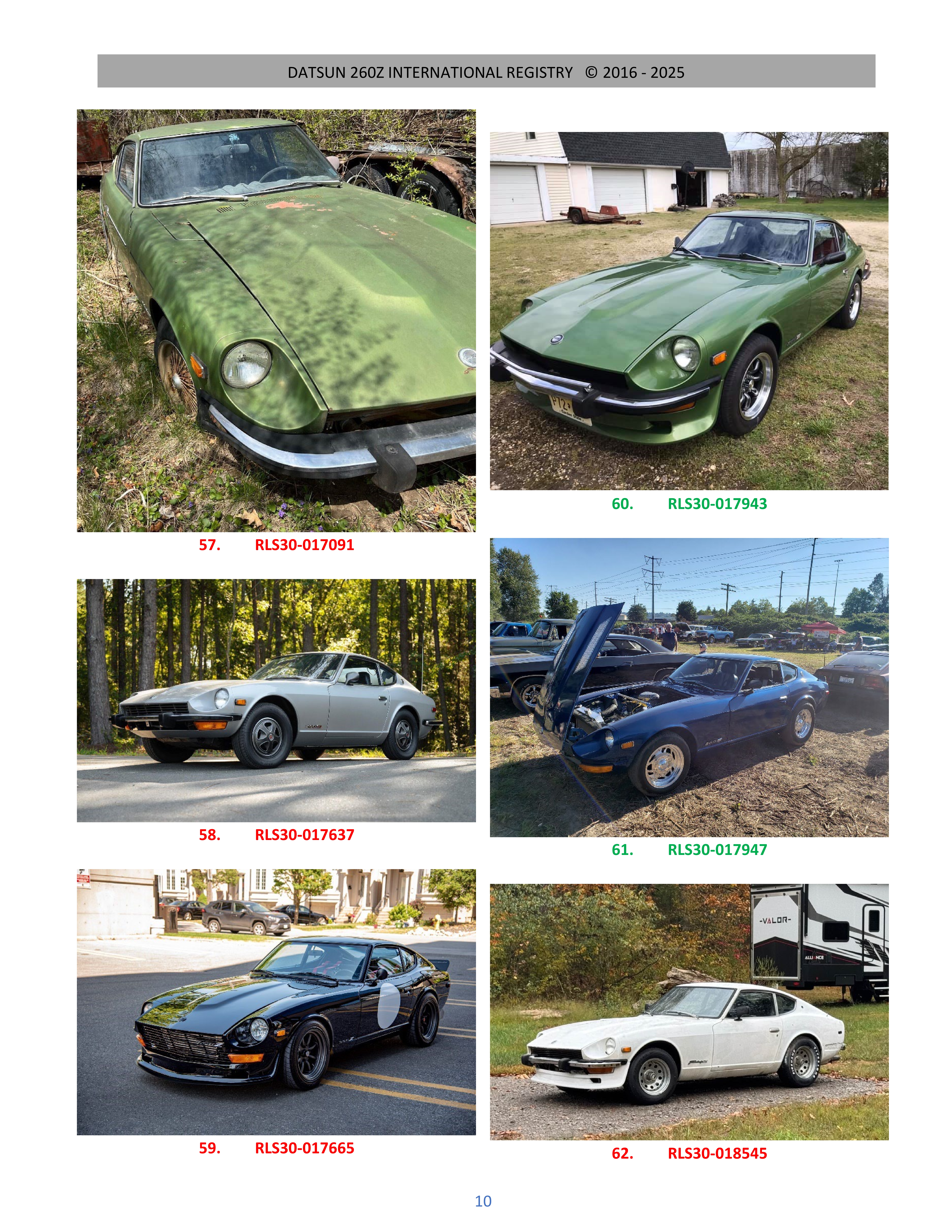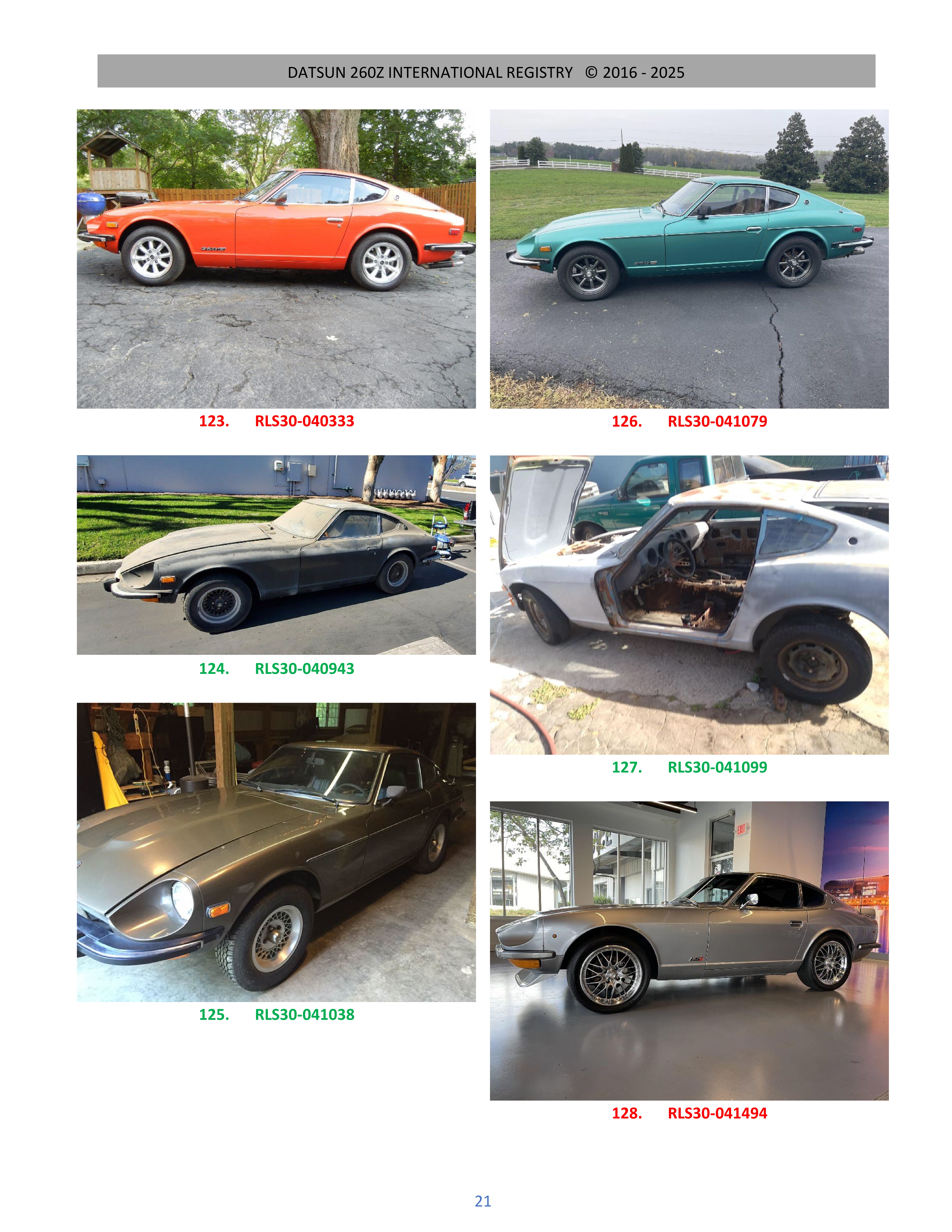 Over the past few years I have been building a database of all 260Zs that I know still exist or that I know their fate. Periodically I will be adding photos to show all of these 260Zs. I have now included RS30 models as well as L26 engines. So far, I have 36 pages and 209 cars and 12 engines. The database is small since the 260Z had the least number produced compared to the 240Z and the 280Z. 260Zs that are currently registered are listed with green VINs. 260Zs that are not registered are listed with red VINs. 260Zs that I don’t have a picture of will be shown with a 260Z emblem.