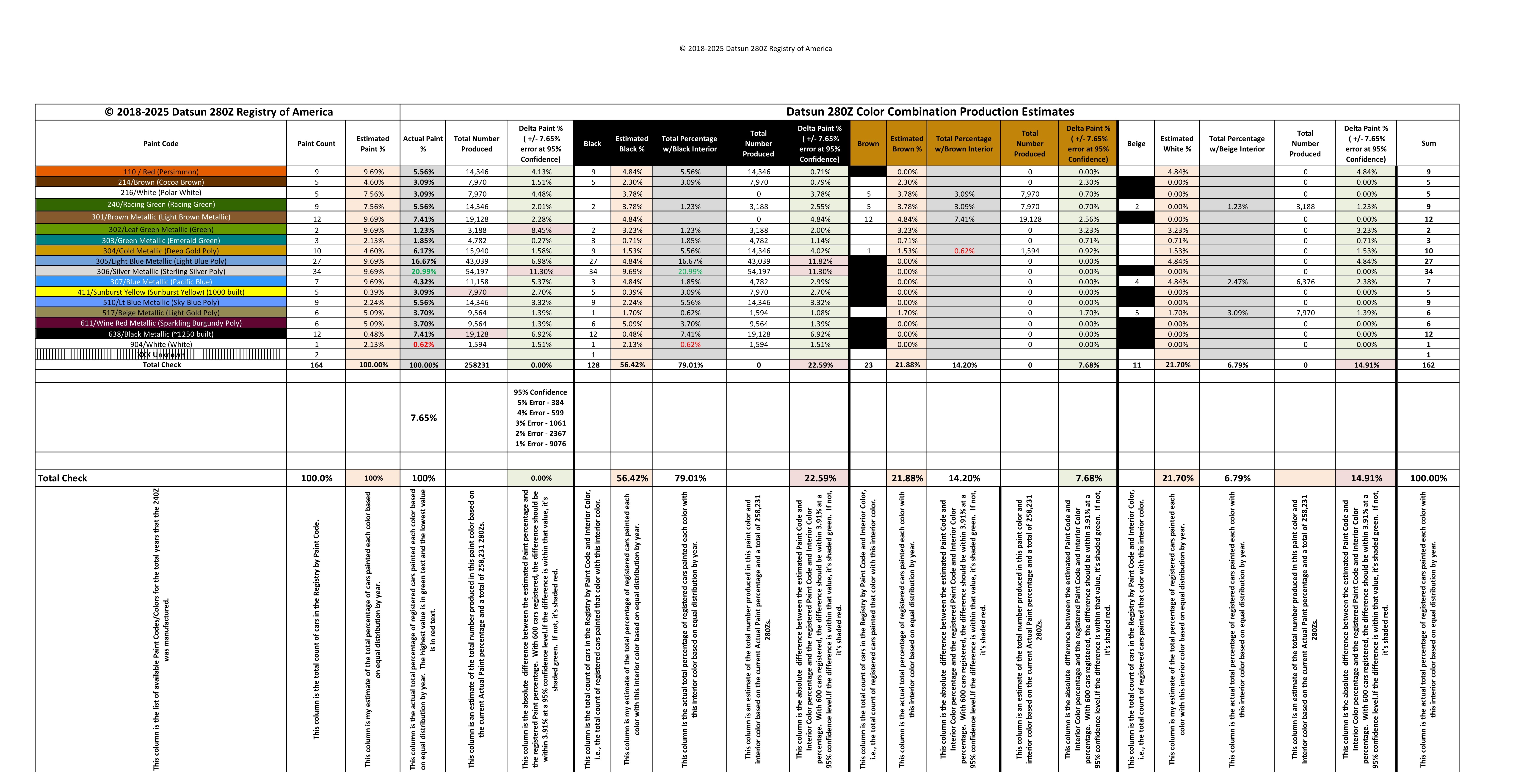 Original build records for the 280Z aren’t available from Nissan. Therefore, information such as number of vehicles built by color combination (Paint and Interior Colors) cannot be be determined by looking at an existing Nissan database. By using a statistical analysis of a smaller sample size, a running calculation of combinations can be determined.