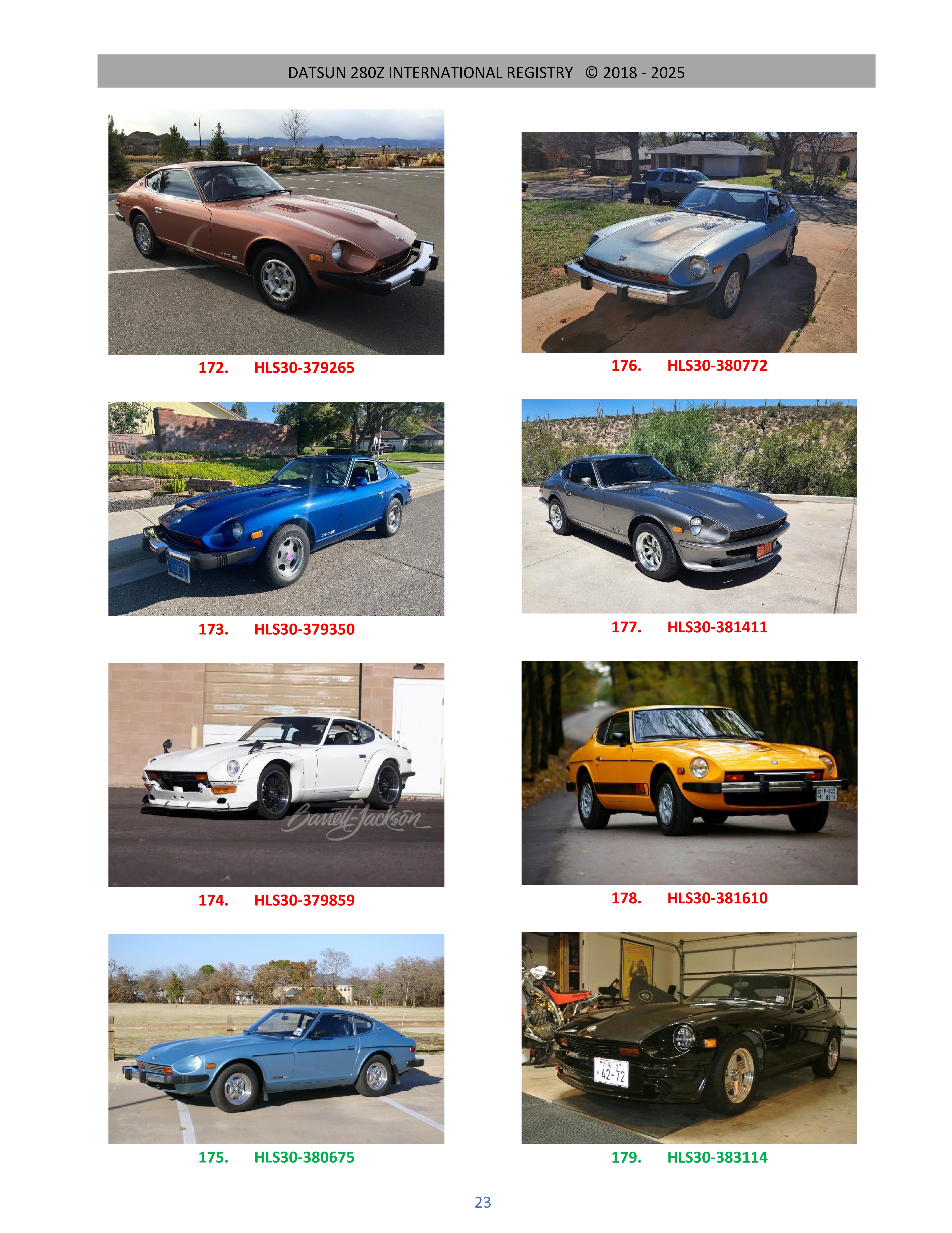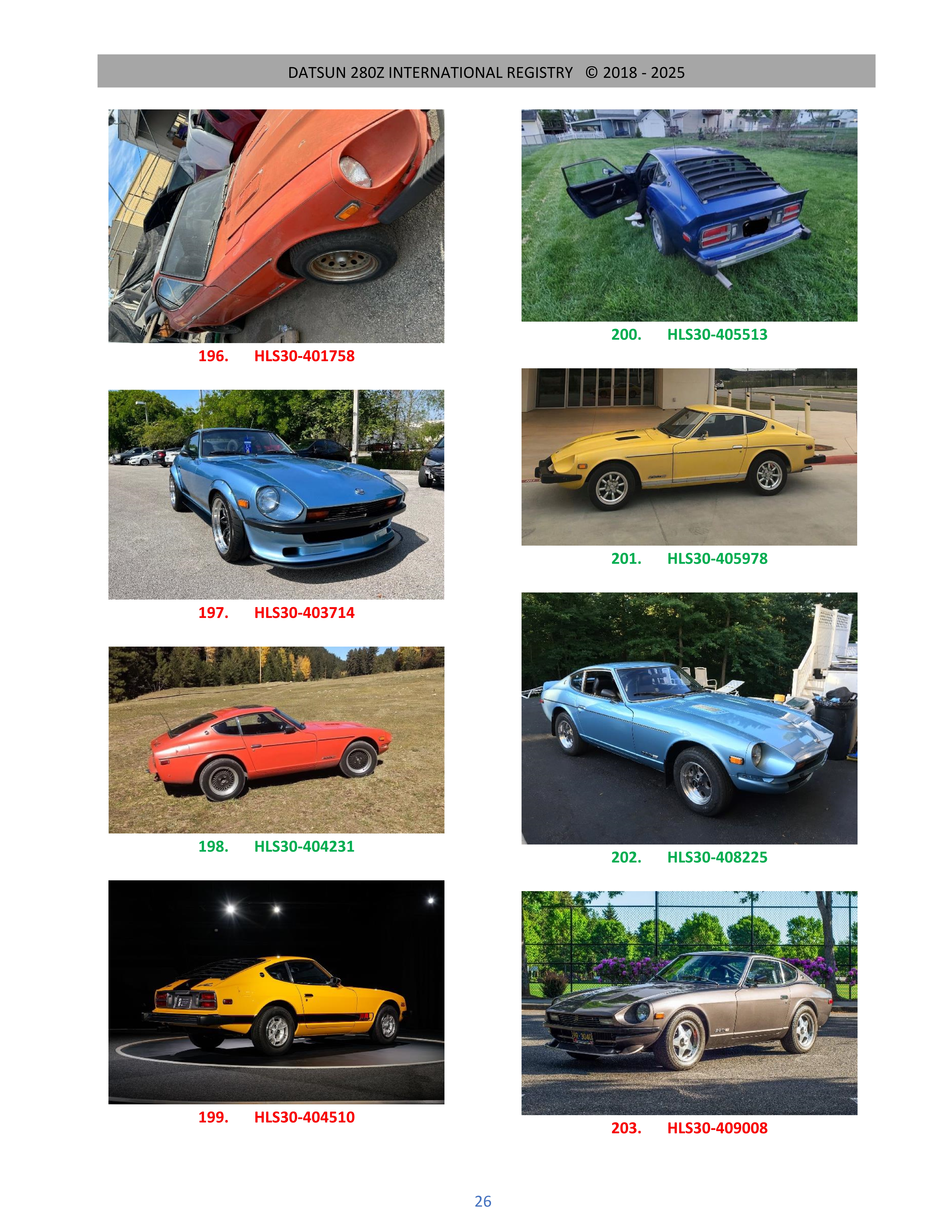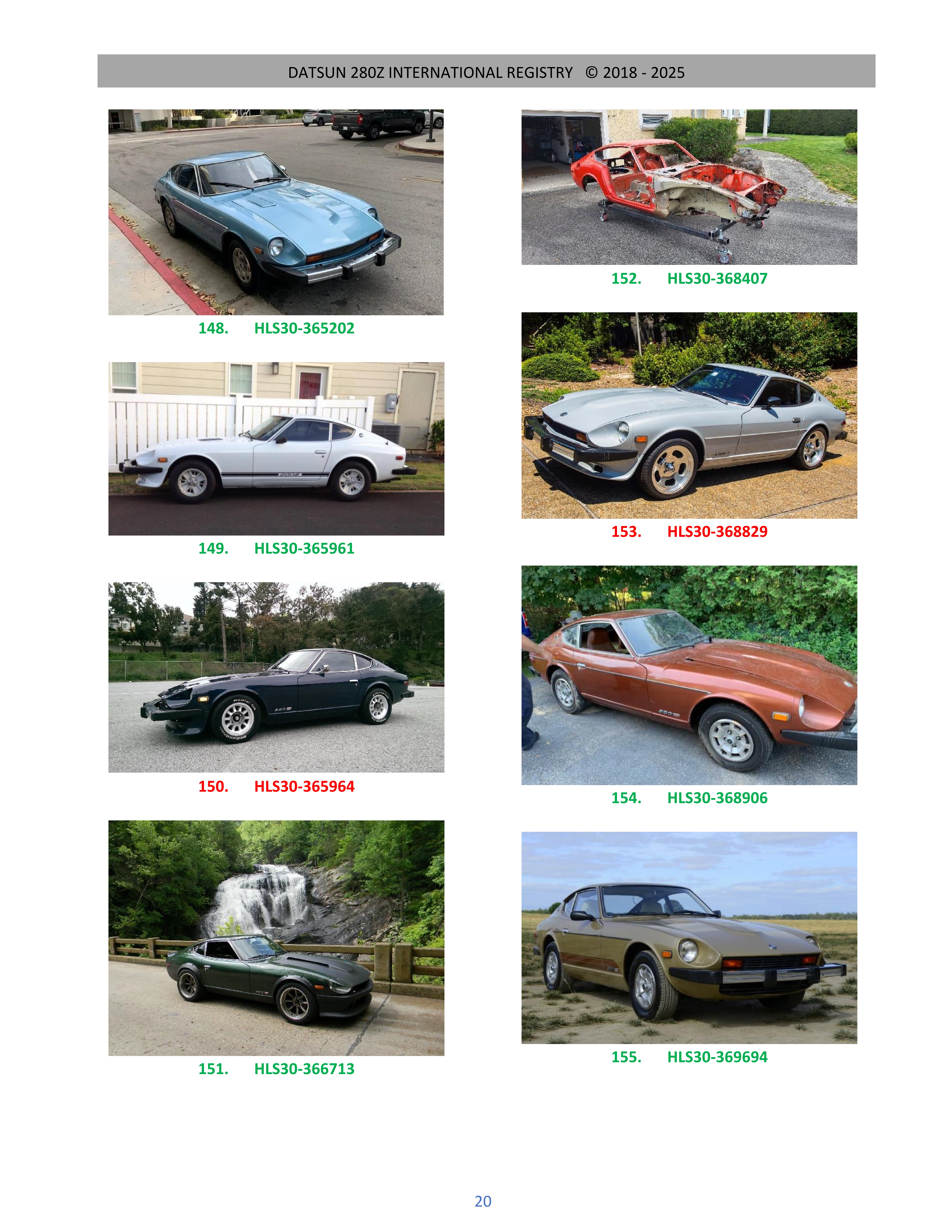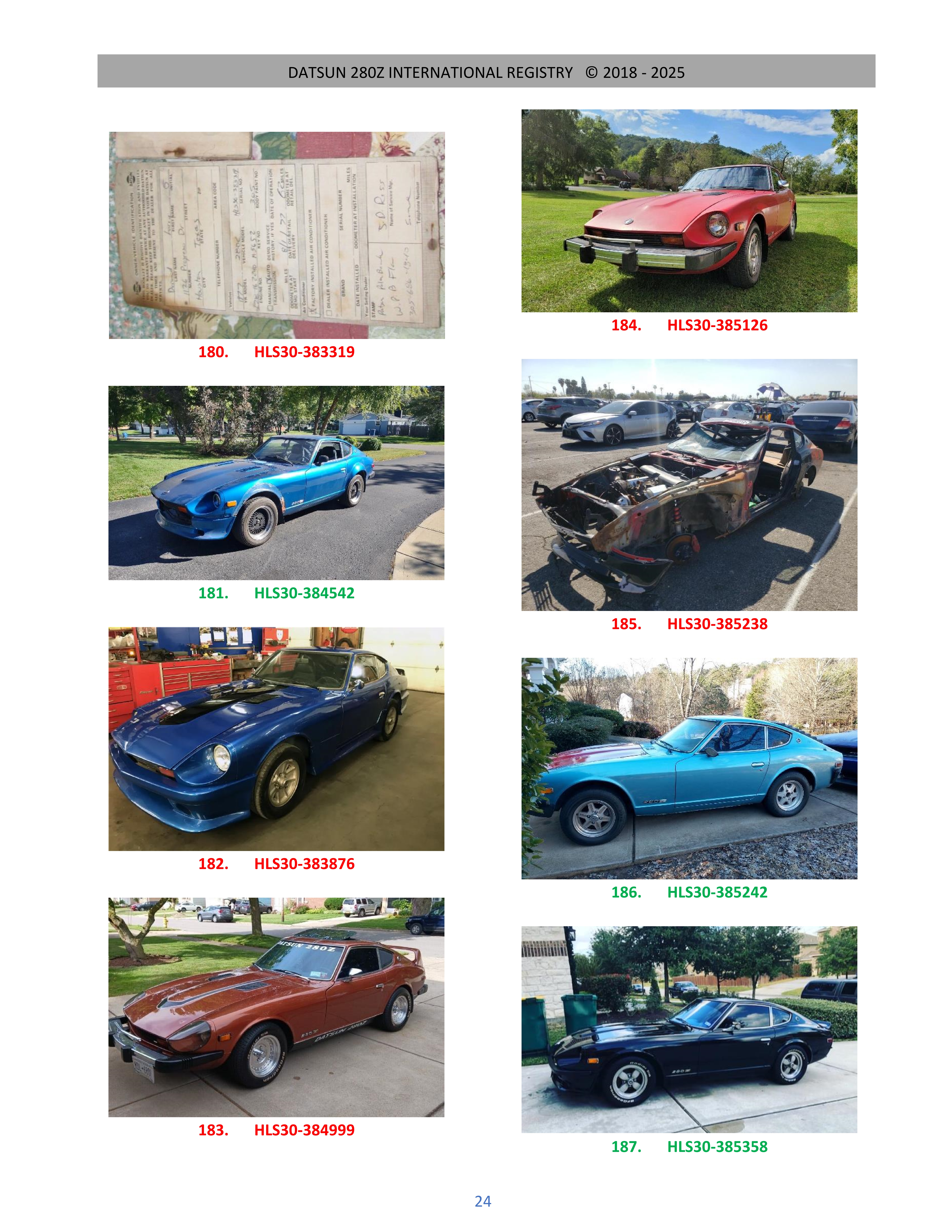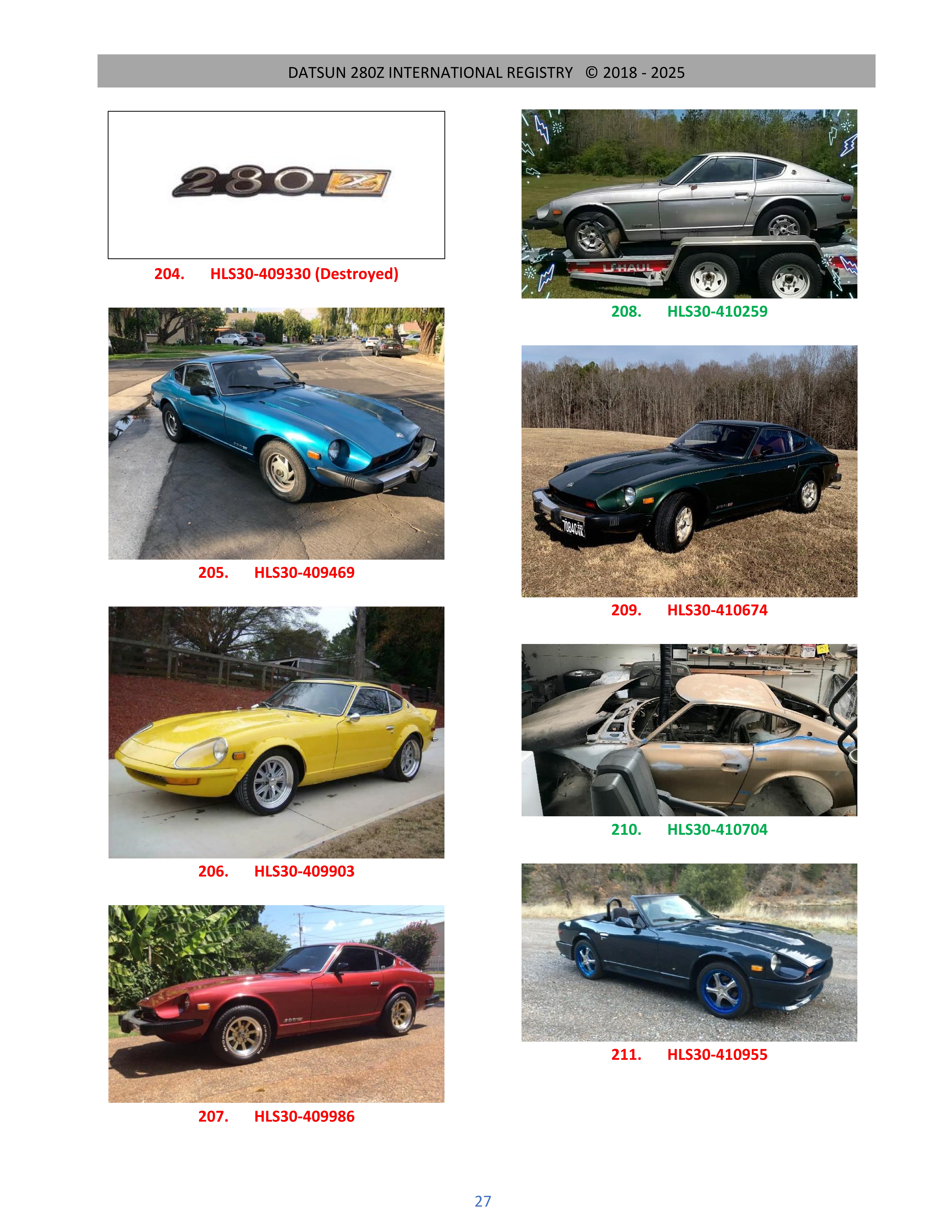 Over the past several years I have been building a database of all 280Zs that I know still exist or that I know their fate. Periodically I will be adding photos to show all of these 280Zs. I have now included GHLS30 models. So far, there are 49 pages worth, 363 cars. I have many more to post. 280Zs that are currently in the registry are listed with green VINs. 280Zs that are not registered are listed with red VINs. Zs that I don’t have a picture of will be shown with a 280Z emblem. I have also added L28 engines that are know to be displaced from their original 280Zs. There are 37 engines listed so far.