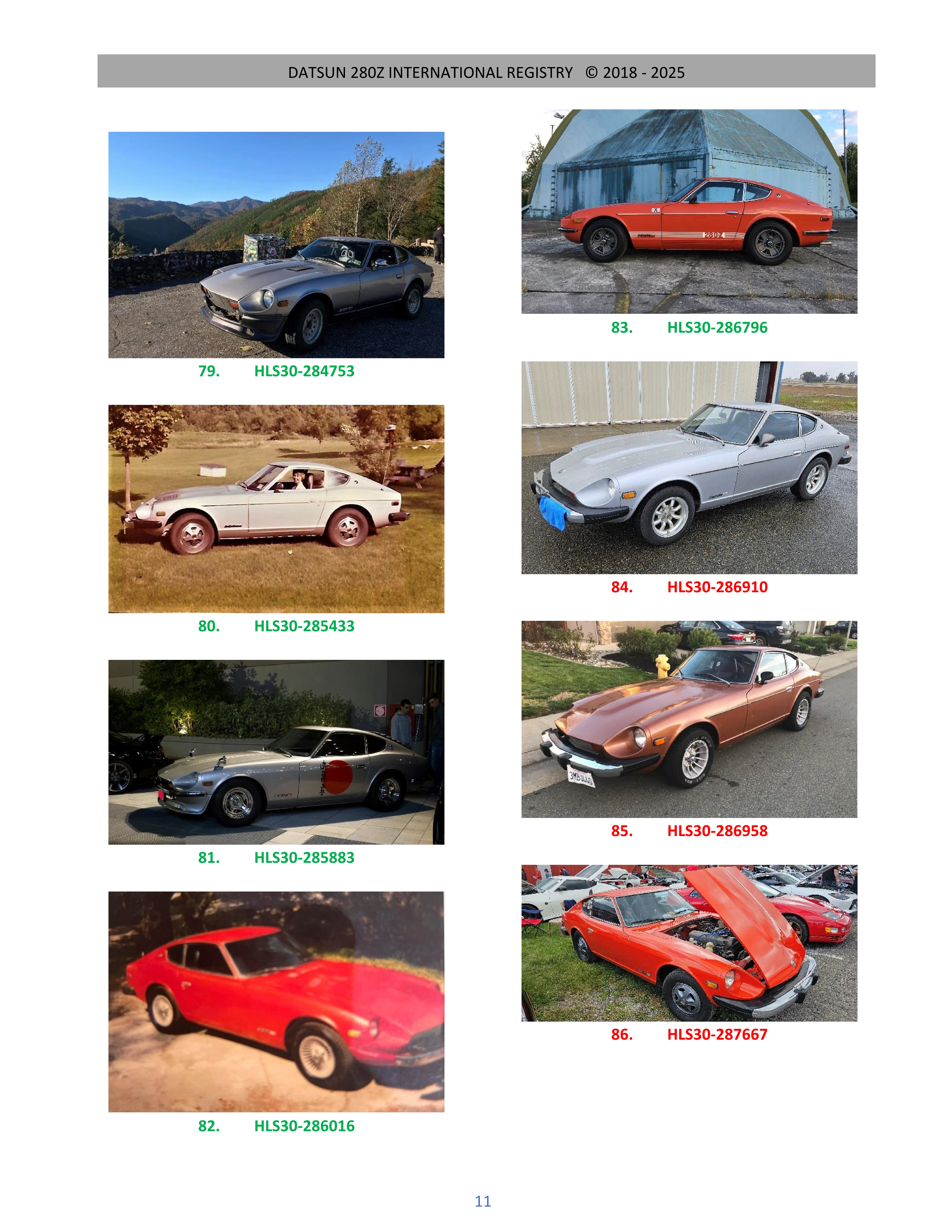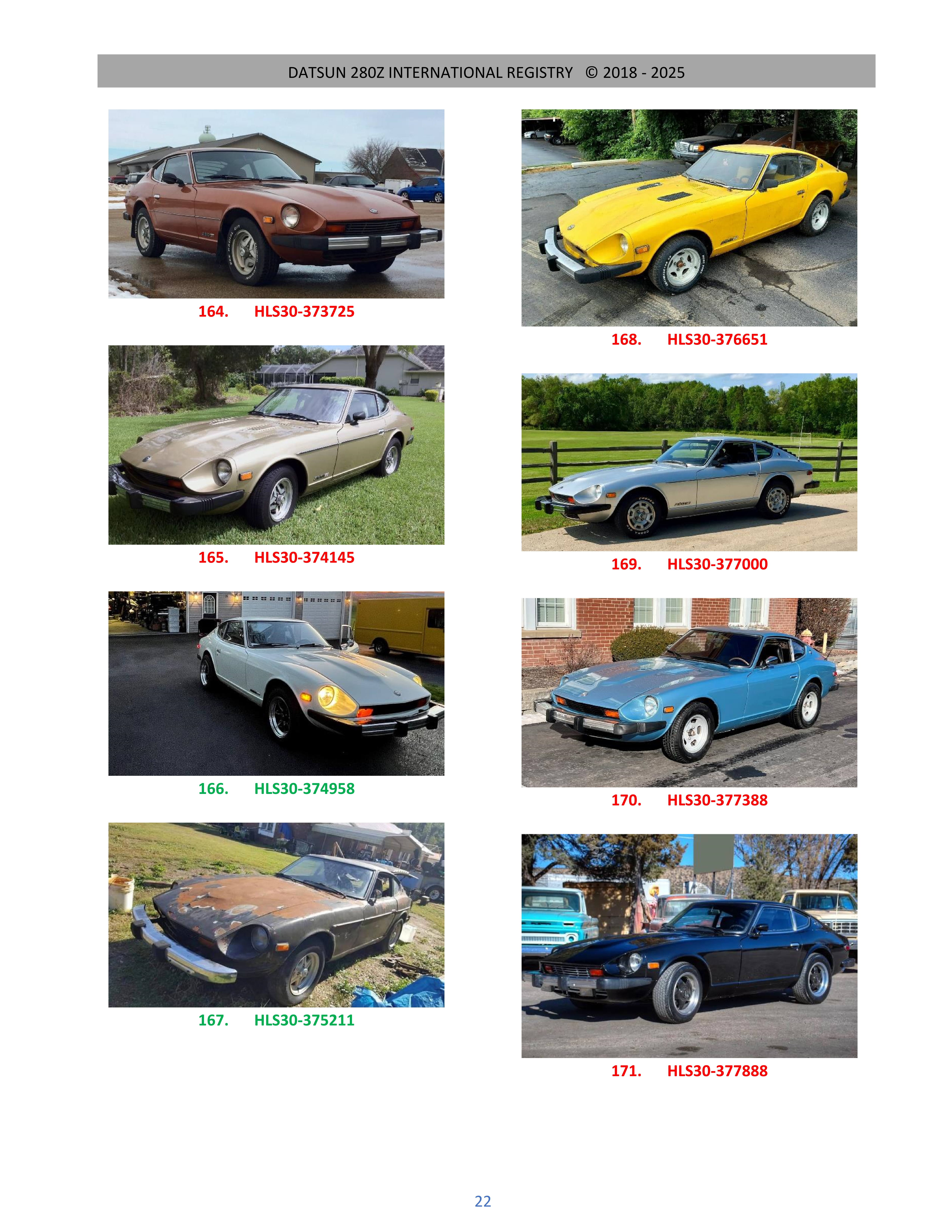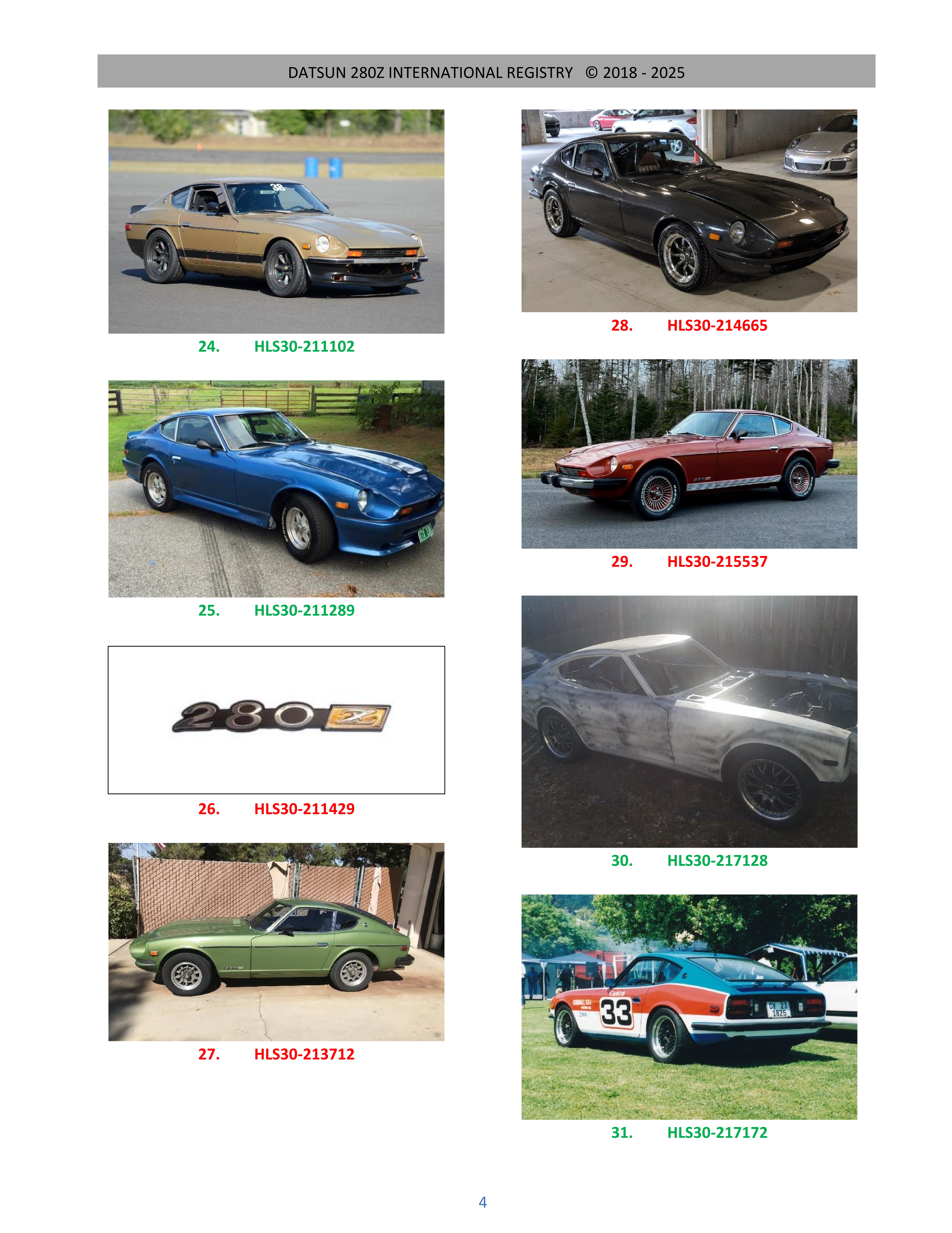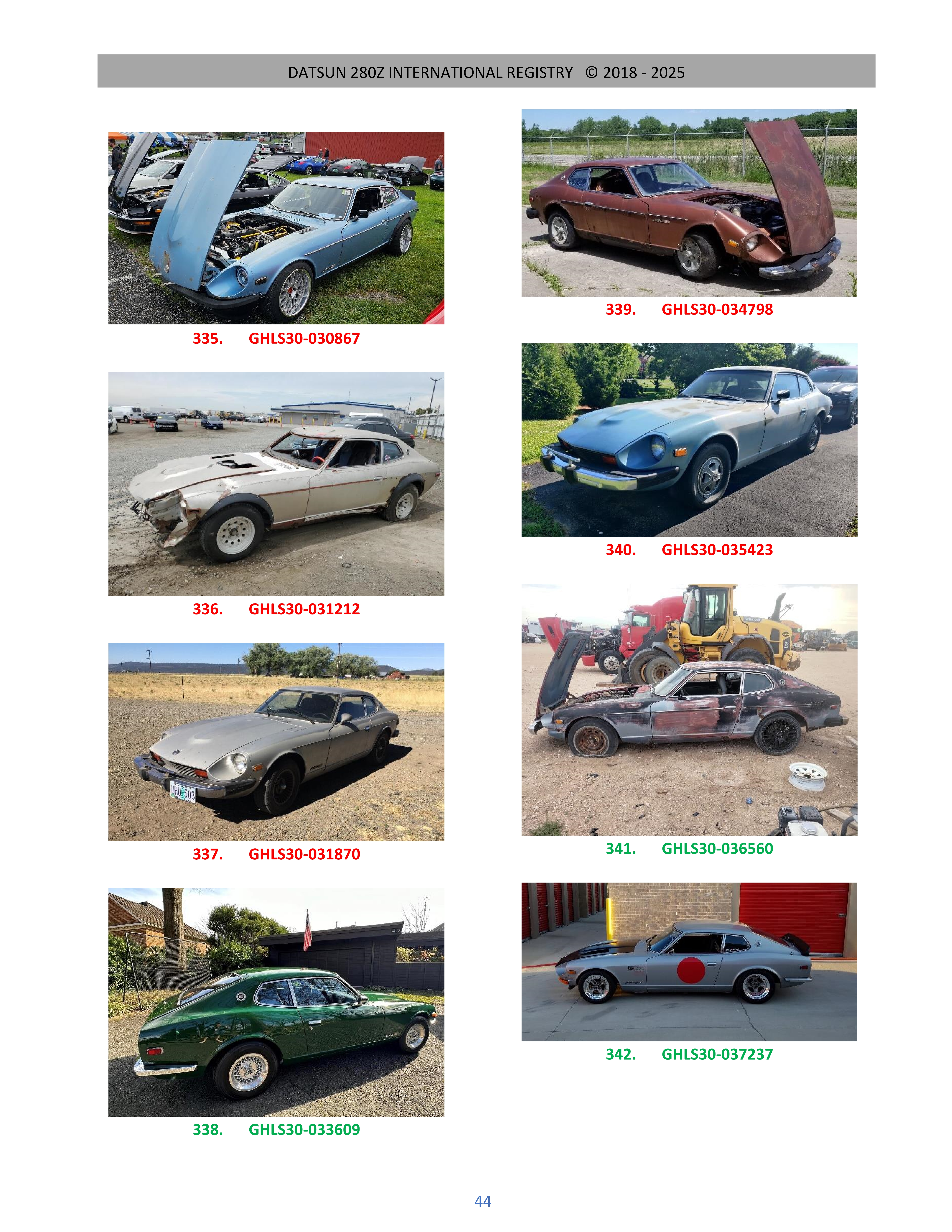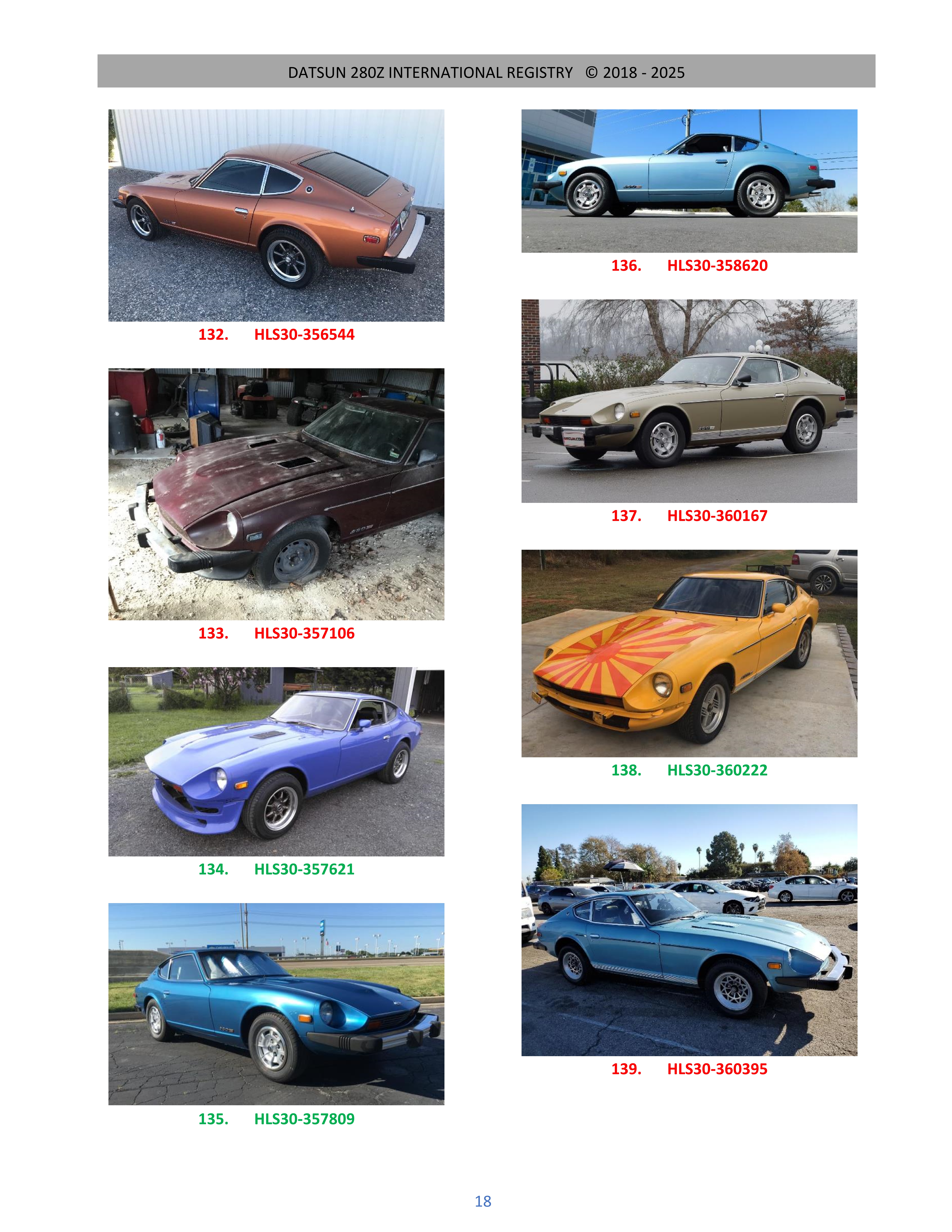 Over the past several years I have been building a database of all 280Zs that I know still exist or that I know their fate. Periodically I will be adding photos to show all of these 280Zs. I have now included GHLS30 models. So far, there are 49 pages worth, 363 cars. I have many more to post. 280Zs that are currently in the registry are listed with green VINs. 280Zs that are not registered are listed with red VINs. Zs that I don’t have a picture of will be shown with a 280Z emblem. I have also added L28 engines that are know to be displaced from their original 280Zs. There are 37 engines listed so far.