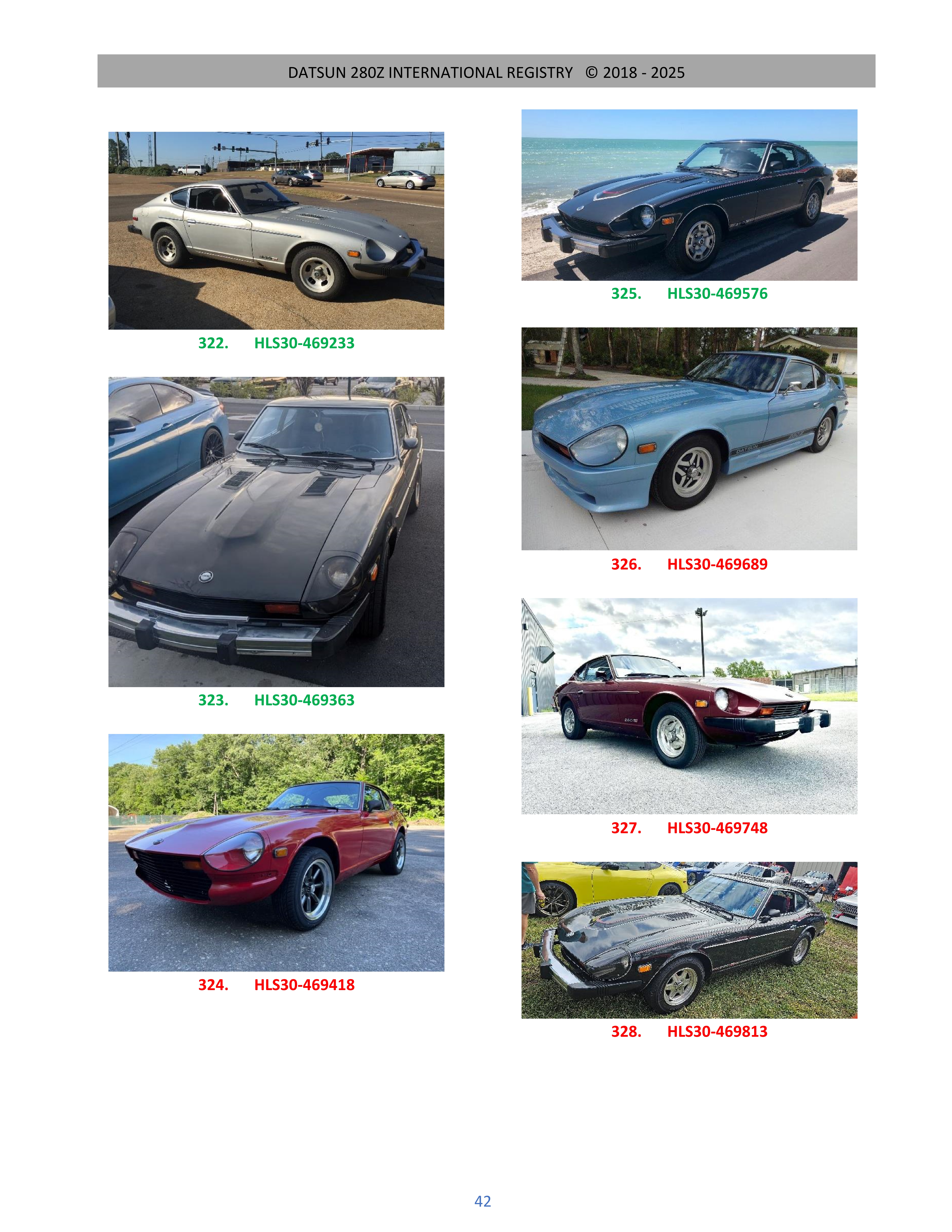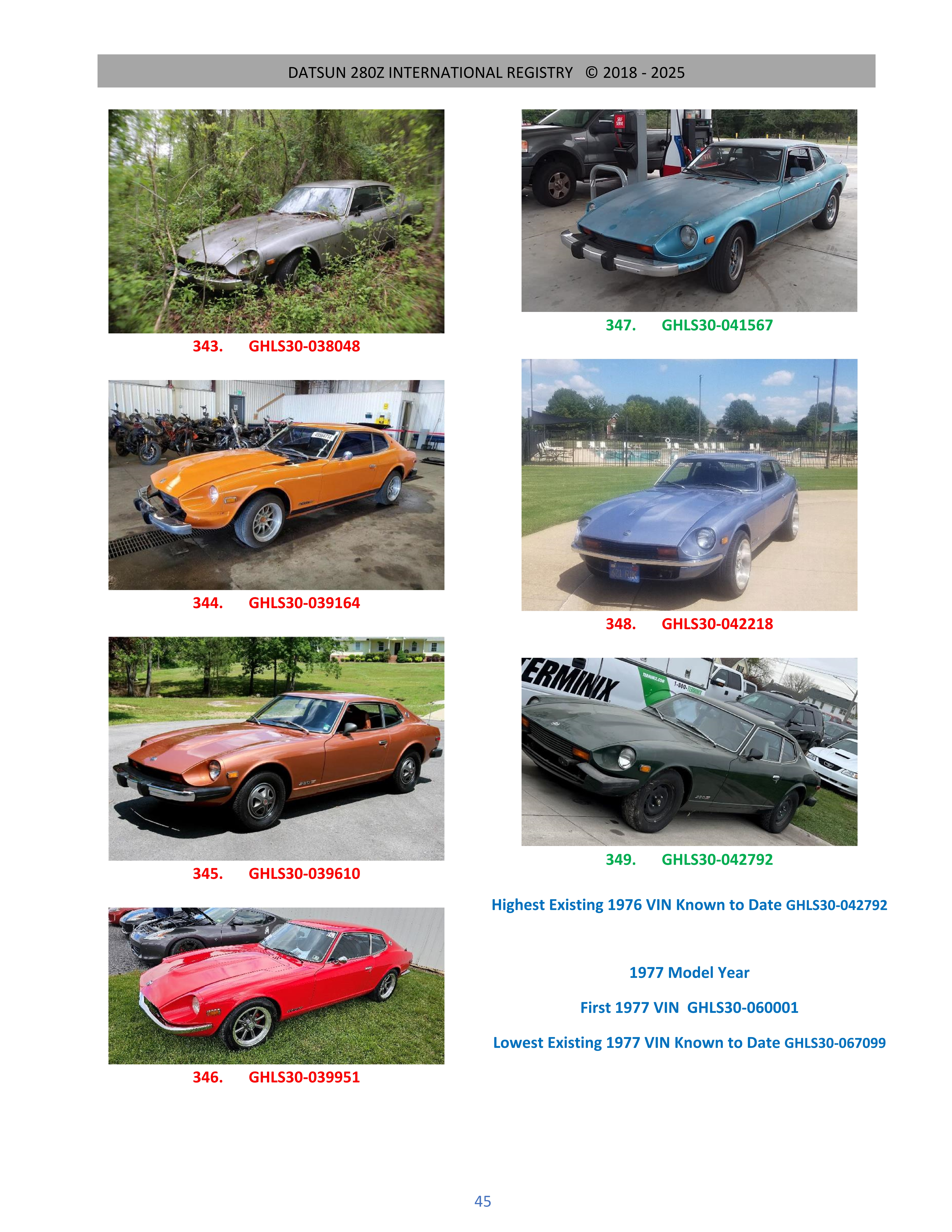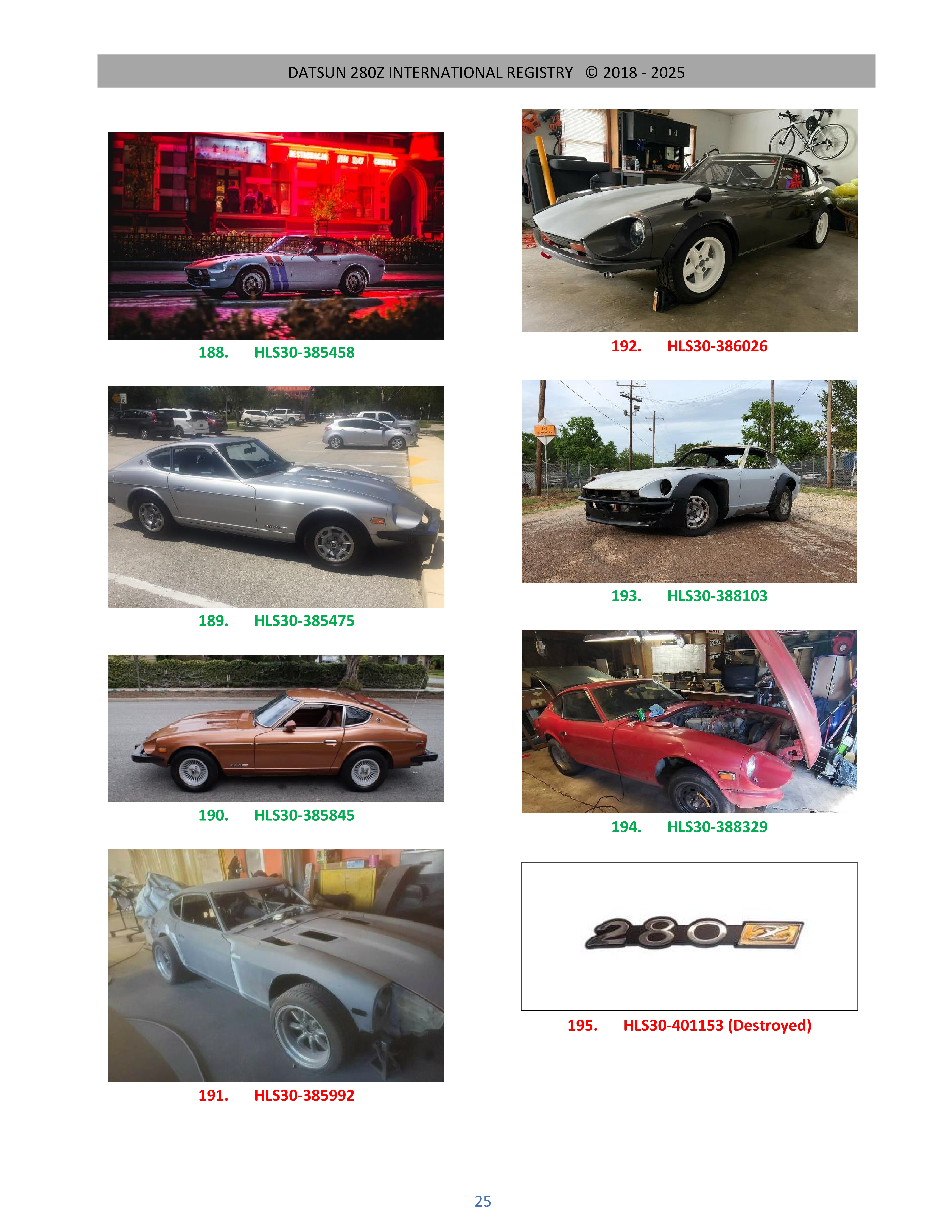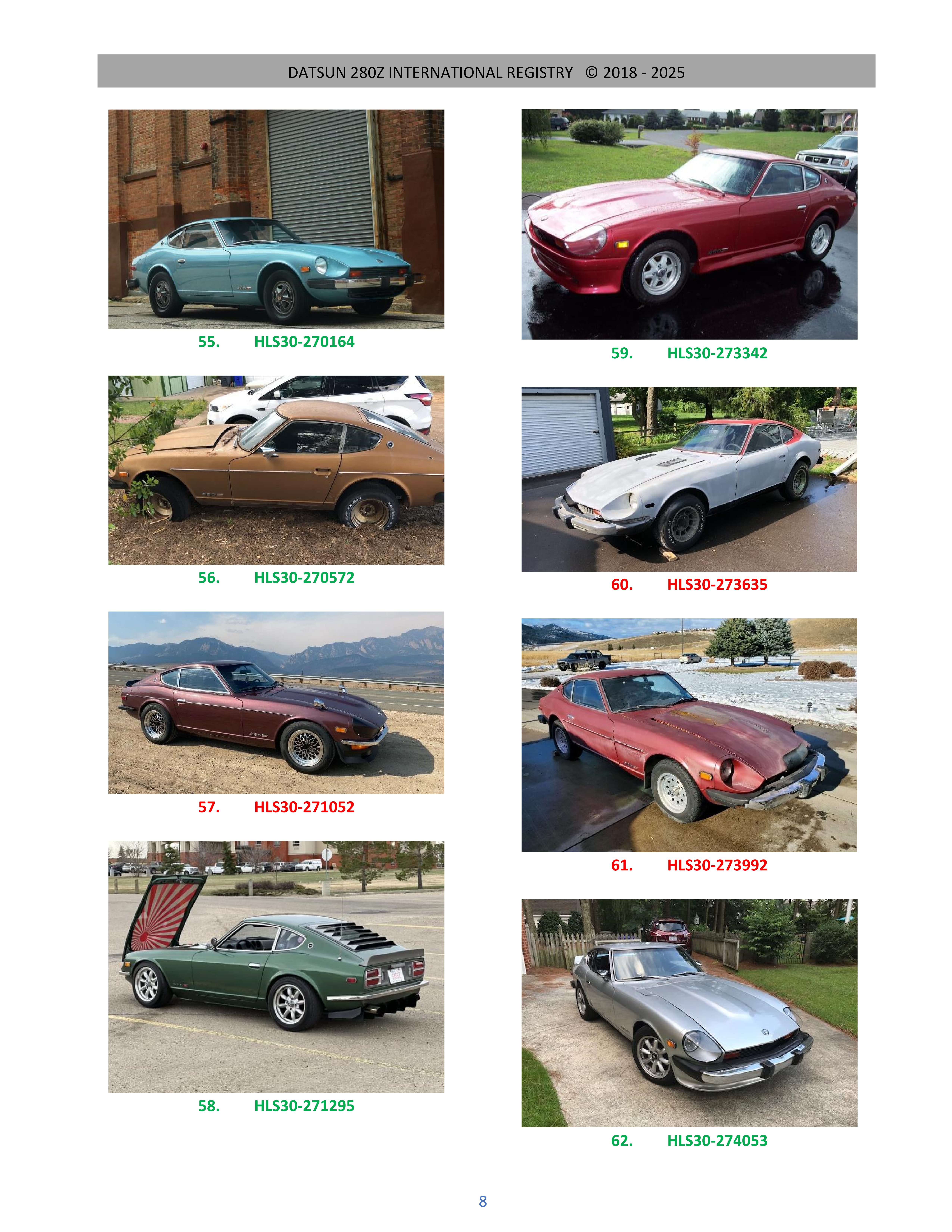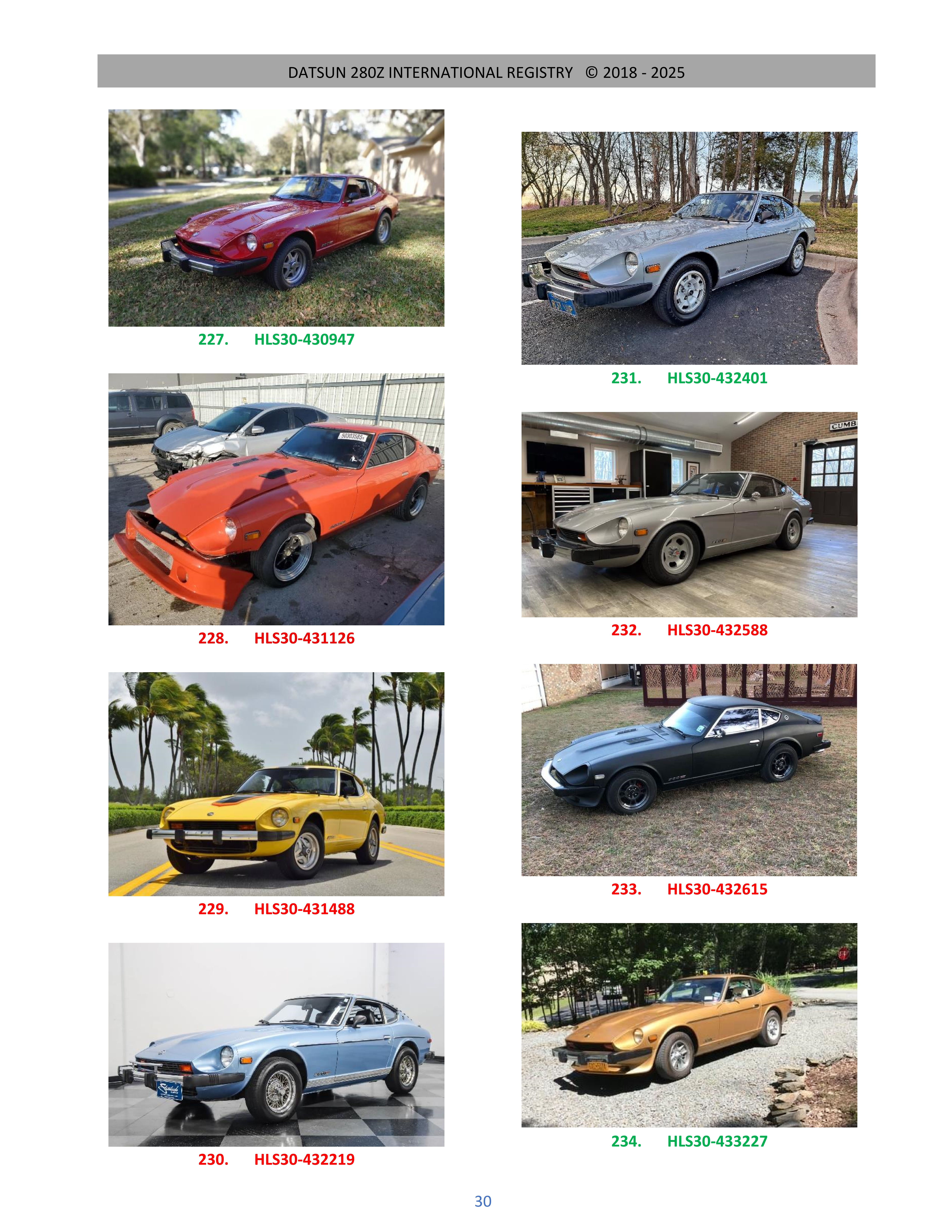 Over the past several years I have been building a database of all 280Zs that I know still exist or that I know their fate. Periodically I will be adding photos to show all of these 280Zs. I have now included GHLS30 models. So far, there are 49 pages worth, 363 cars. I have many more to post. 280Zs that are currently in the registry are listed with green VINs. 280Zs that are not registered are listed with red VINs. Zs that I don’t have a picture of will be shown with a 280Z emblem. I have also added L28 engines that are know to be displaced from their original 280Zs. There are 37 engines listed so far.