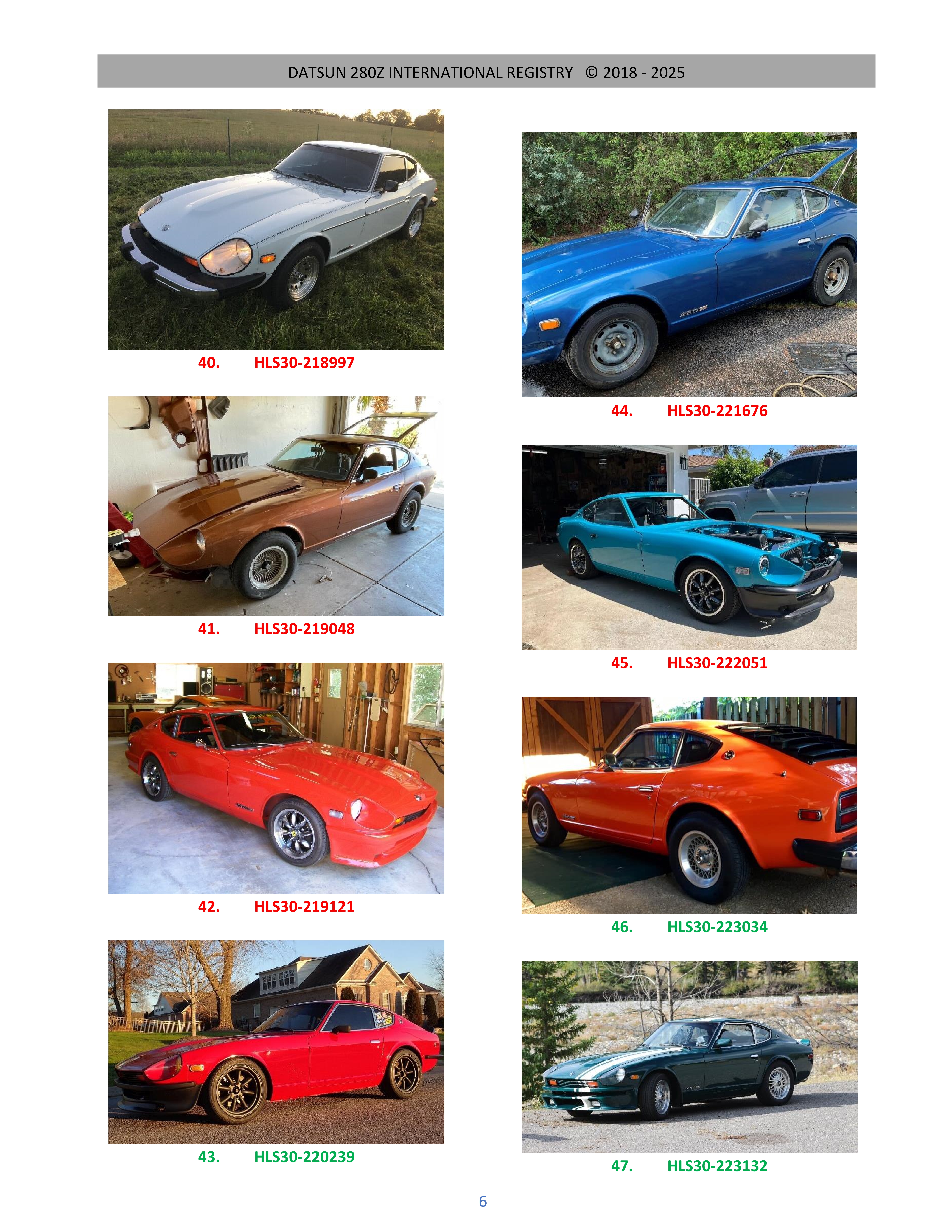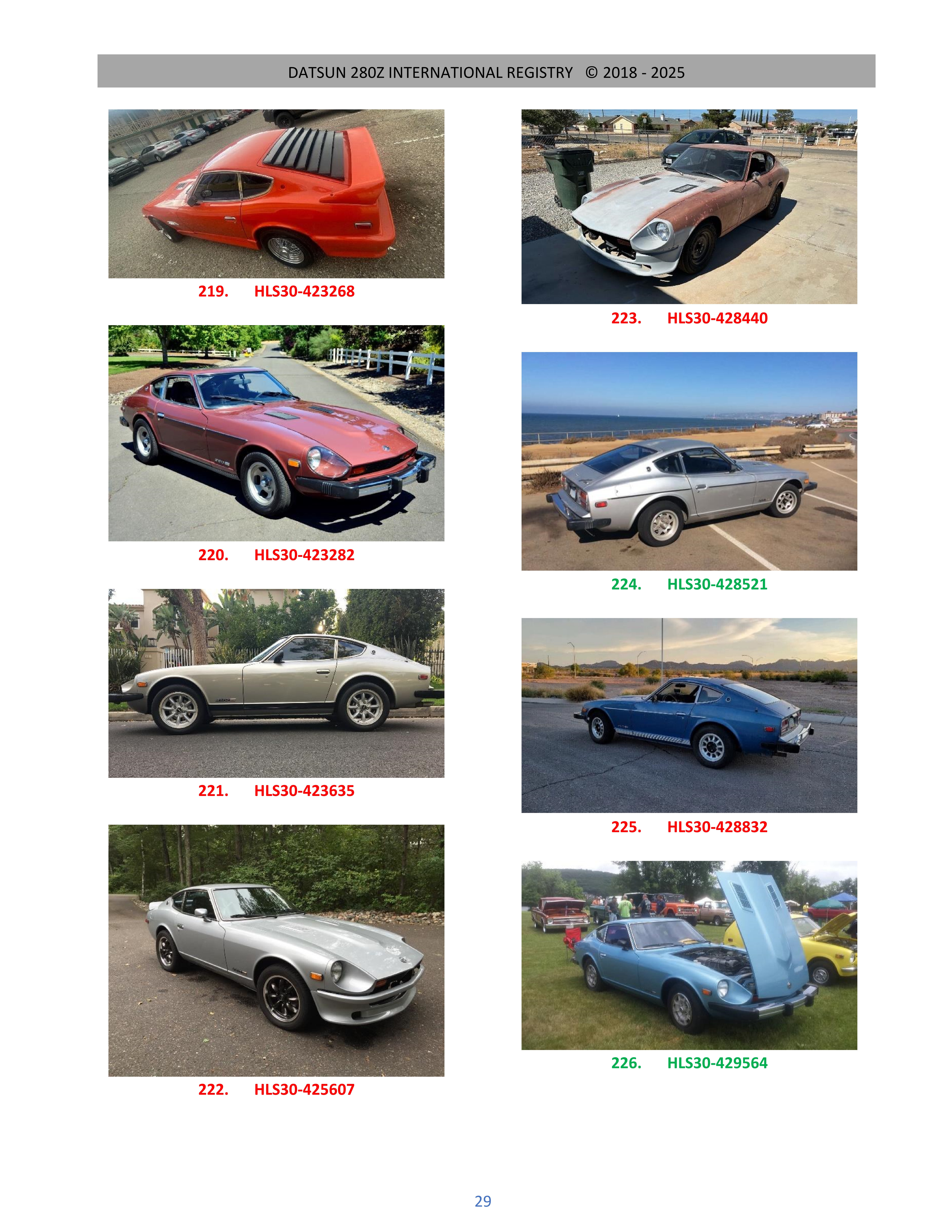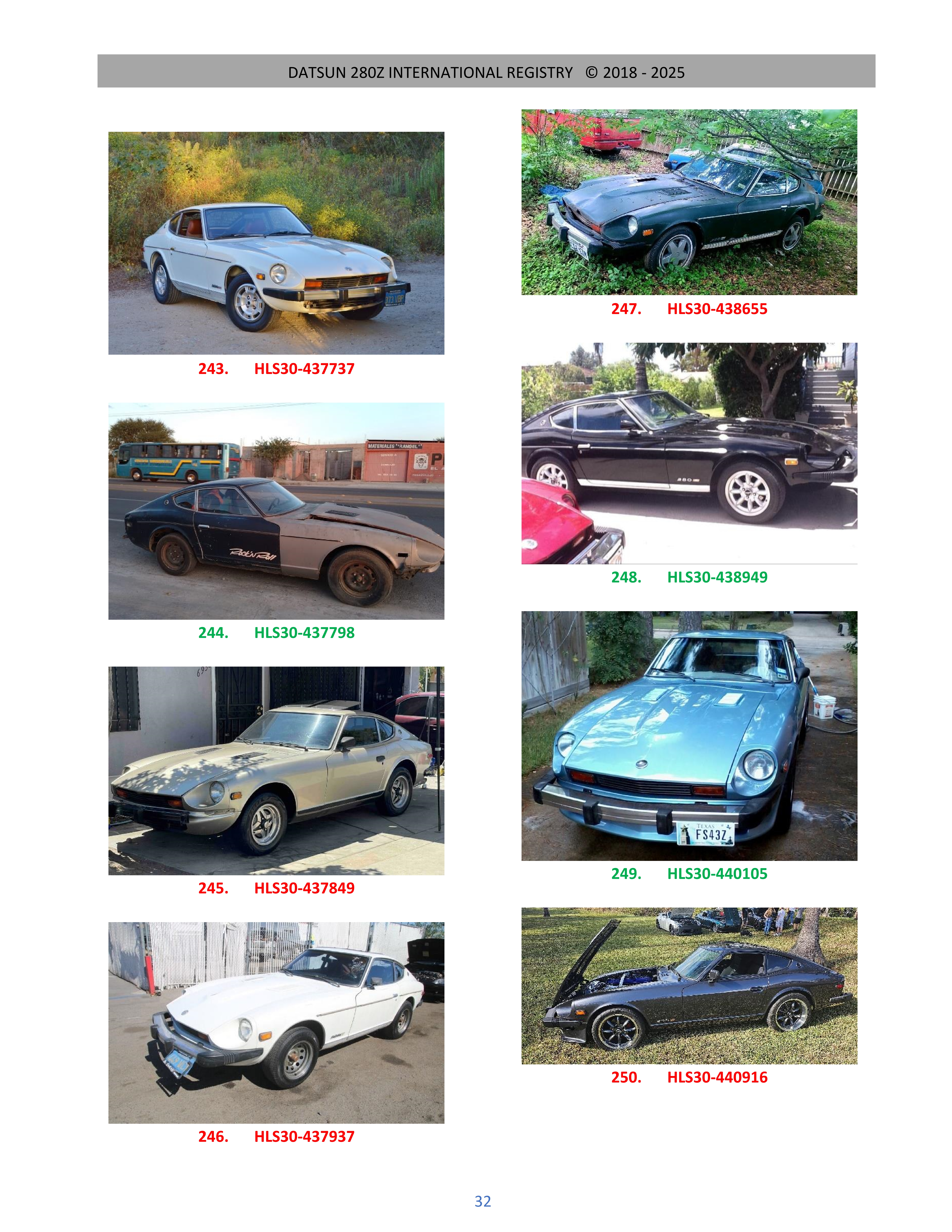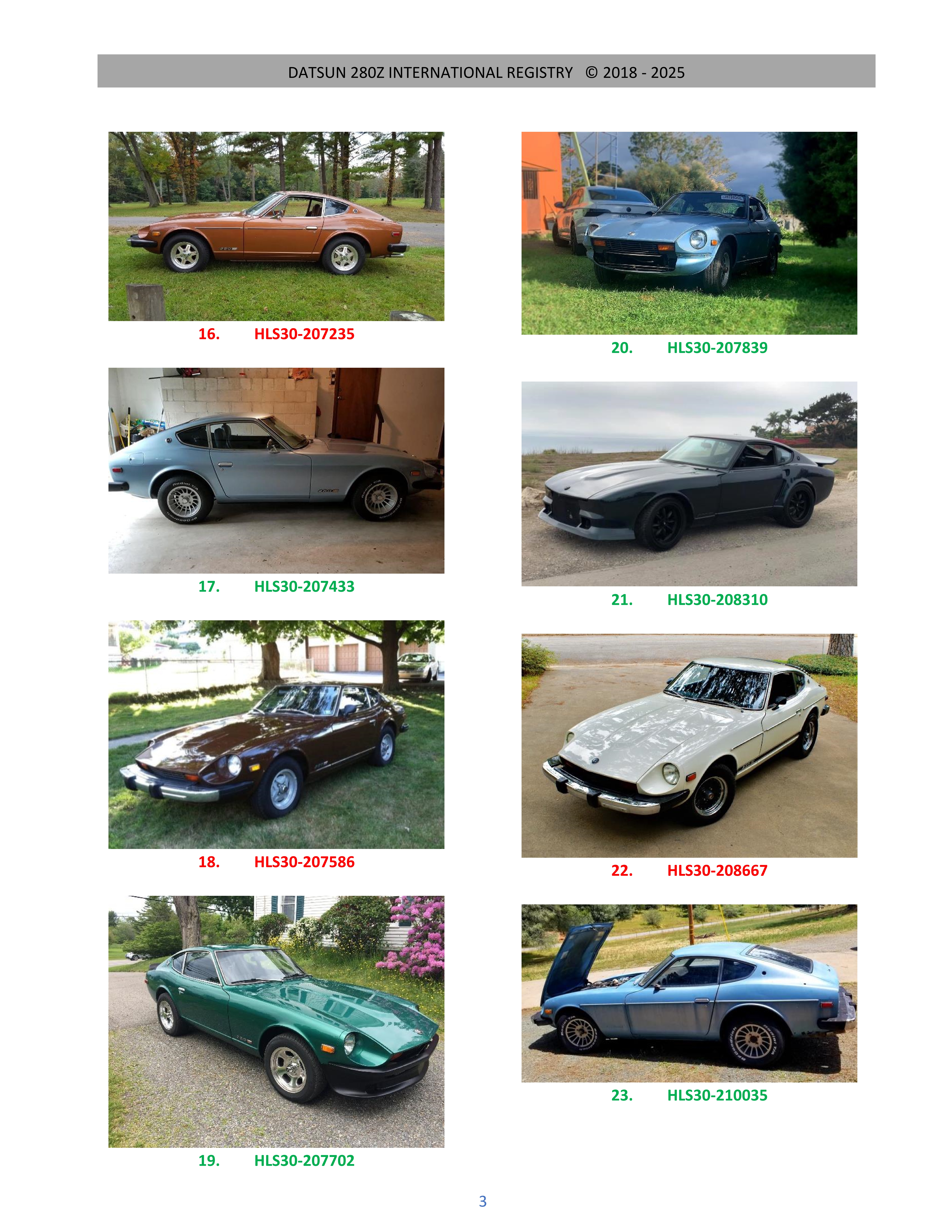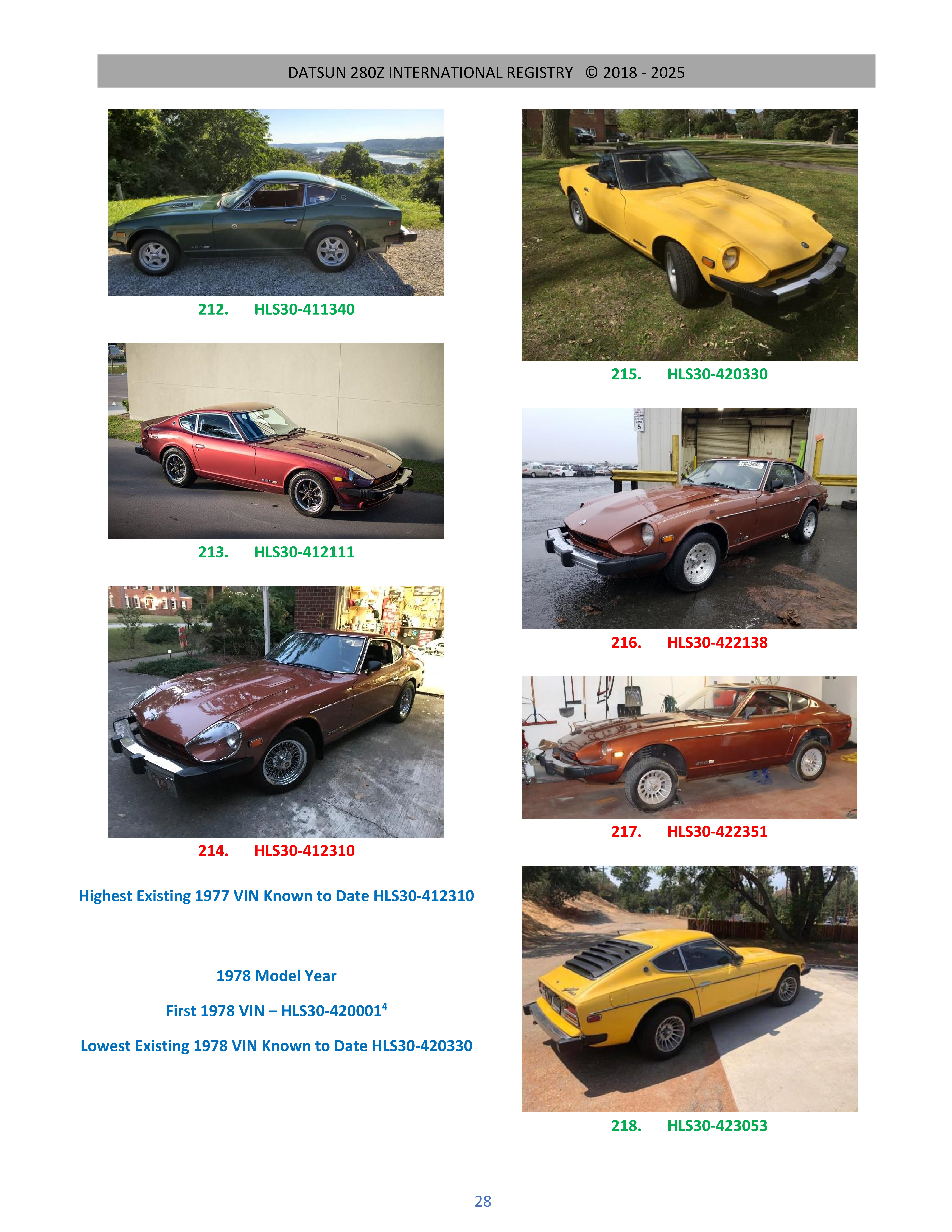 Over the past several years I have been building a database of all 280Zs that I know still exist or that I know their fate. Periodically I will be adding photos to show all of these 280Zs. I have now included GHLS30 models. So far, there are 49 pages worth, 363 cars. I have many more to post. 280Zs that are currently in the registry are listed with green VINs. 280Zs that are not registered are listed with red VINs. Zs that I don’t have a picture of will be shown with a 280Z emblem. I have also added L28 engines that are know to be displaced from their original 280Zs. There are 37 engines listed so far.