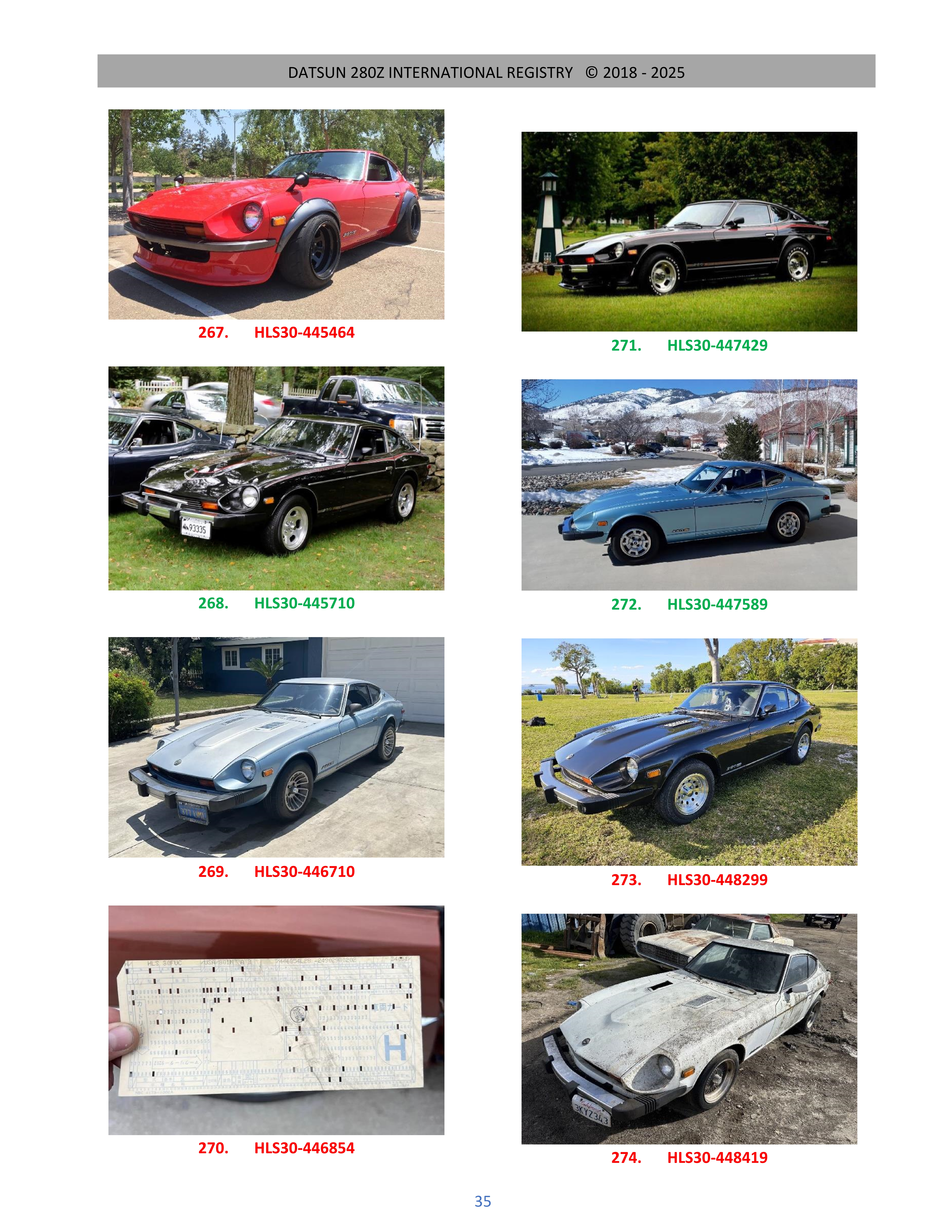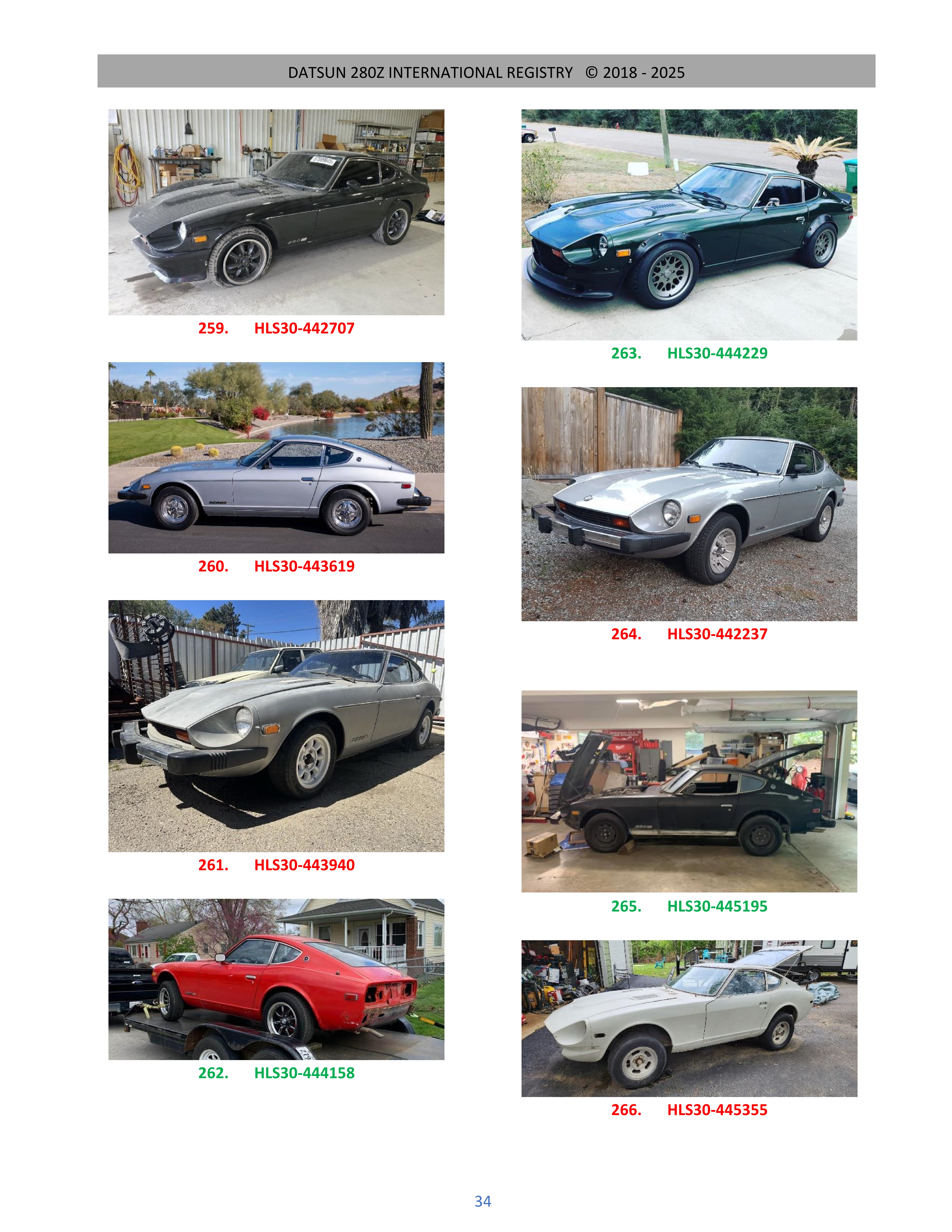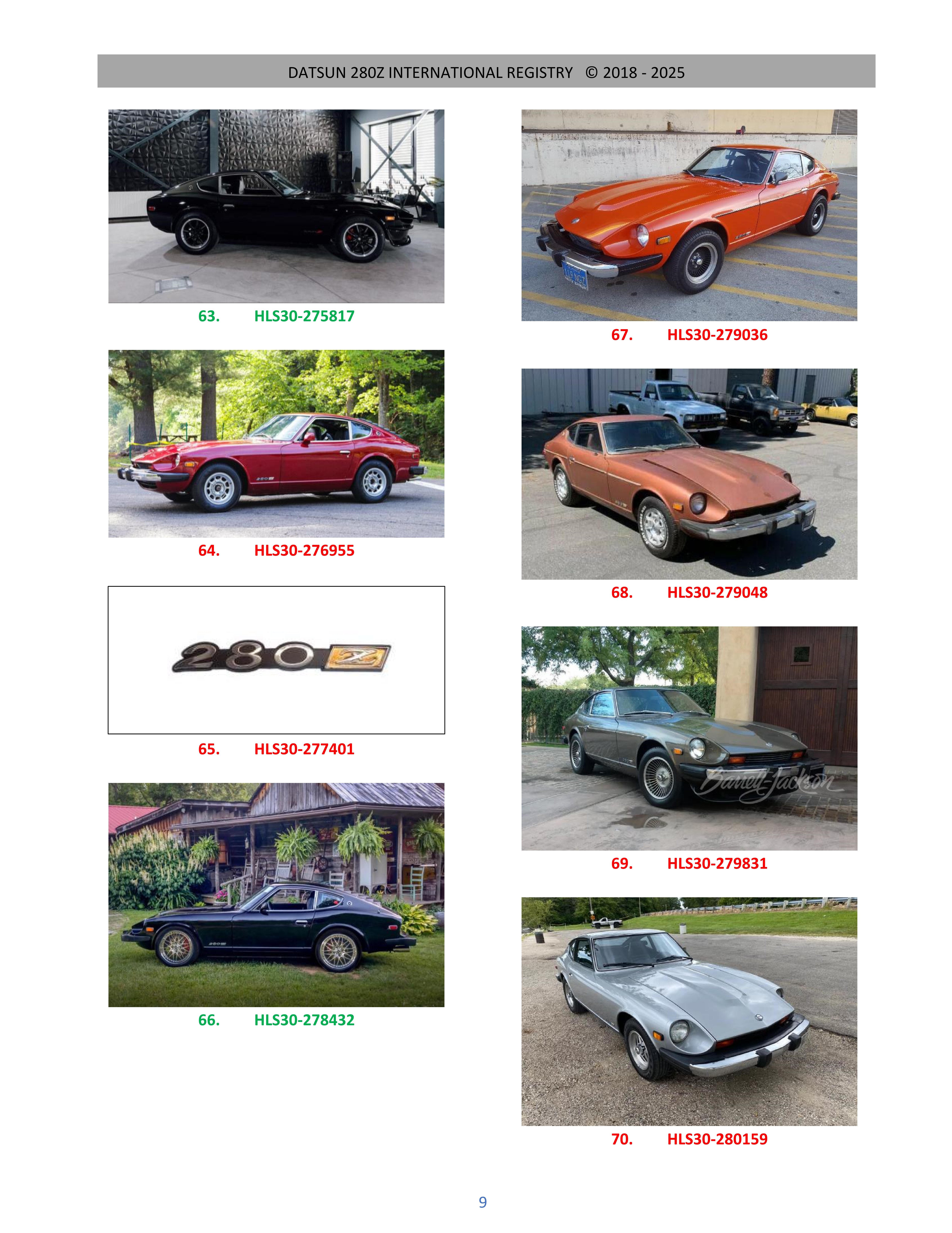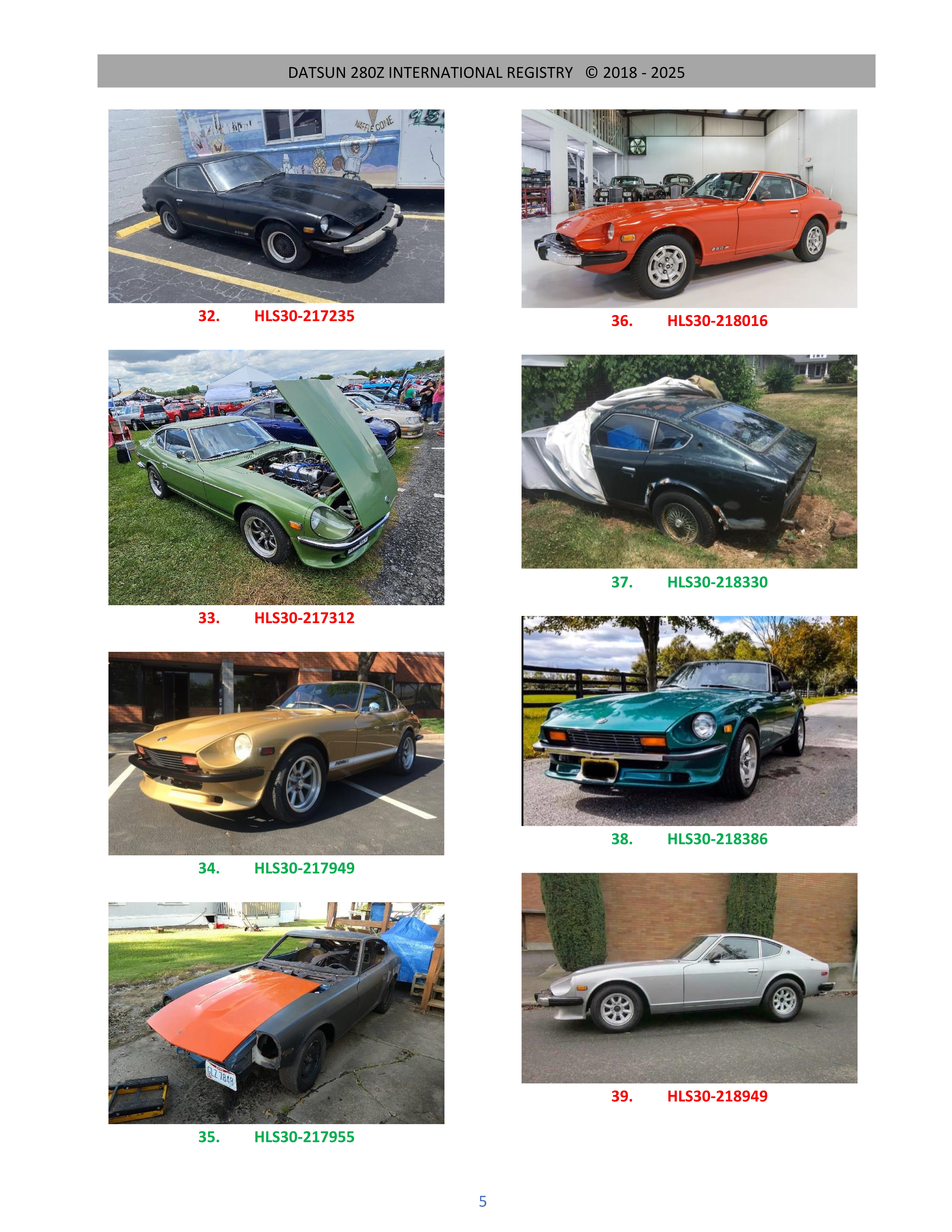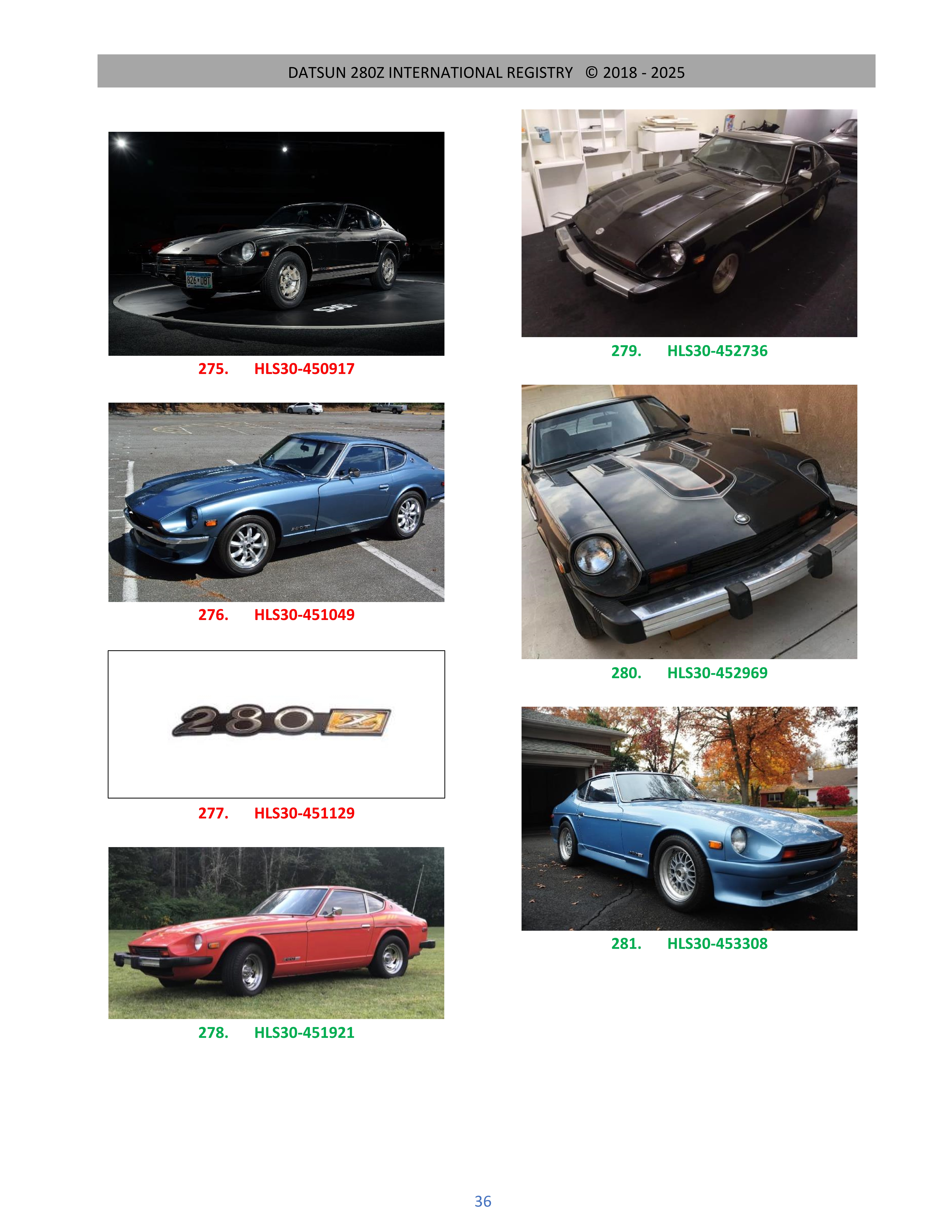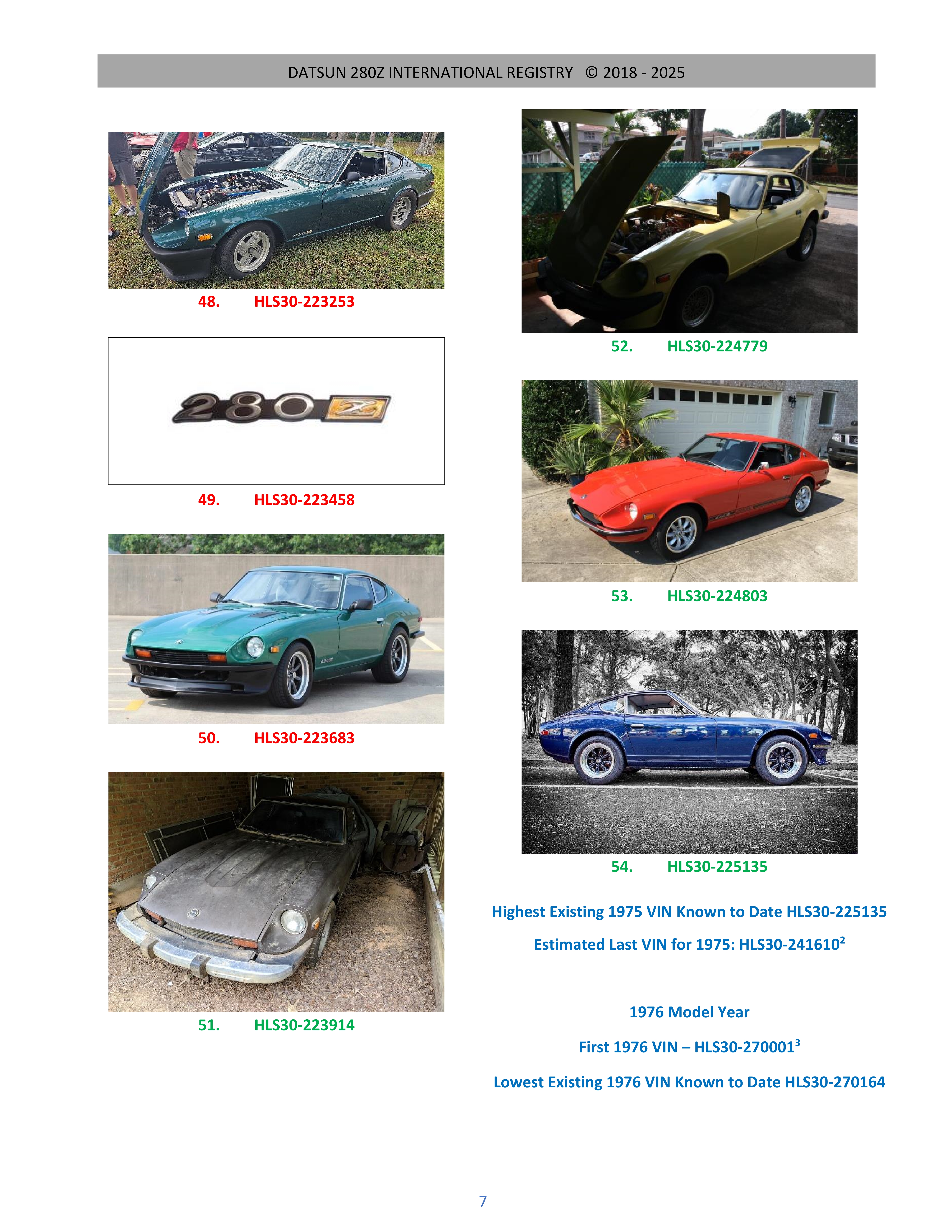 Over the past several years I have been building a database of all 280Zs that I know still exist or that I know their fate. Periodically I will be adding photos to show all of these 280Zs. I have now included GHLS30 models. So far, there are 49 pages worth, 363 cars. I have many more to post. 280Zs that are currently in the registry are listed with green VINs. 280Zs that are not registered are listed with red VINs. Zs that I don’t have a picture of will be shown with a 280Z emblem. I have also added L28 engines that are know to be displaced from their original 280Zs. There are 37 engines listed so far.