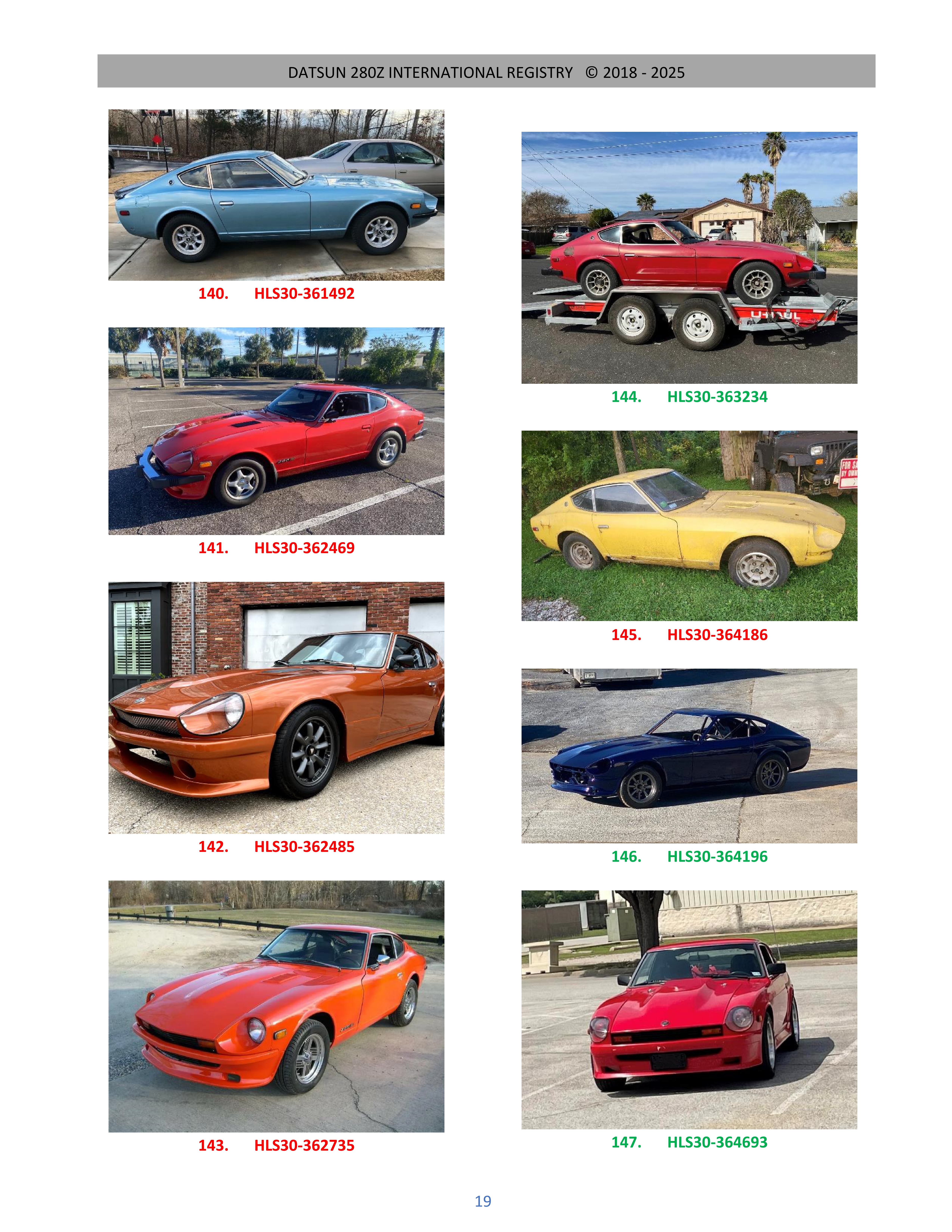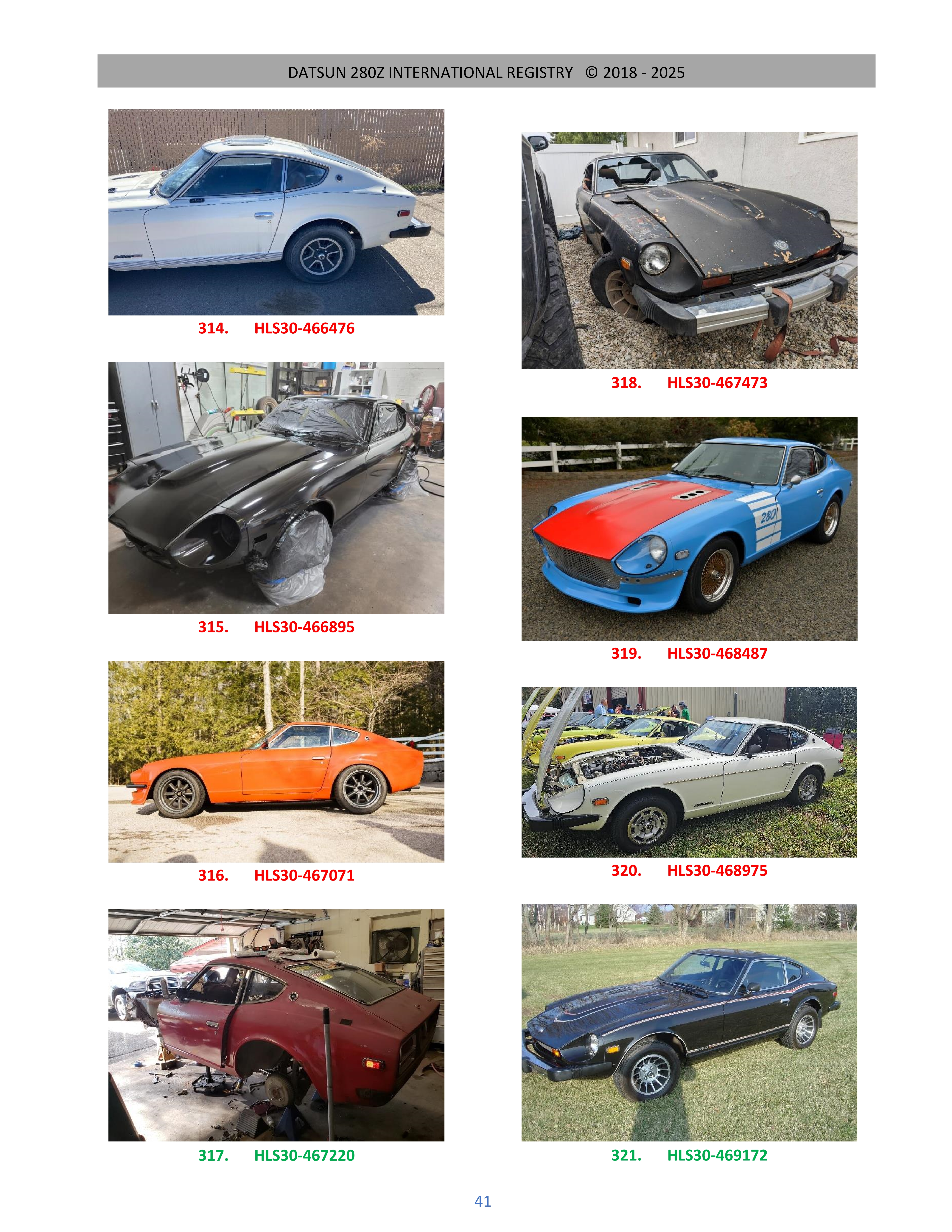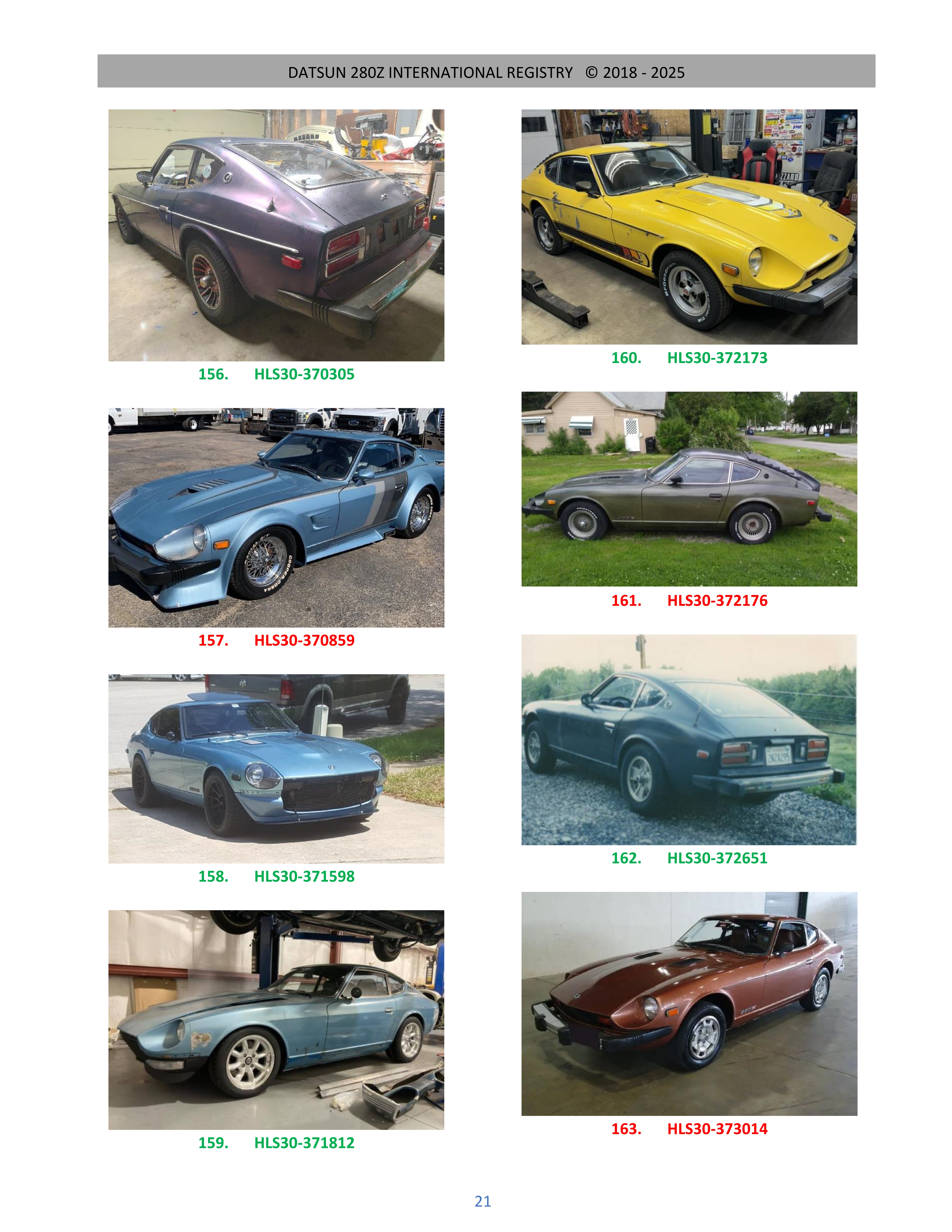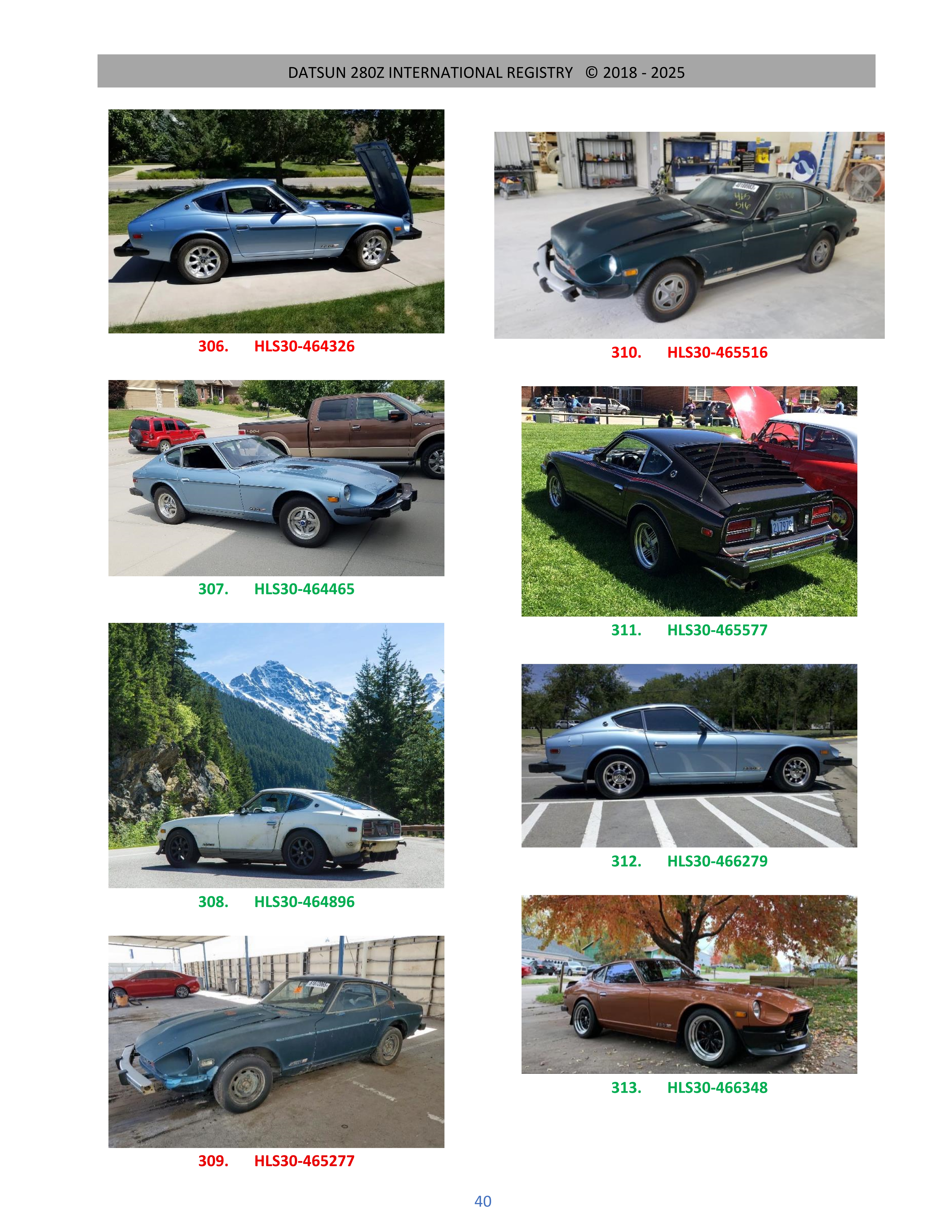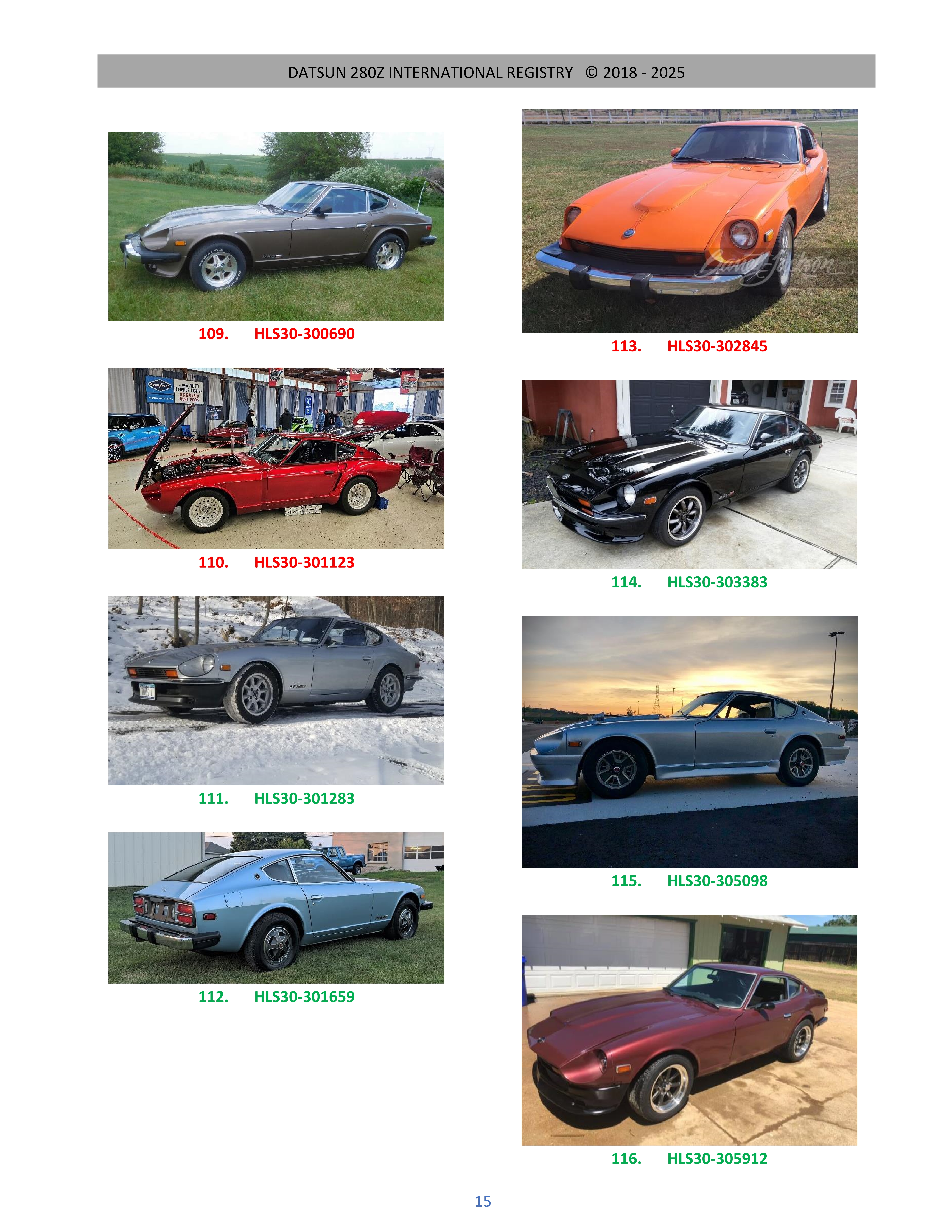 Over the past several years I have been building a database of all 280Zs that I know still exist or that I know their fate. Periodically I will be adding photos to show all of these 280Zs. I have now included GHLS30 models. So far, there are 49 pages worth, 363 cars. I have many more to post. 280Zs that are currently in the registry are listed with green VINs. 280Zs that are not registered are listed with red VINs. Zs that I don’t have a picture of will be shown with a 280Z emblem. I have also added L28 engines that are know to be displaced from their original 280Zs. There are 37 engines listed so far.