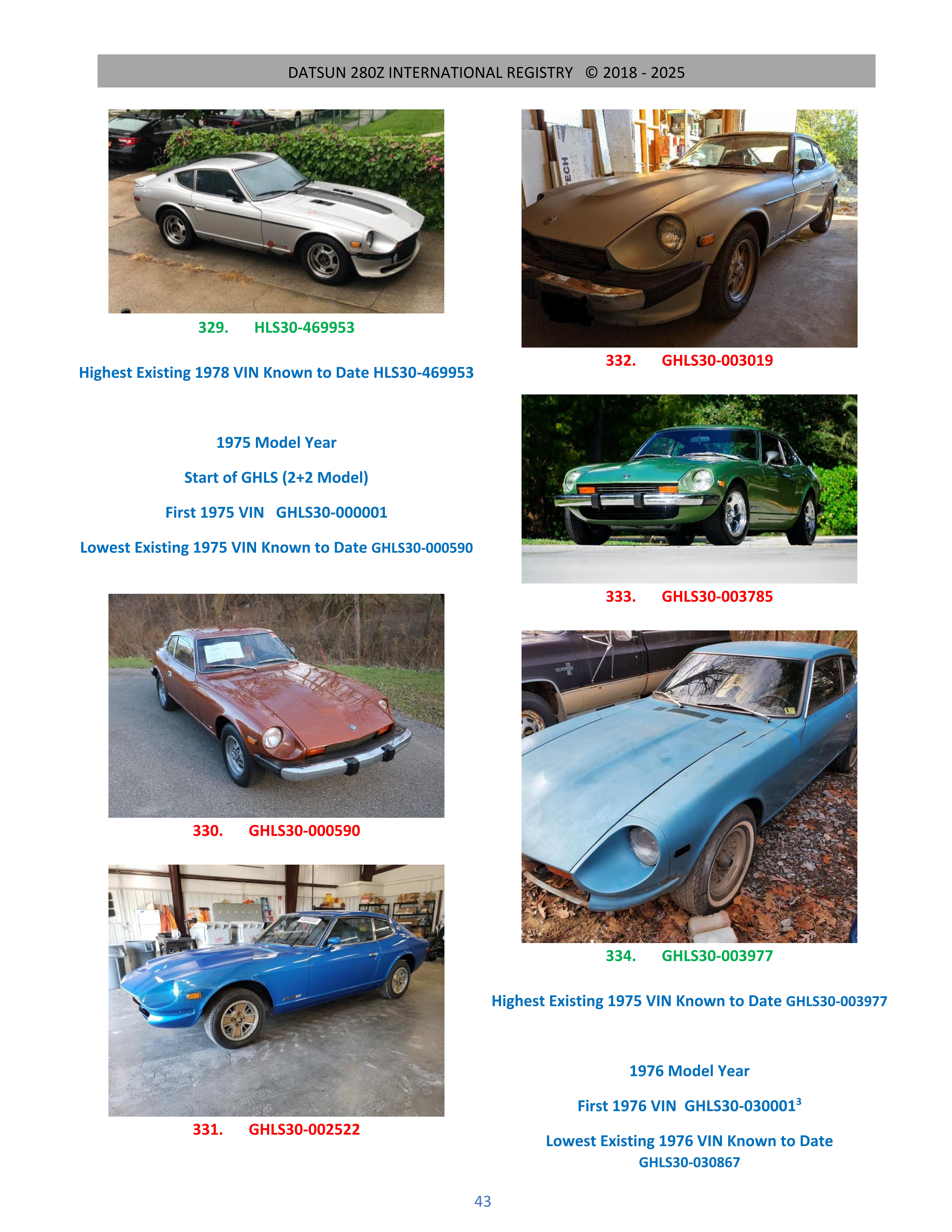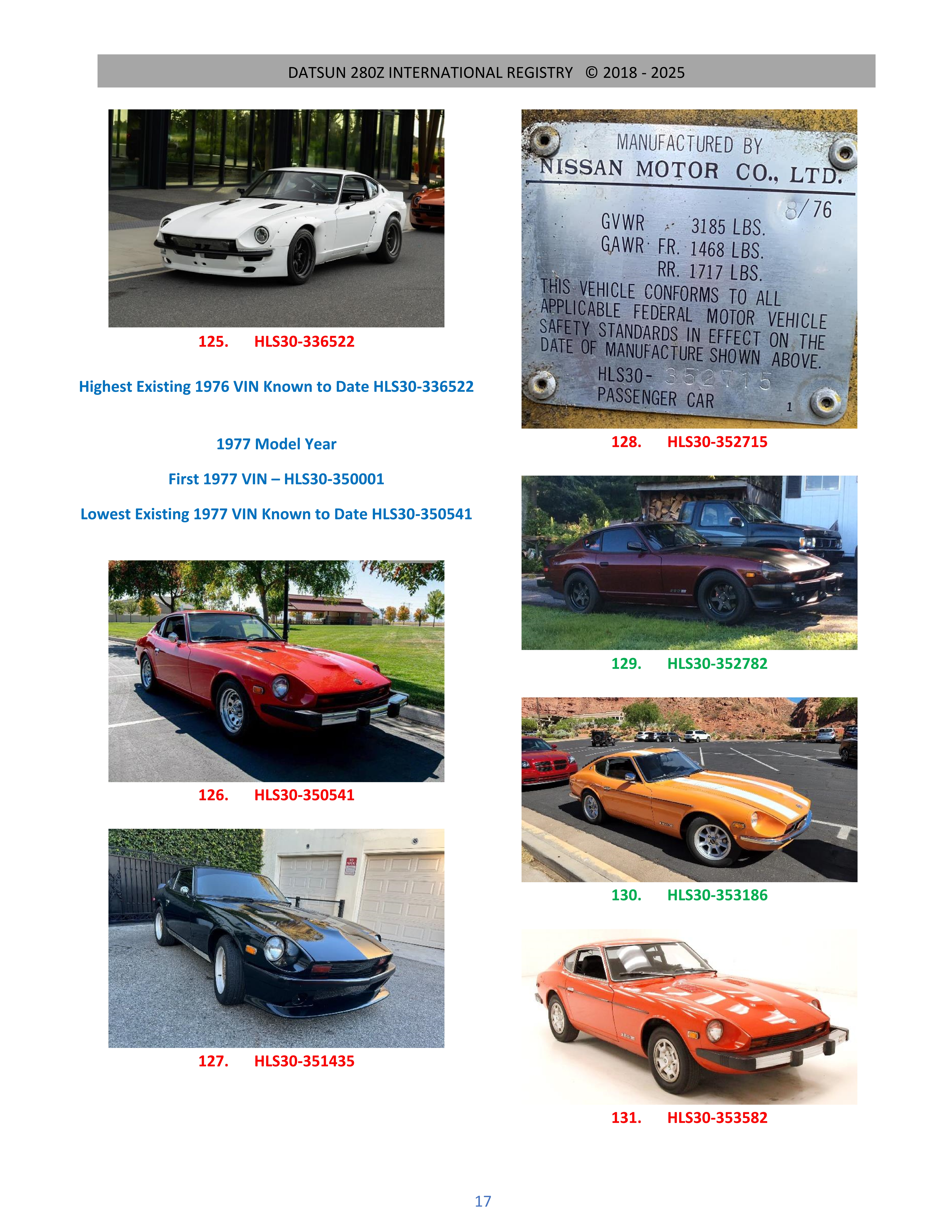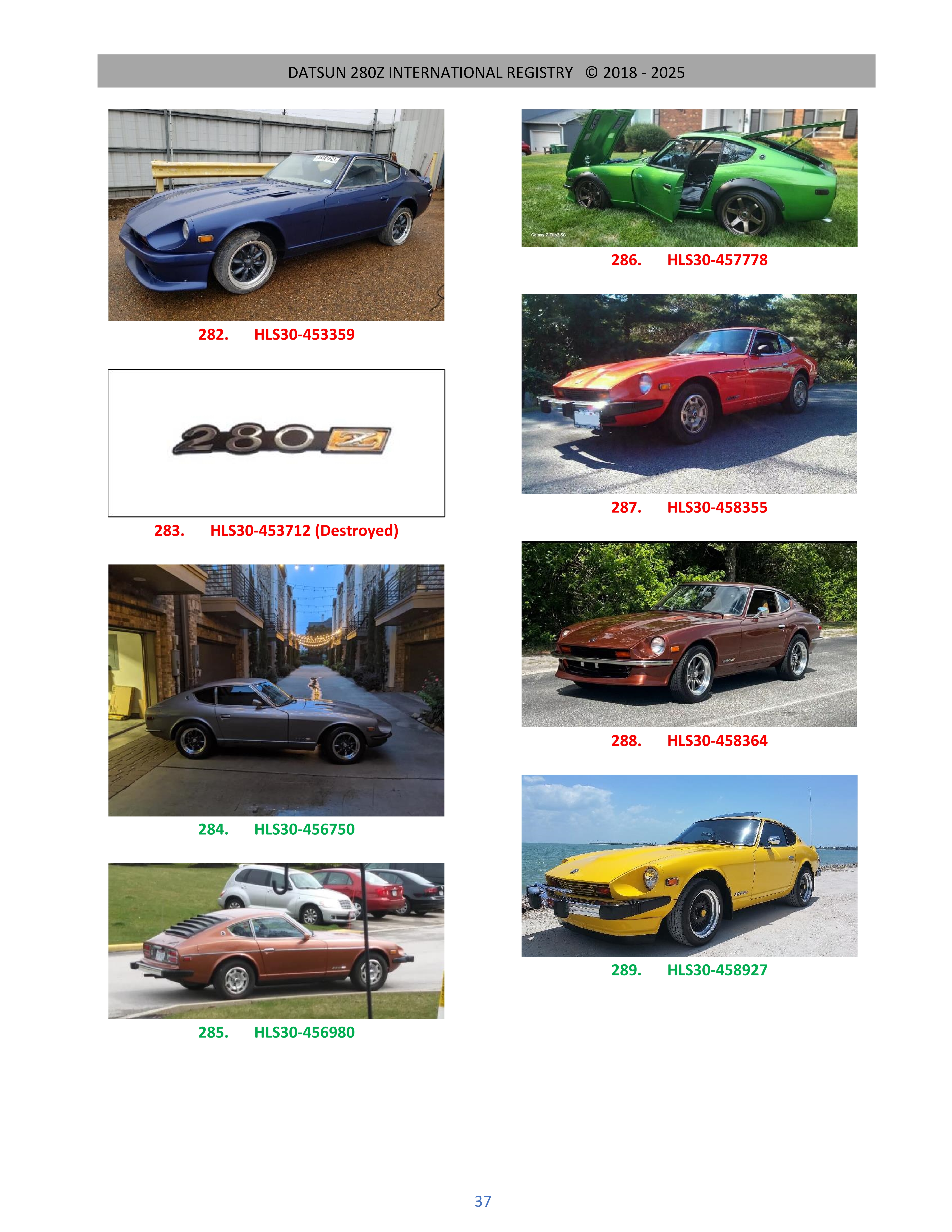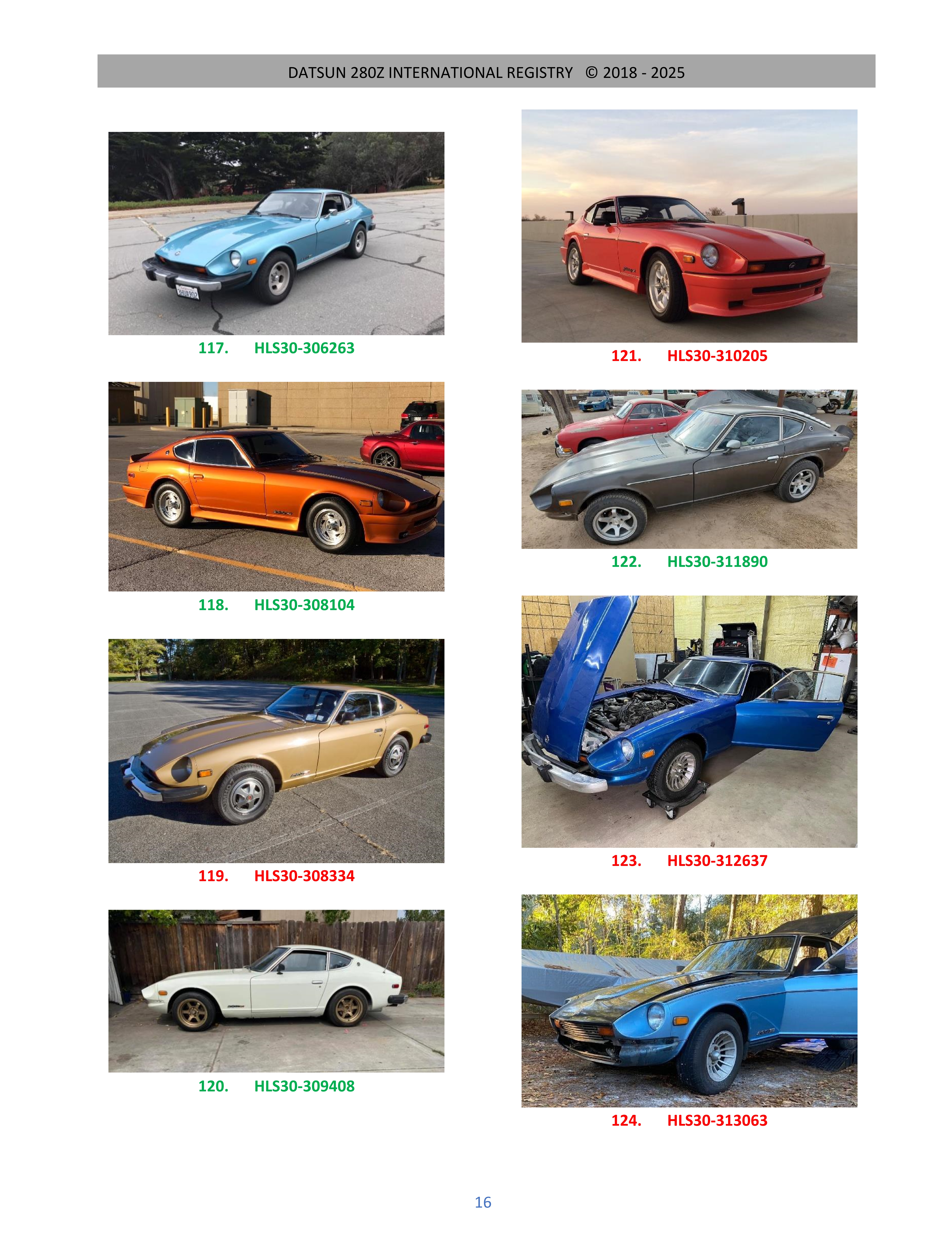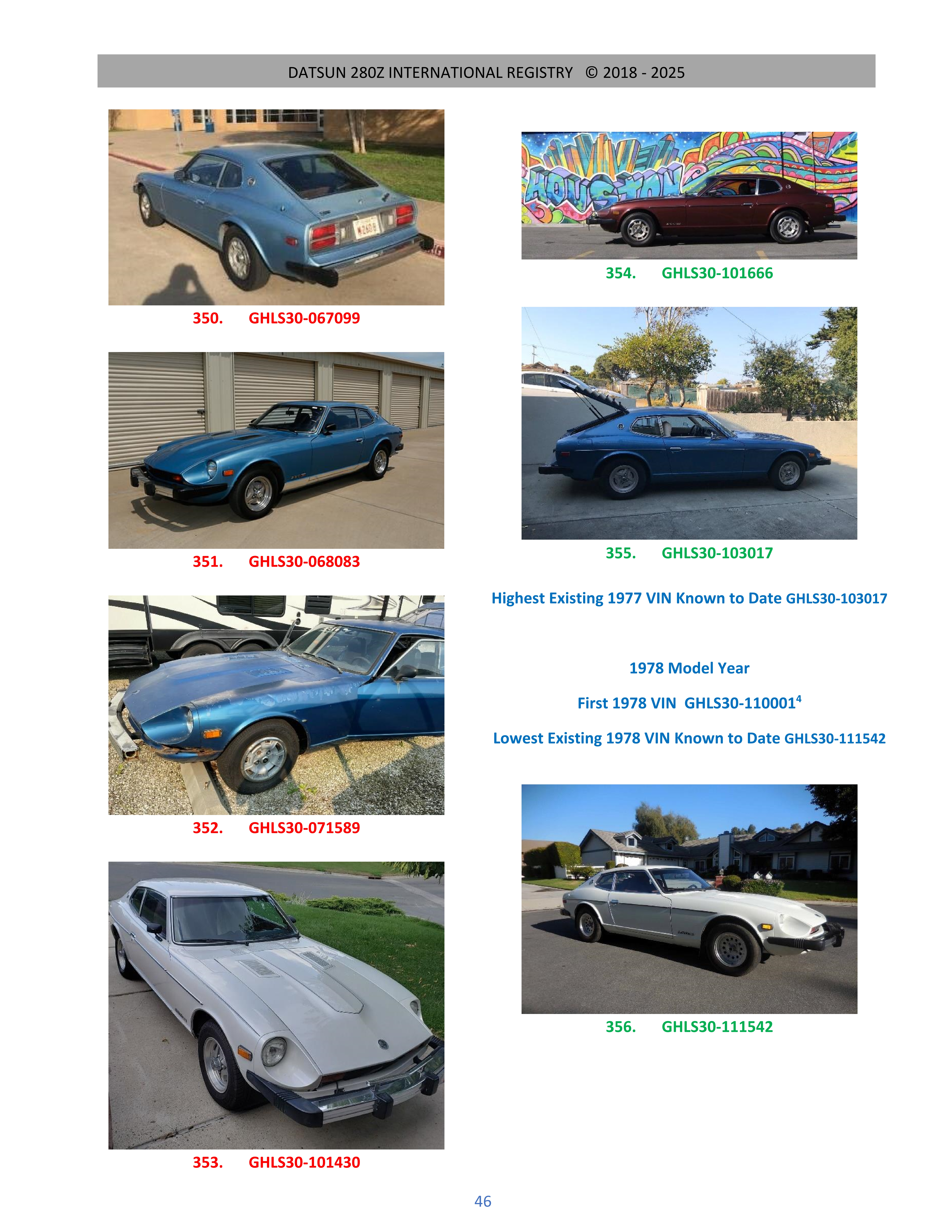 Over the past several years I have been building a database of all 280Zs that I know still exist or that I know their fate. Periodically I will be adding photos to show all of these 280Zs. I have now included GHLS30 models. So far, there are 49 pages worth, 363 cars. I have many more to post. 280Zs that are currently in the registry are listed with green VINs. 280Zs that are not registered are listed with red VINs. Zs that I don’t have a picture of will be shown with a 280Z emblem. I have also added L28 engines that are know to be displaced from their original 280Zs. There are 37 engines listed so far.