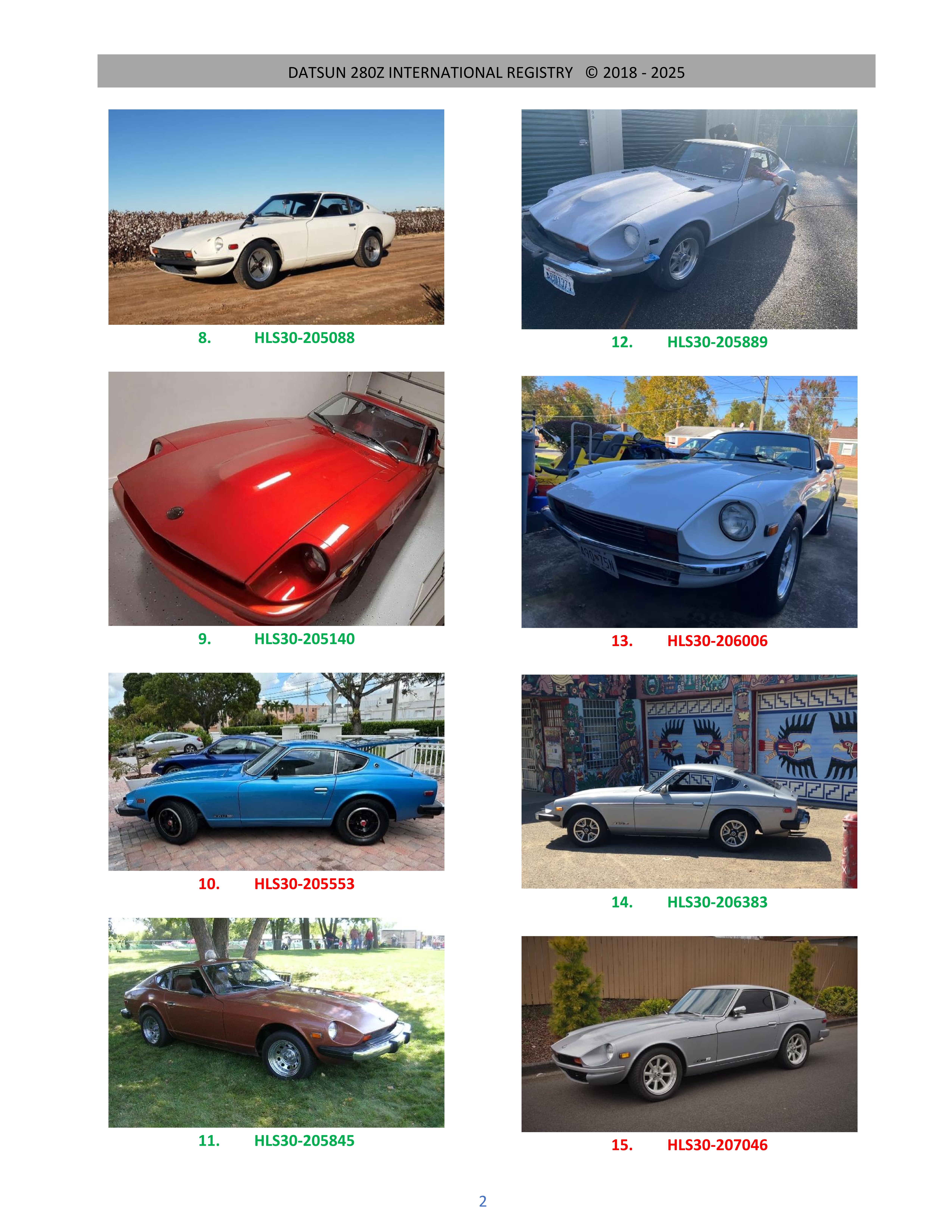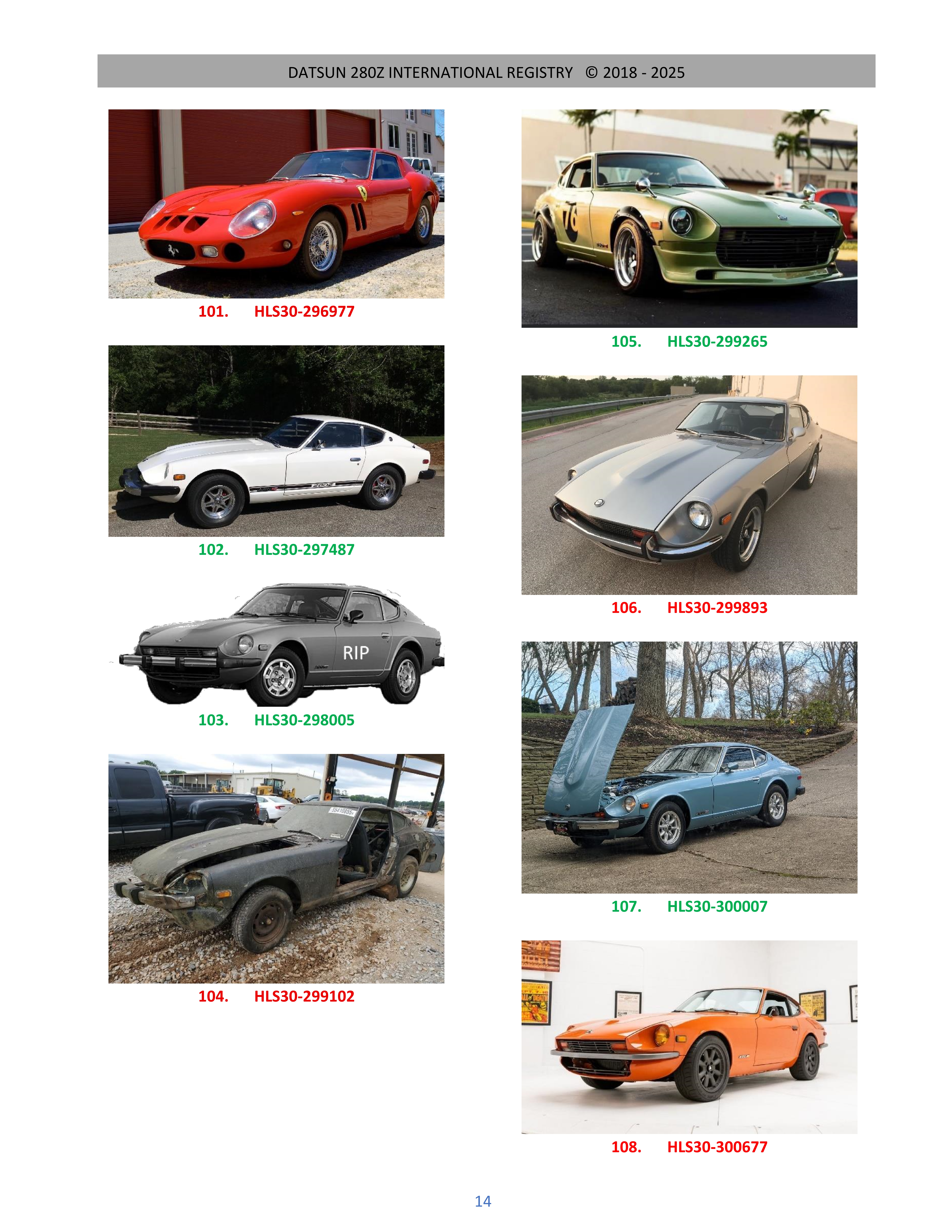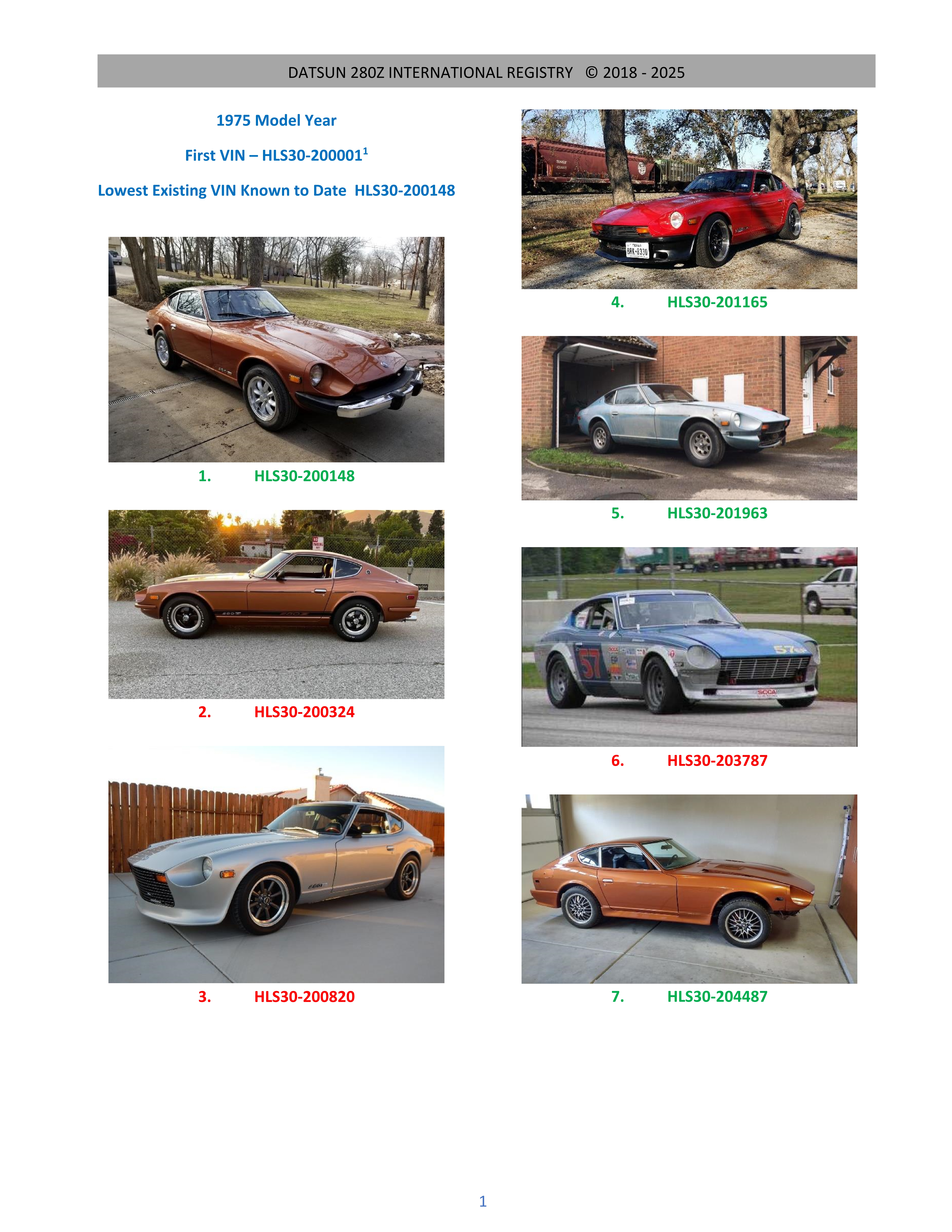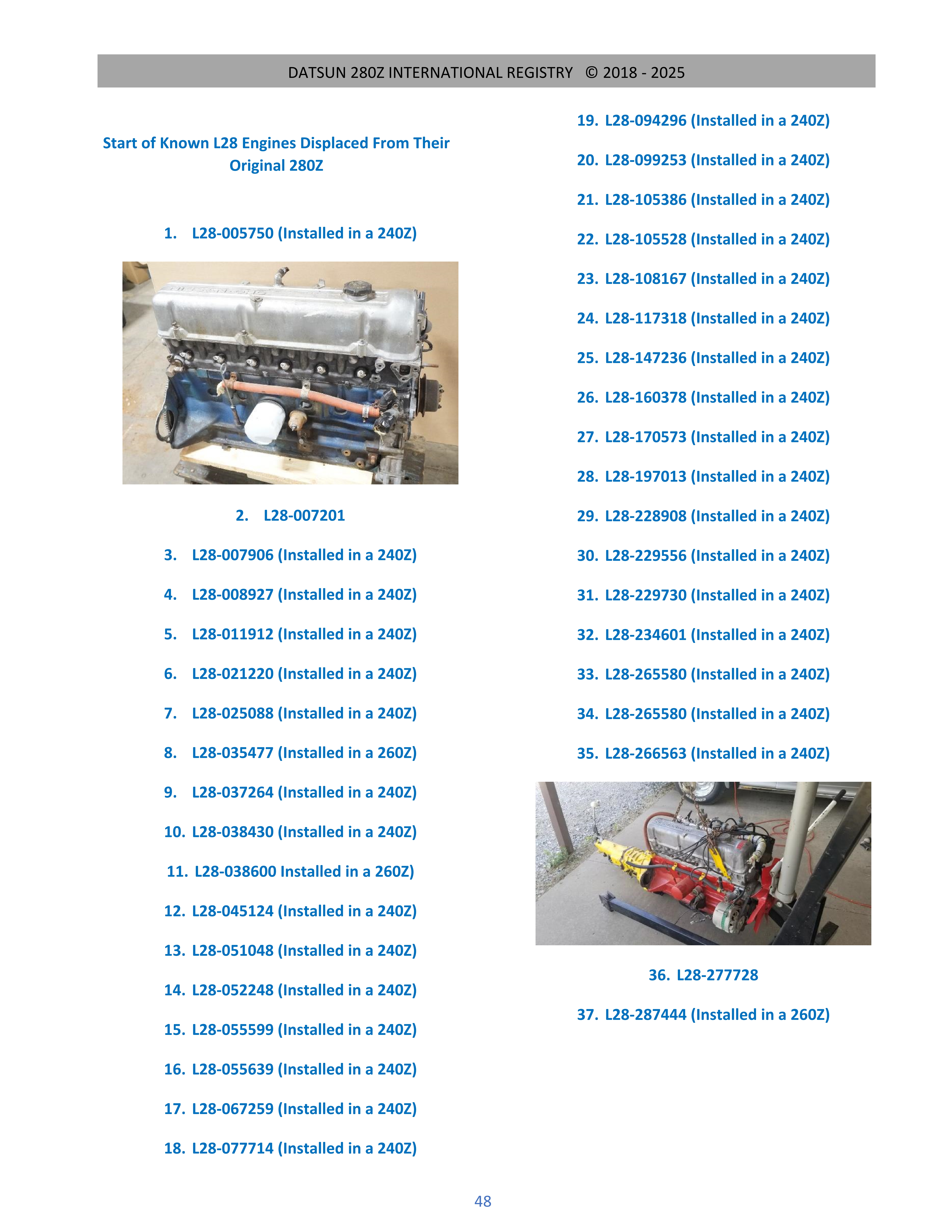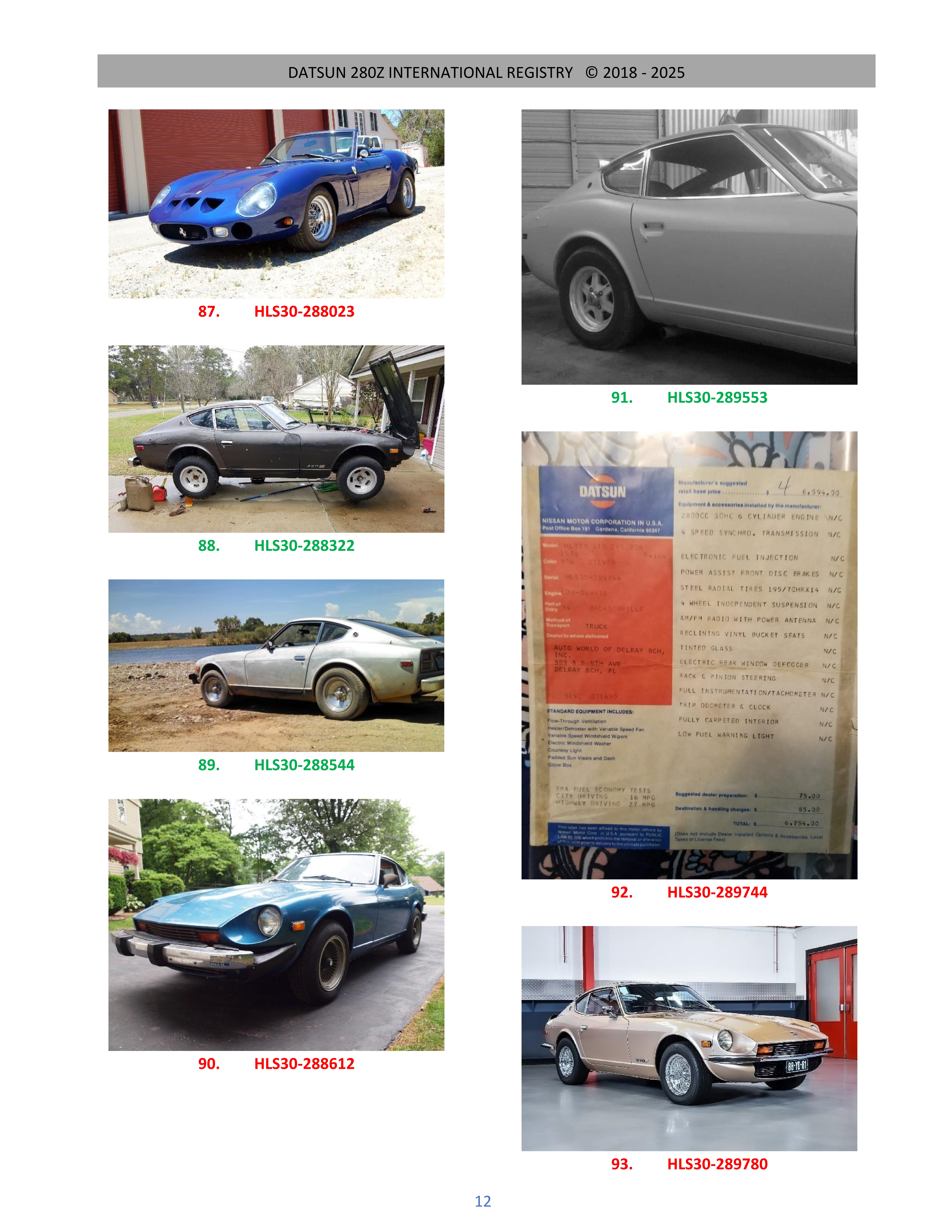 Over the past several years I have been building a database of all 280Zs that I know still exist or that I know their fate. Periodically I will be adding photos to show all of these 280Zs. I have now included GHLS30 models. So far, there are 49 pages worth, 363 cars. I have many more to post. 280Zs that are currently in the registry are listed with green VINs. 280Zs that are not registered are listed with red VINs. Zs that I don’t have a picture of will be shown with a 280Z emblem. I have also added L28 engines that are know to be displaced from their original 280Zs. There are 37 engines listed so far.